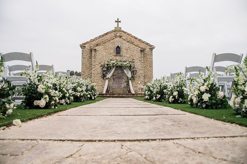 “The bride made her memorable walk with her dad down the floral-lined aisle leading to a stunning archway draped in lush white florals.”