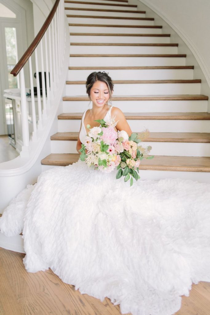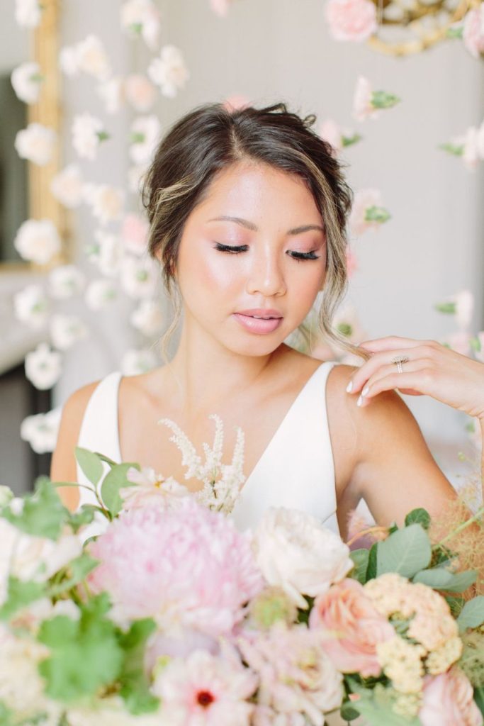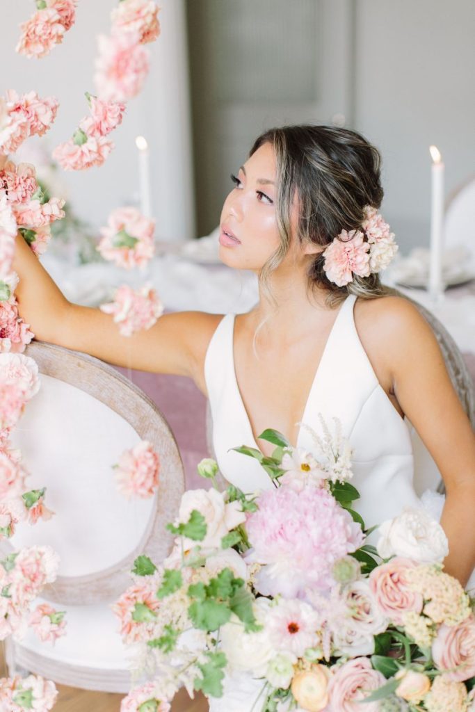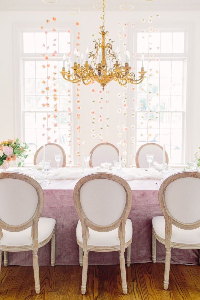 From the photographer: “The goal of the shoot was to bring to life a Parisian affair while being in the middle of downtown Houston. Our beautiful Vietnamese model, Brianna Nguyen, was the focal point of this luxe and lovely inspiration shoot. Her hair was tousled in a loose bun complete with peachy gardenias. The dress was from Unbridaled and had the same texture as the florals which tied together this whole vision. A large bloom installation hung parallel to the table settings which created a gorgeous cascade of floral. Mauve velvet linen from House of Hough Houston set the mood for the table while simple white dishware and gold flatware completed the look. The crystal glasses were a 3rd generation heirloom from the wedding planner, Britt Jones’s, great grandmother.”