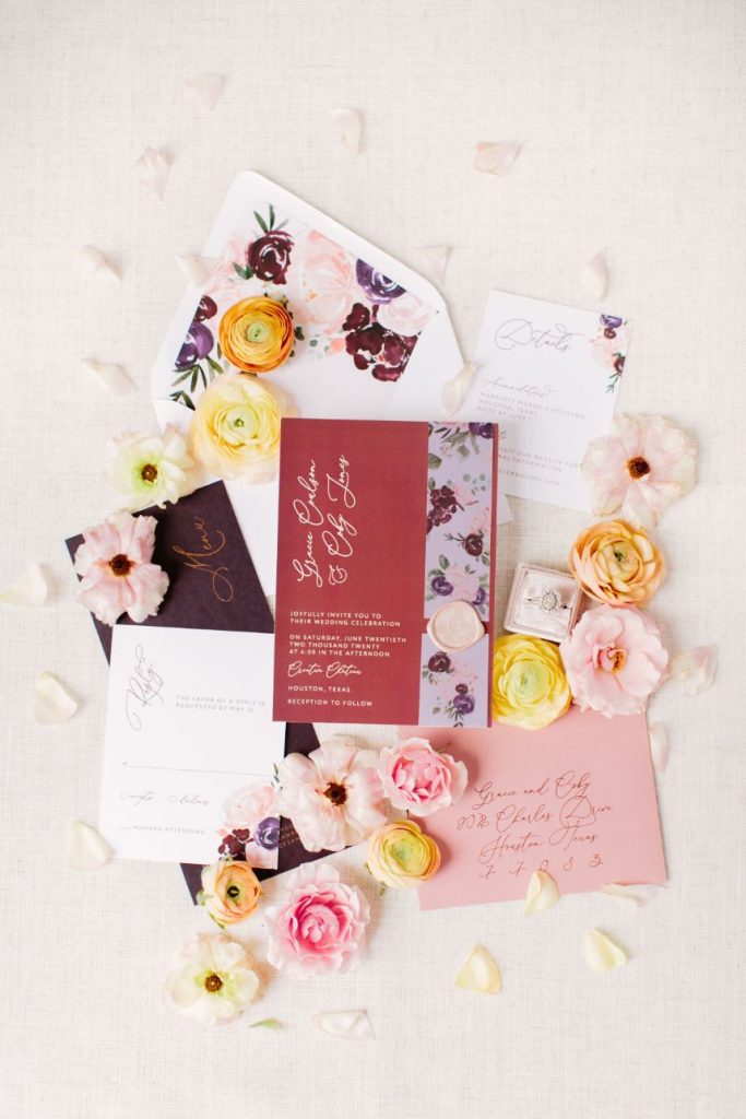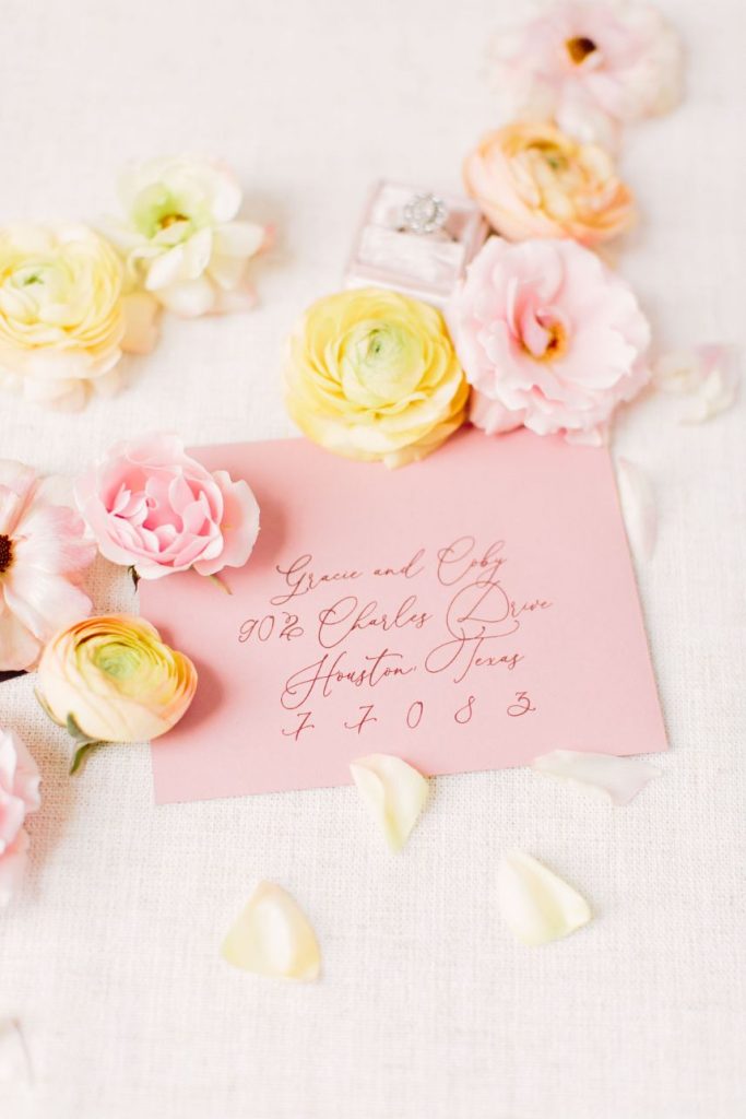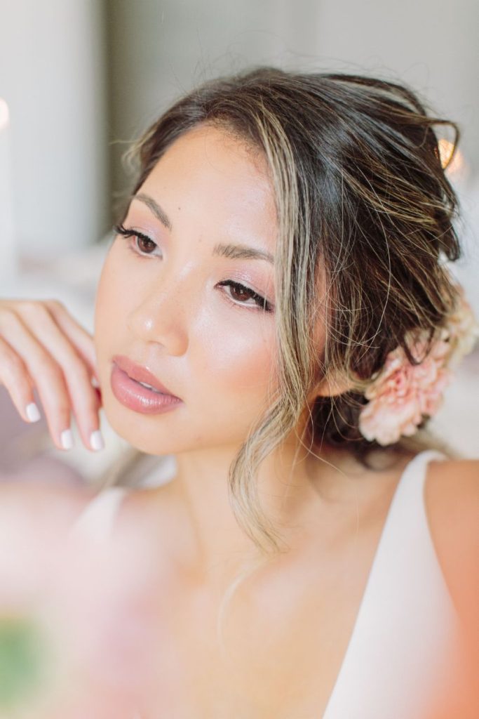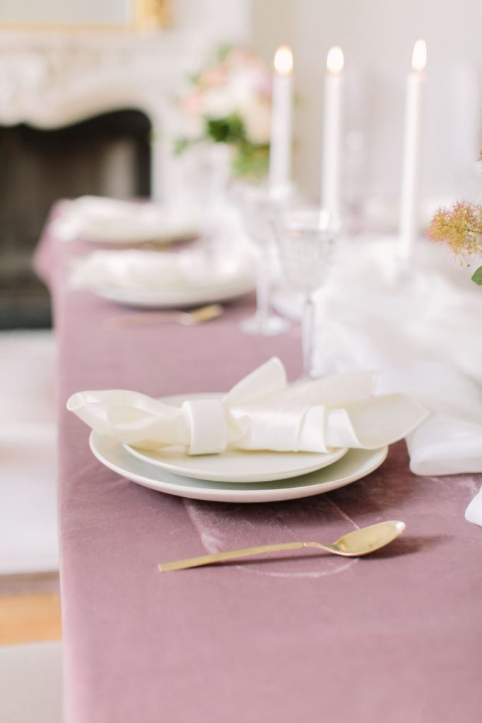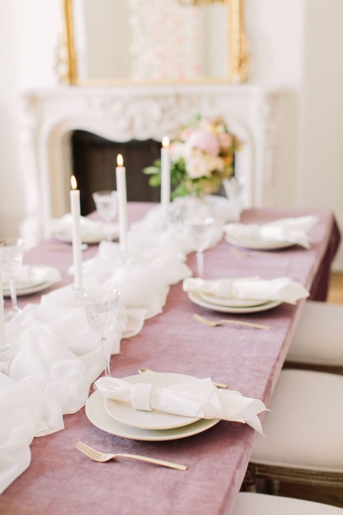 From the photographer: “The goal of the shoot was to bring to life a Parisian affair while being in the middle of downtown Houston. Our beautiful Vietnamese model, Brianna Nguyen, was the focal point of this luxe and lovely inspiration shoot. Her hair was tousled in a loose bun complete with peachy gardenias. The dress was from Unbridaled and had the same texture as the florals which tied together this whole vision. A large bloom installation hung parallel to the table settings which created a gorgeous cascade of floral. Mauve velvet linen from House of Hough Houston set the mood for the table while simple white dishware and gold flatware completed the look. The crystal glasses were a 3rd generation heirloom from the wedding planner, Britt Jones’s, great grandmother.”