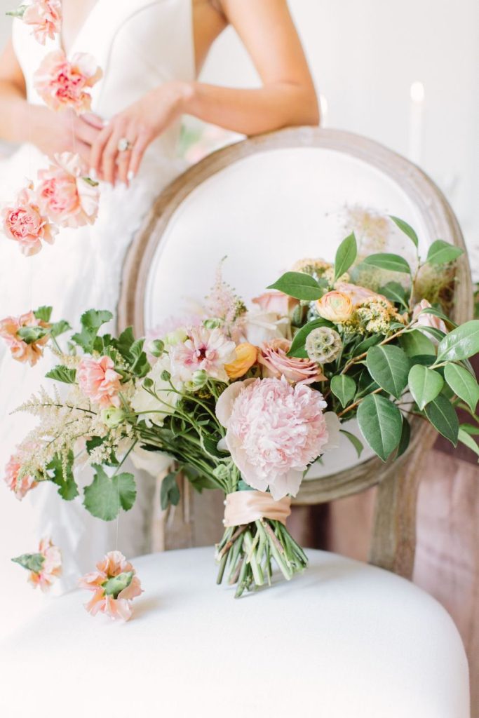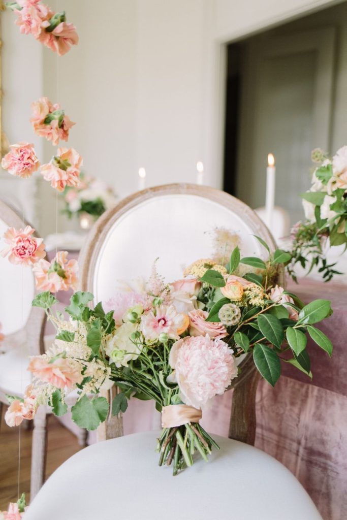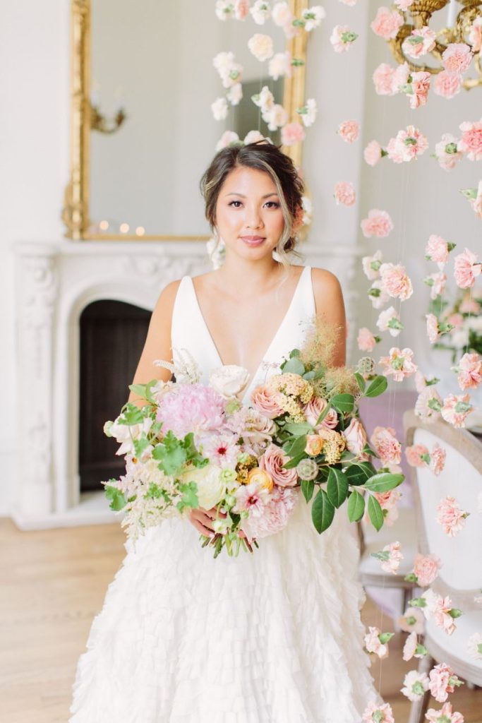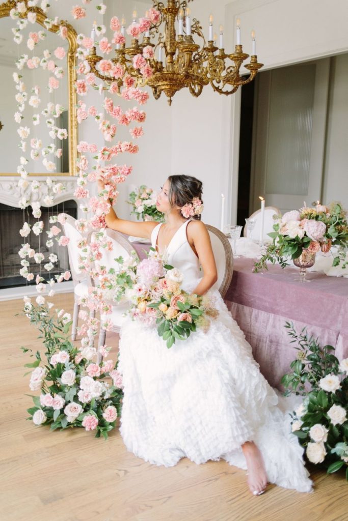 Captured by Mustard Seed Photography, this Parisian wedding inspiration truly came to life when combined with all the most gorgeous elements! There was a noticeable air of elegance within this styled shoot held at The Creative Chateau, and we are loving it. A jaw-dropping hand-crafted invitation suite from Paper Tie Affair set the mood for these bright and fresh wedding scenes. This model looked so stunning in a textured, floral gown from Unbridaled – the artistry doesn’t end there, though! She was also styled with a loose, tousled updo as well as radiant, glowy mauve makeup look created by Sunkissed and Made Up! We want a slice of this delicious-looking three-tiered treat from Cakes by Gina that was accented and surrounded by suspended floral arrangements from The Tallest Tulip. We’re seriously crushing on every aspect of this fresh, Parisian wedding inspiration! Read on to hear a word from the photographer, Mustard Seed Photography, about the vision behind the planning and design of this stunning styled shoot. Cheers!