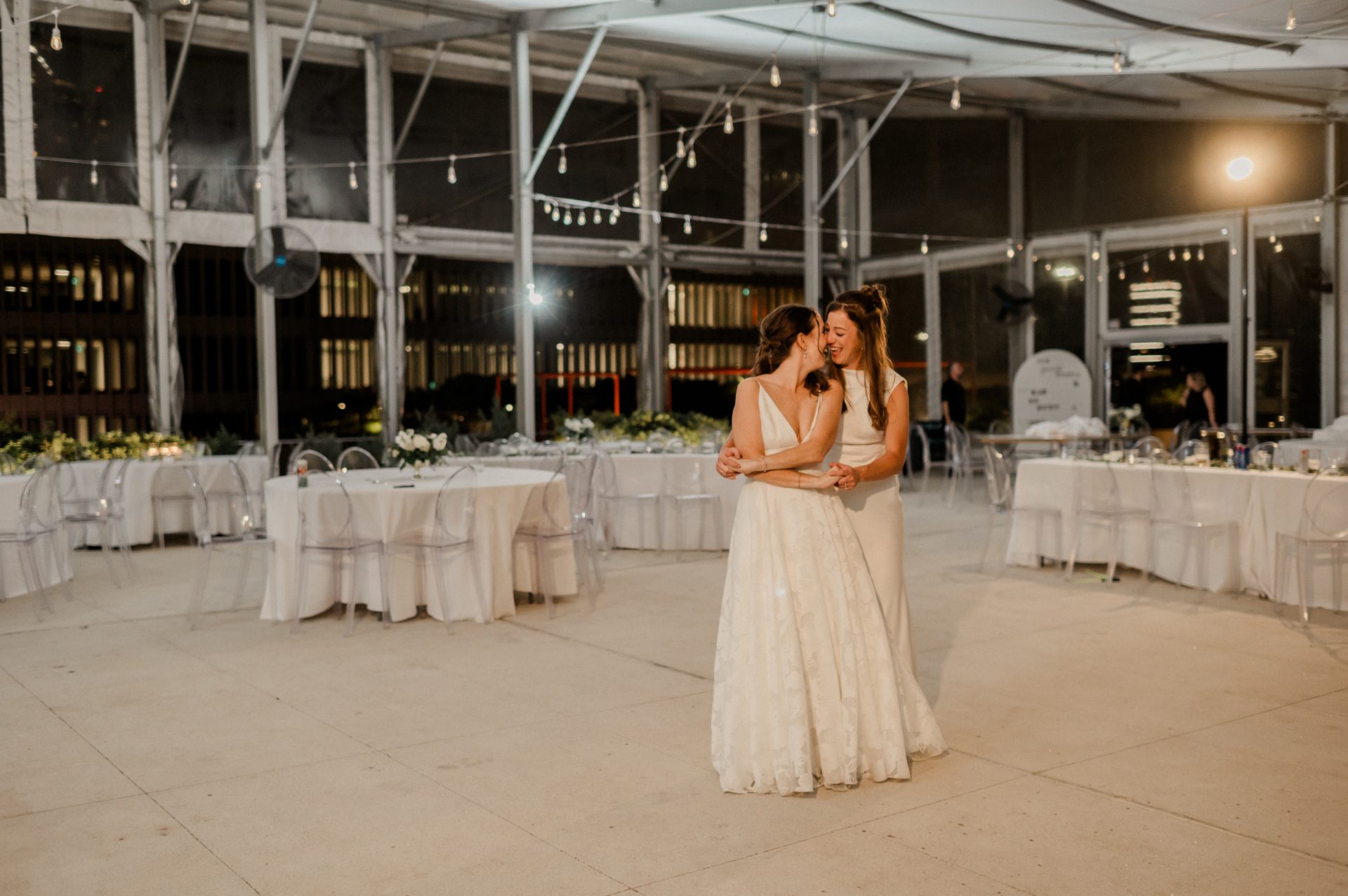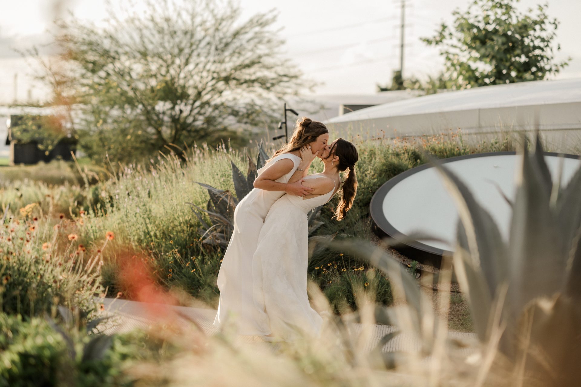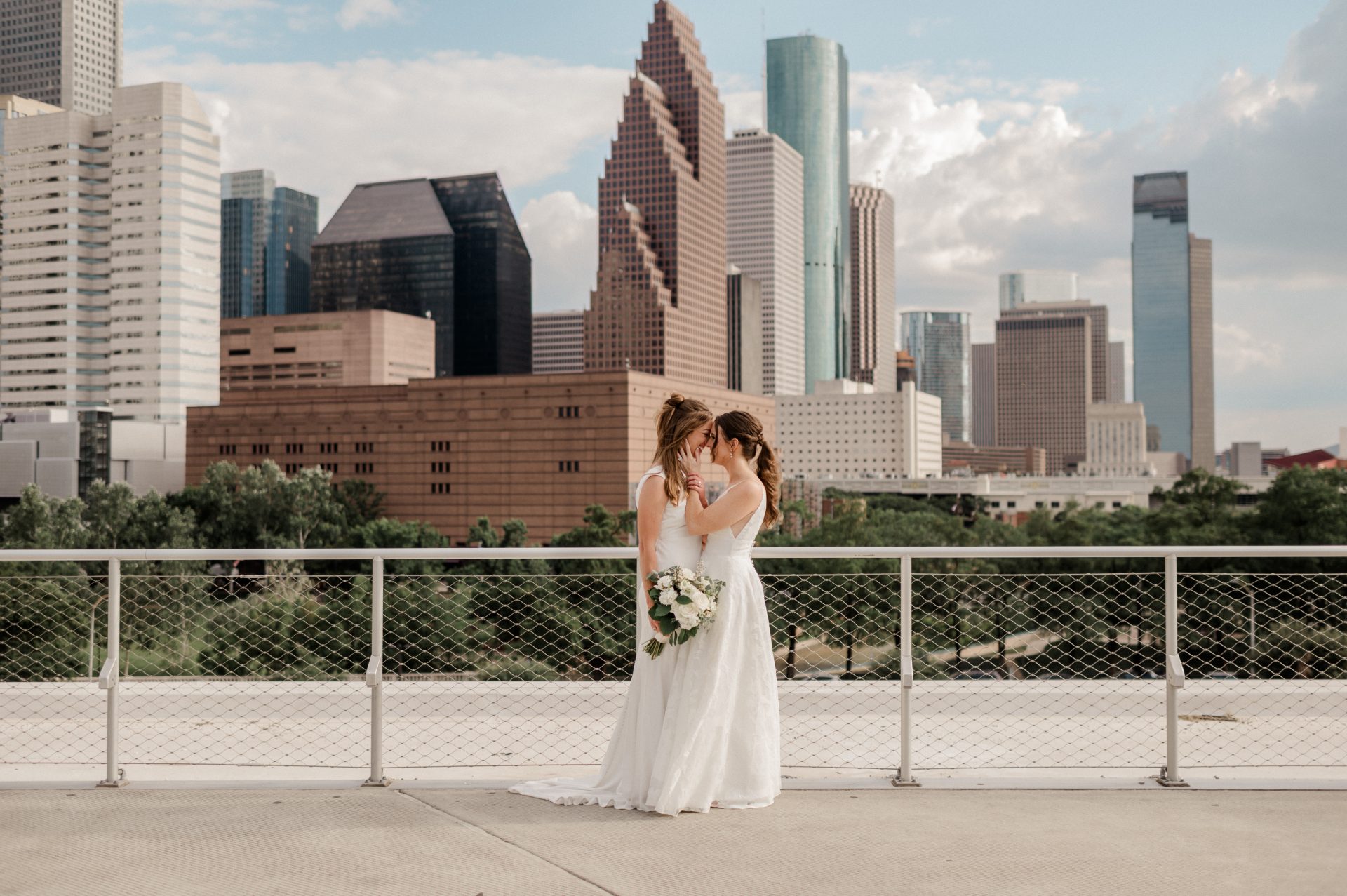Karisa and Taylor’s journey to “I do” began on our spectacular Skylawn, where they exchanged vows against the most incredible backdrop imaginable: the glistening, sprawling panorama of the downtown Houston skyline. The late afternoon sun cast a warm glow as their guests gathered, eagerly awaiting the moment Karisa and Taylor would become wives. The Skylawn itself, with its expansive downtown views stretching to the horizon and minimalist yet elegant floral arrangements, created a serene and modern altar, drawing every eye to the city’s iconic architecture reaching towards the sky. It was a truly magical setting, filled with love and surrounded by the vibrant energy of the city, perfectly captured as they held hands and exchanged vows.