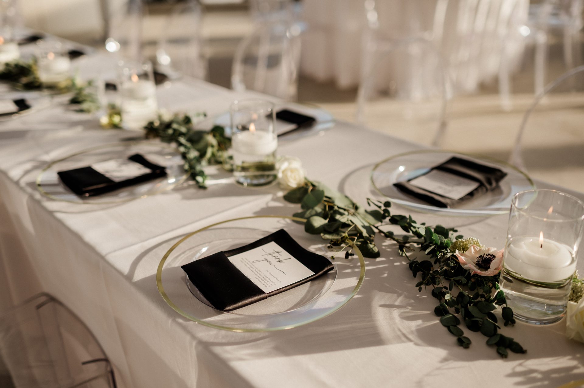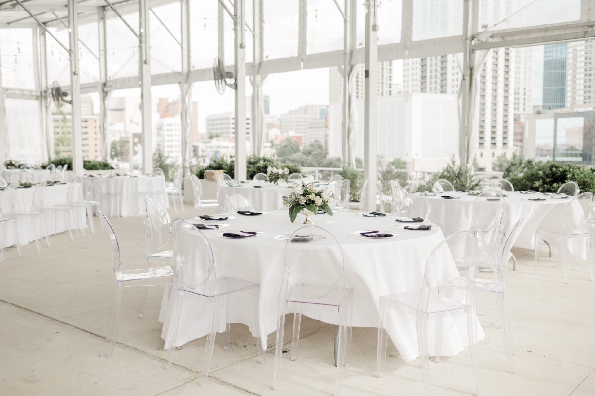 The celebration continued with a spectacular reception at Outpost, one of POST Houston’s dynamic event spaces. The transformation of Outpost for Karisa and Taylor’s wedding was simply stunning! The space was thoughtfully laid out using our in-house furniture, including elegant 72-inch round tables and 6-foot banquet tables, all draped in crisp white linens. Our clear acrylic ghost chairs added a touch of modern sophistication, creating an airy and open feel. The couple chose exquisite linens that perfectly complemented their vision, adding touches of greenery to the tables for a fresh and elegant look.