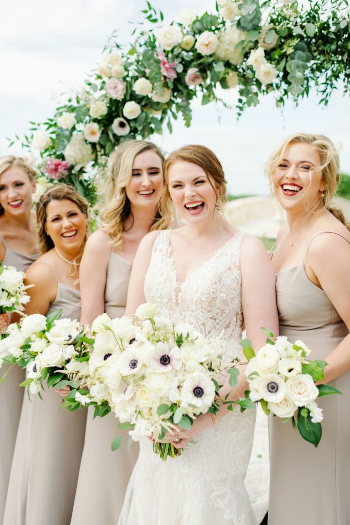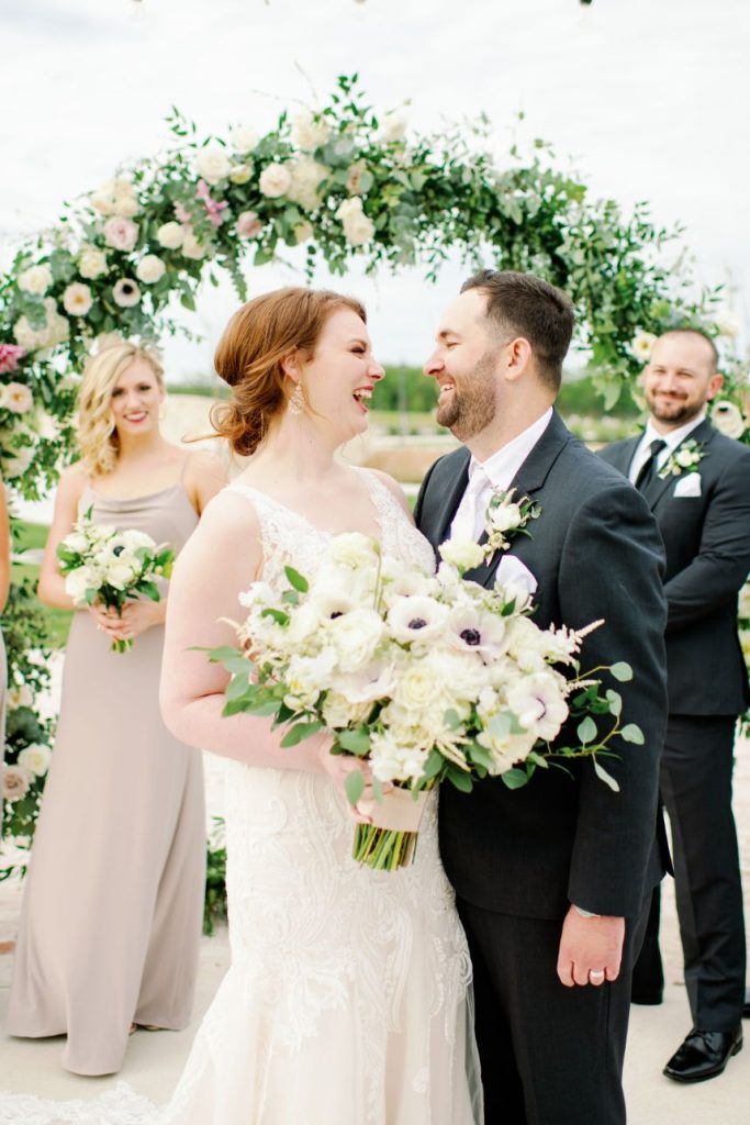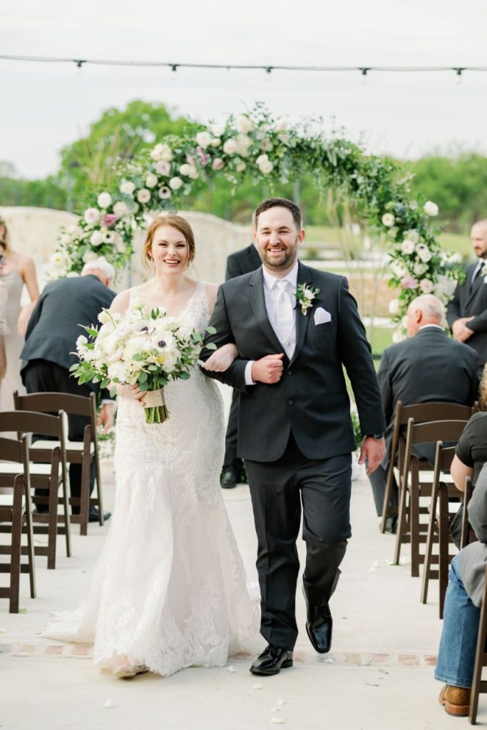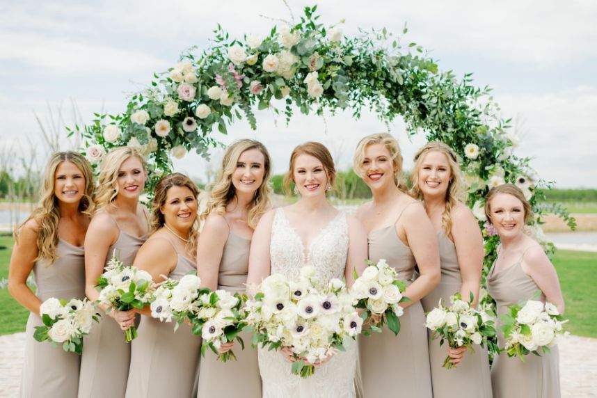 Rachel and Kevin said, “I do,” on a gorgeous April day. A reunion of friends and getting ready with Sunny Hair and Makeup Artistry filled the morning of their big day . Rachel looked stunning with an effortless hair makeup look that paired beautifully with her gown from Brickhouse Bridal. In addition, Rachel’s bridesmaids also made a gorgeous statement with their champagne gowns from Brickhouse Bridal. After many answered prayers, Rachel and Kevin were able to have their perfect outdoor ceremony. Unforgettable Floral made Rachel’s floral dreams come to life with a ceremony arch and bouquets of blooming poppies. At the reception, Party Time Rentals provided classic and timeless rentals to create an elegant soirée. The magical night entailed food, dancing, and of course, the Aggie War Hymn before the couple made their grand sparkler exit from Broadway Bridal. There are so many more beautiful details that Kati Hewitt Photography captured that you don’t want to miss! So keep scrolling.