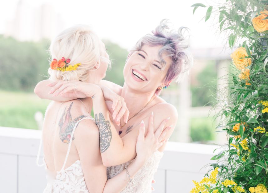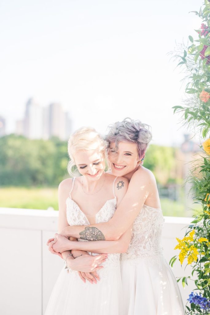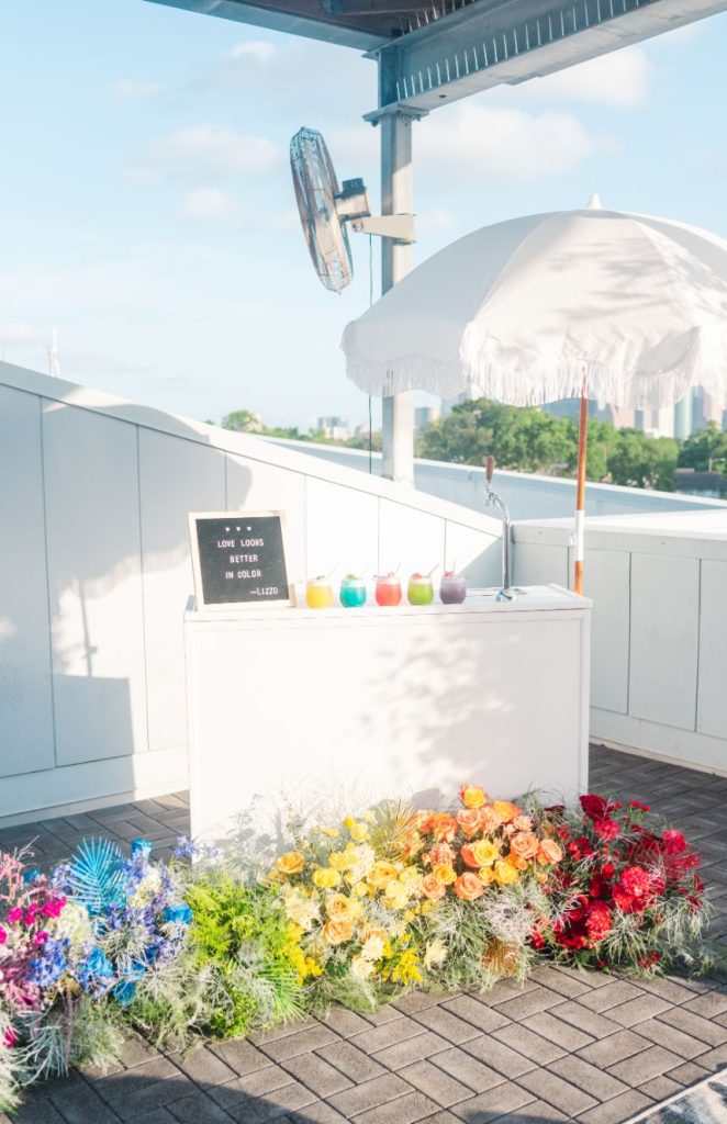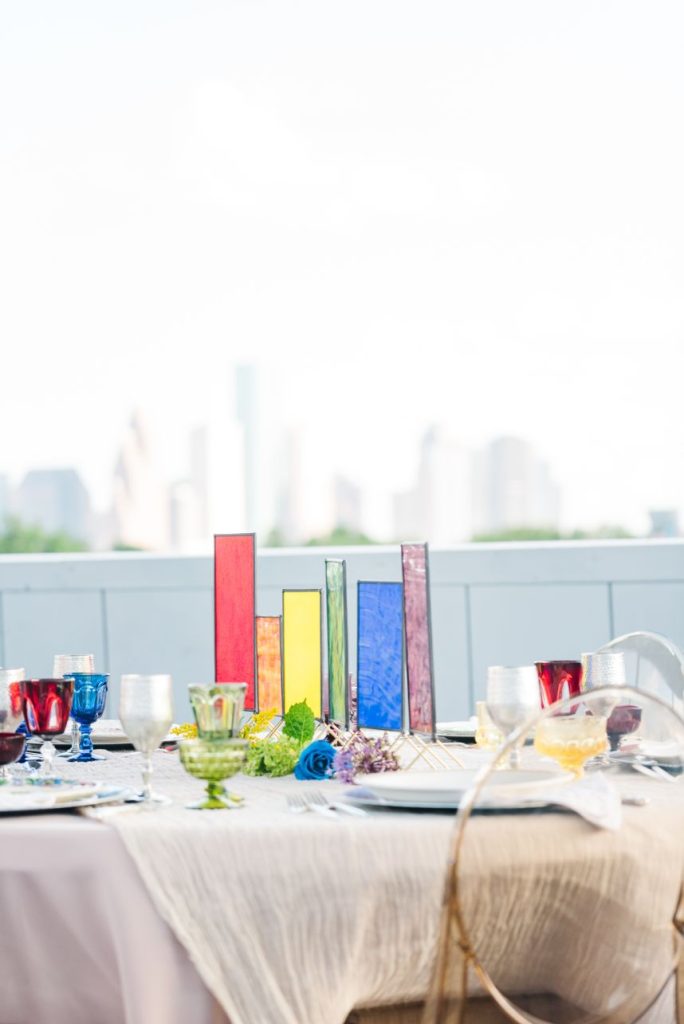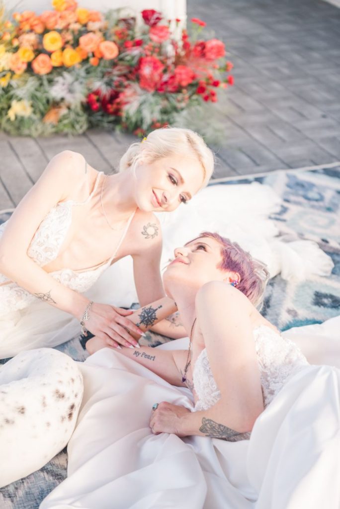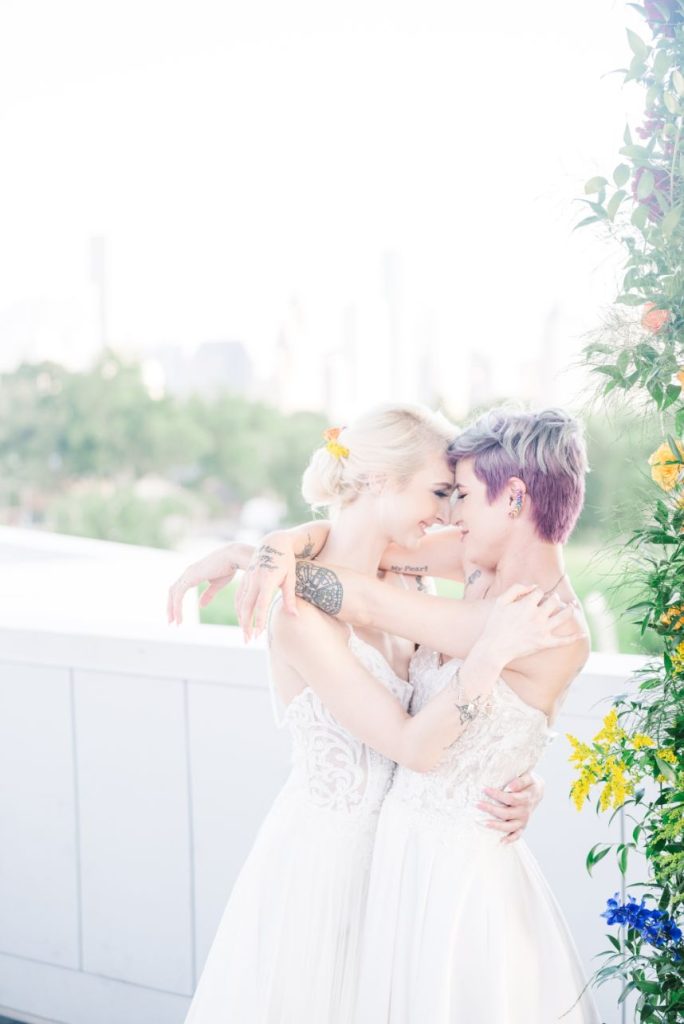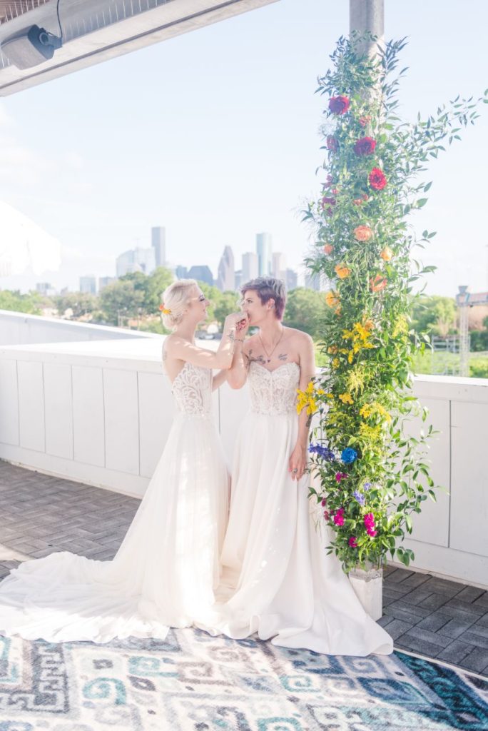 Perfectly suited for couples of all kinds, this rainbow wedding inspiration planned and coordinated by Moonstruck Events was so romantic and its vibrant, cheerful color palette was simply made for the sunny day it took place on. Our beautiful brides look so giddy to say “I do” in similar styles of lace-bodice bridal gowns from EVOKE: the bridal experience that flow with their every move. A tower of rainbow desserts from Alchemy Bake Lab look delectable in lieu of a formal wedding cake and we love their placement next to a mosaic patterned mirror embellished with a little calligraphy as well. Custom stained glass just for the occasion adds an artful centerpiece to tablescapes without crowding your guests with florals. Plus, the less that go on the table means more for this gorgeous color gradient floral installation that looks to be growing right out of the bricks in front of the bar – stocked with fresh rainbow ‘ritas and a letter board with a sweet quote by Lizzo. Love looks SO much better in color and this rainbow wedding inspiration is perfect proof of that. Obsess over it with us down below. Cheers!