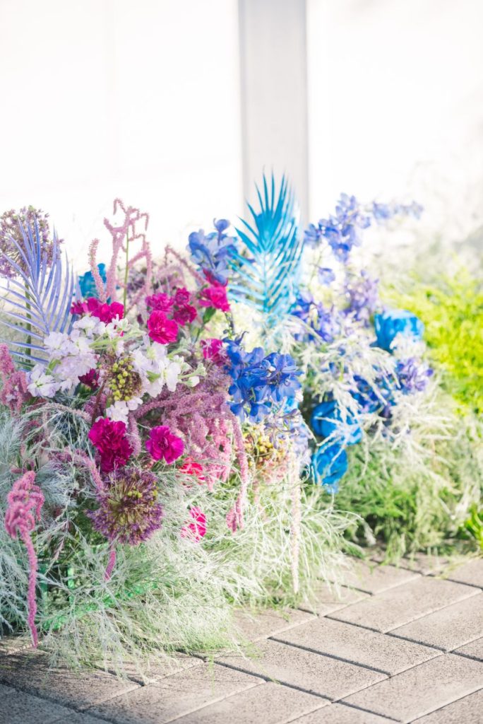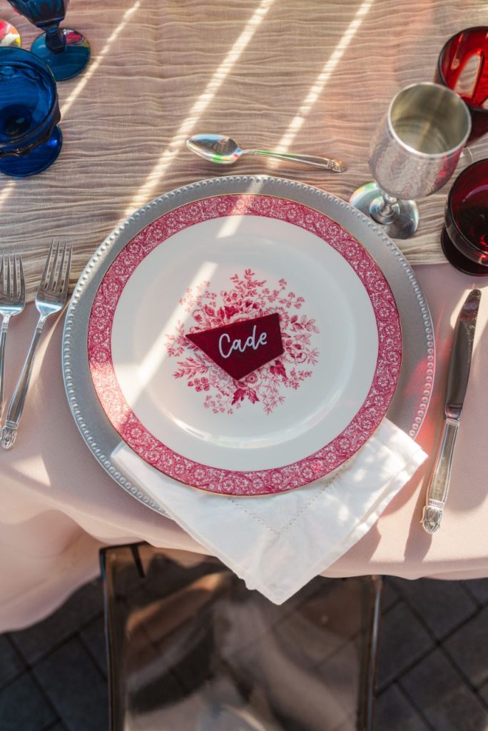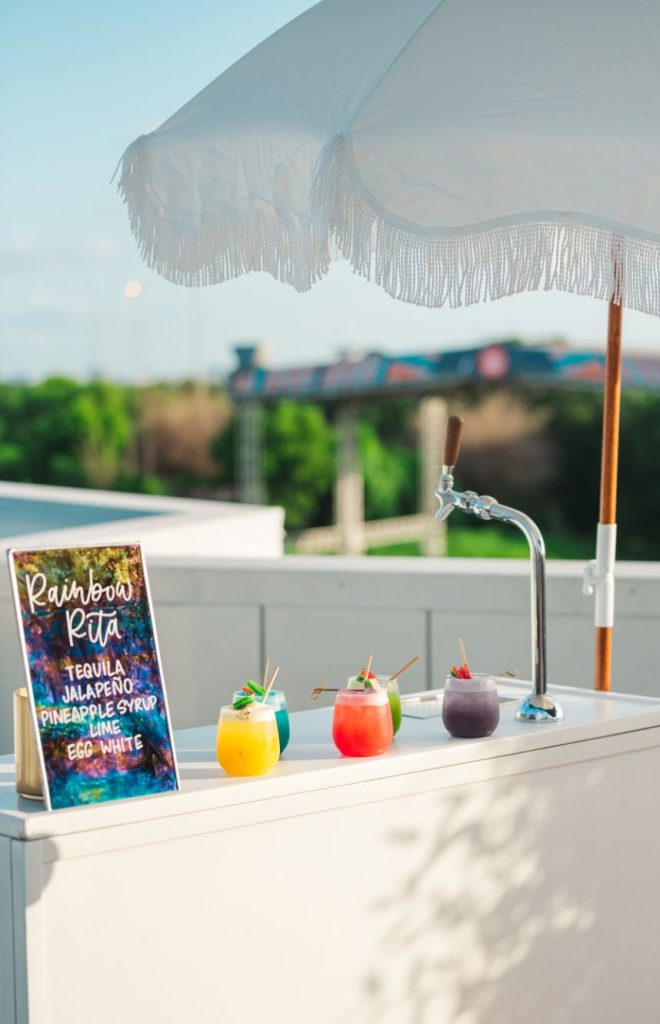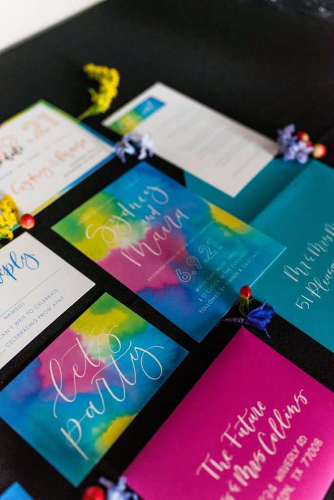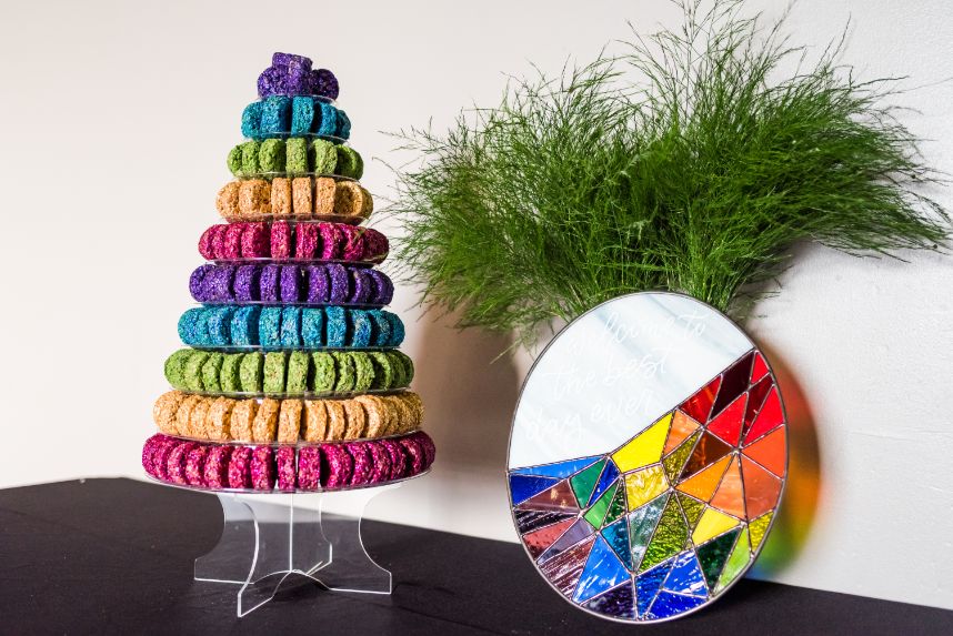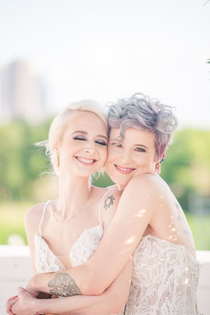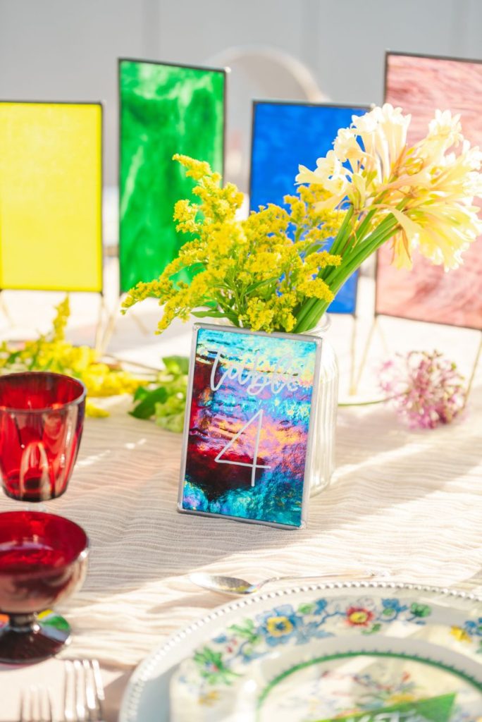 Perfectly suited for couples of all kinds, this rainbow wedding inspiration planned and coordinated by Moonstruck Events was so romantic and its vibrant, cheerful color palette was simply made for the sunny day it took place on. Our beautiful brides look so giddy to say “I do” in similar styles of lace-bodice bridal gowns from EVOKE: the bridal experience that flow with their every move. A tower of rainbow desserts from Alchemy Bake Lab look delectable in lieu of a formal wedding cake and we love their placement next to a mosaic patterned mirror embellished with a little calligraphy as well. Custom stained glass just for the occasion adds an artful centerpiece to tablescapes without crowding your guests with florals. Plus, the less that go on the table means more for this gorgeous color gradient floral installation that looks to be growing right out of the bricks in front of the bar – stocked with fresh rainbow ‘ritas and a letter board with a sweet quote by Lizzo. Love looks SO much better in color and this rainbow wedding inspiration is perfect proof of that. Obsess over it with us down below. Cheers!