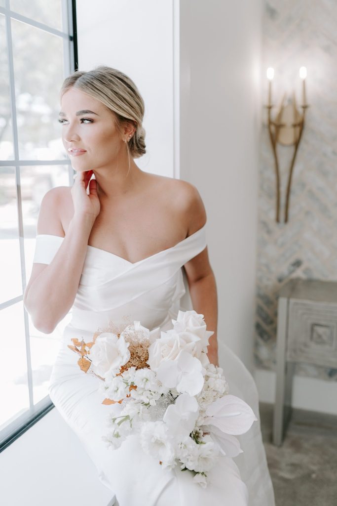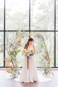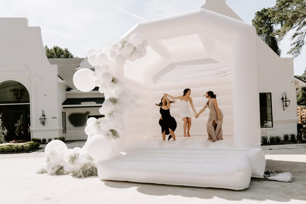 From the photographer, Erika Geier Photography: “The amazing team of vendors came together to make one spectacular editorial at The Peach Orchard. We are loving the black accents and white florals from this session. The gowns from Estelle Bridal were stunning. The whole shot was dreamy and the bridesmaids loved the bouncy house.”
