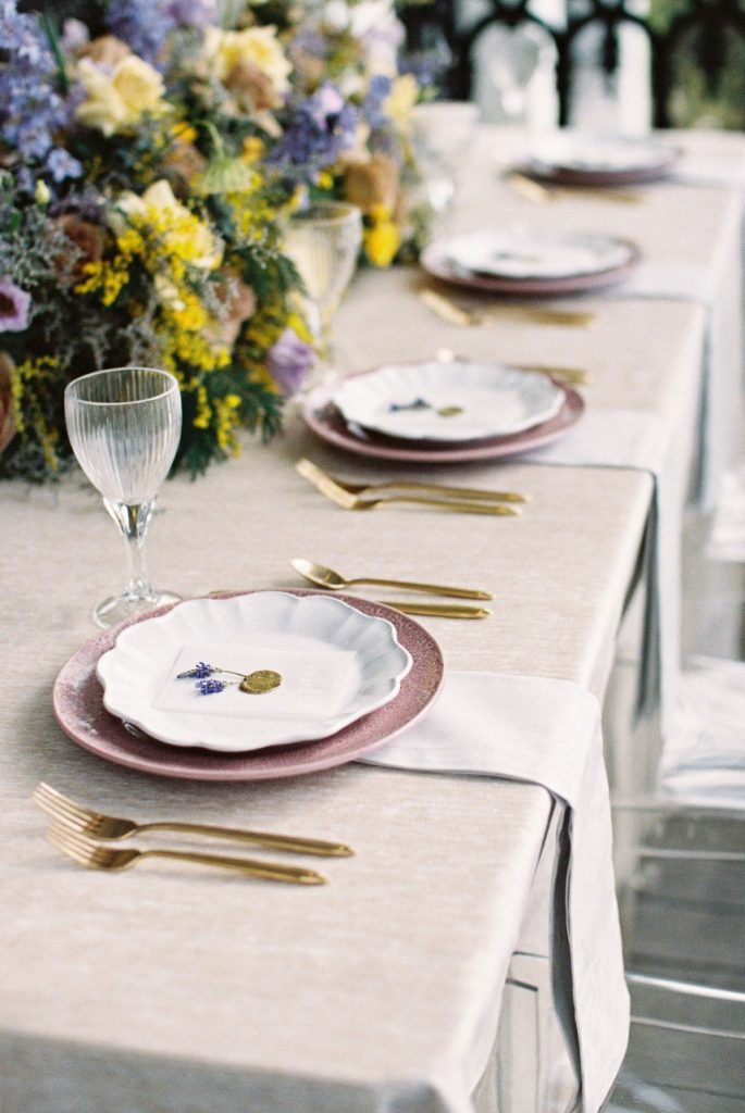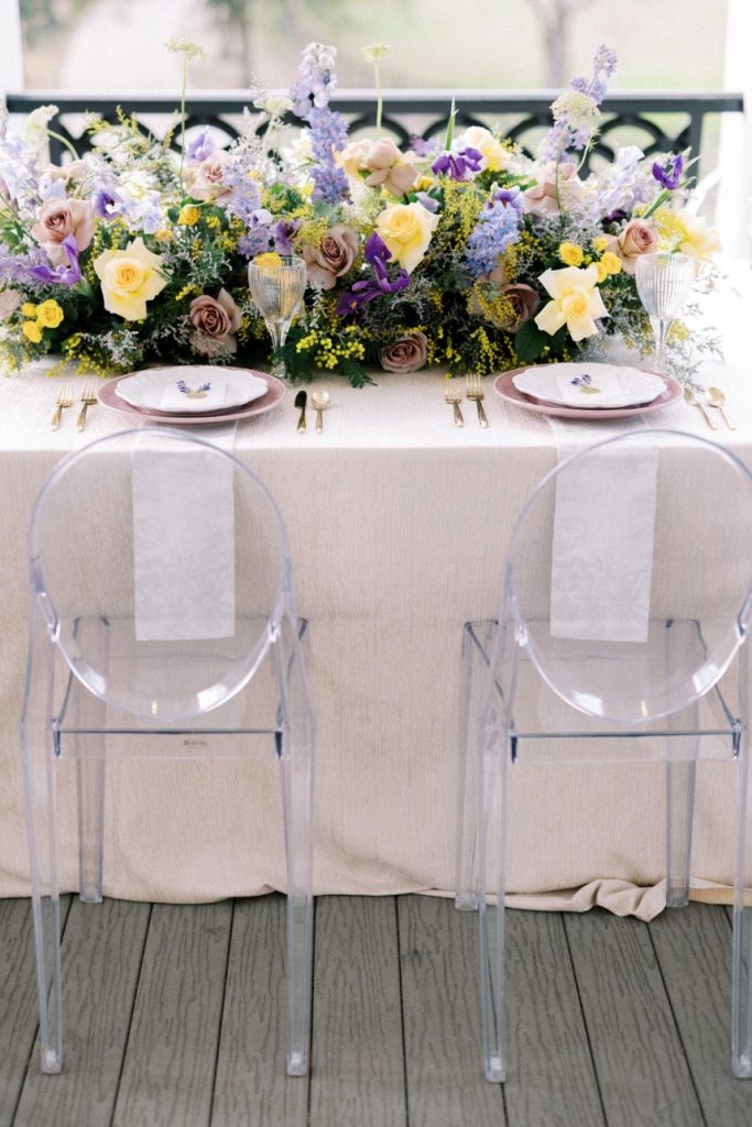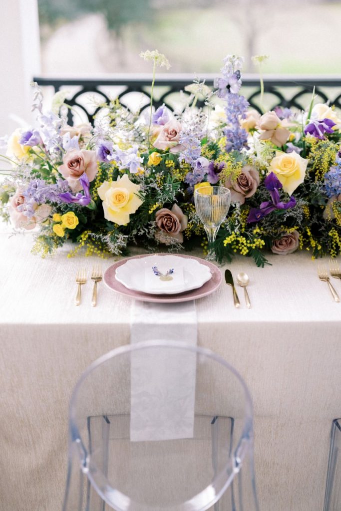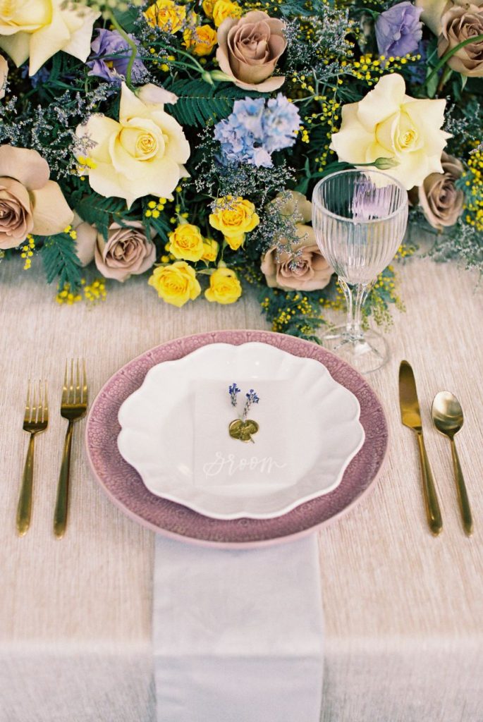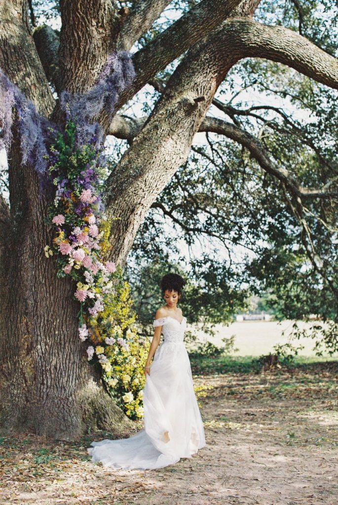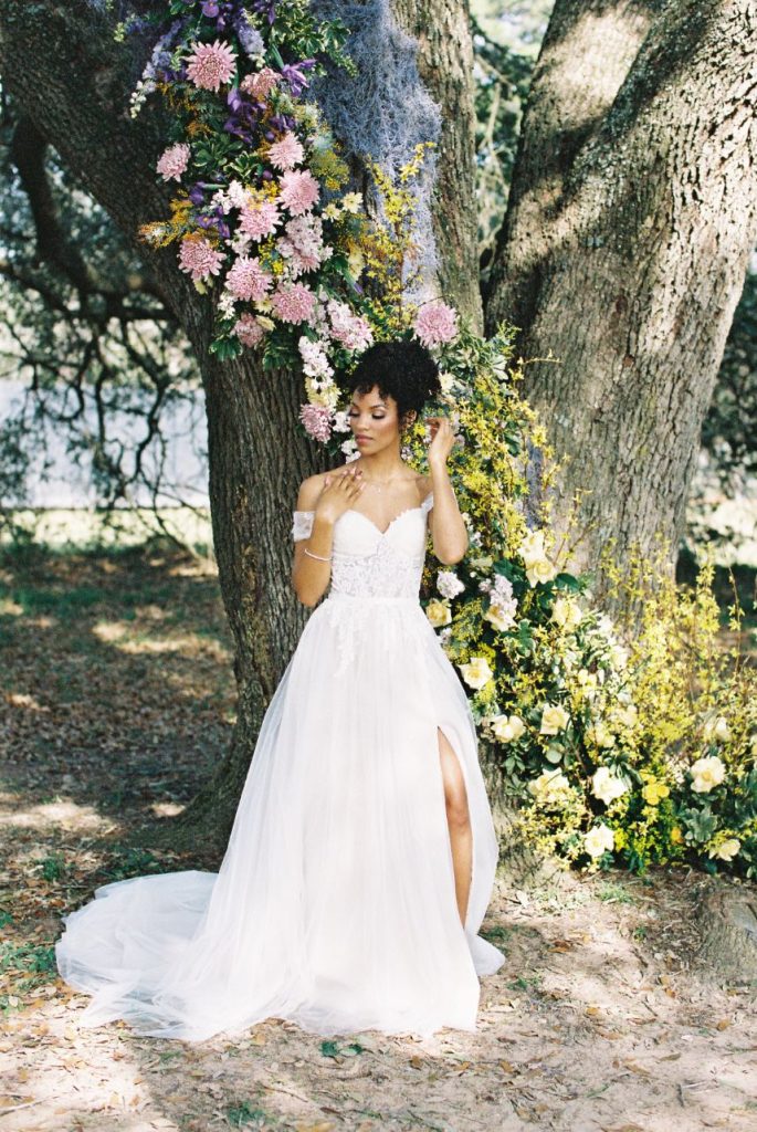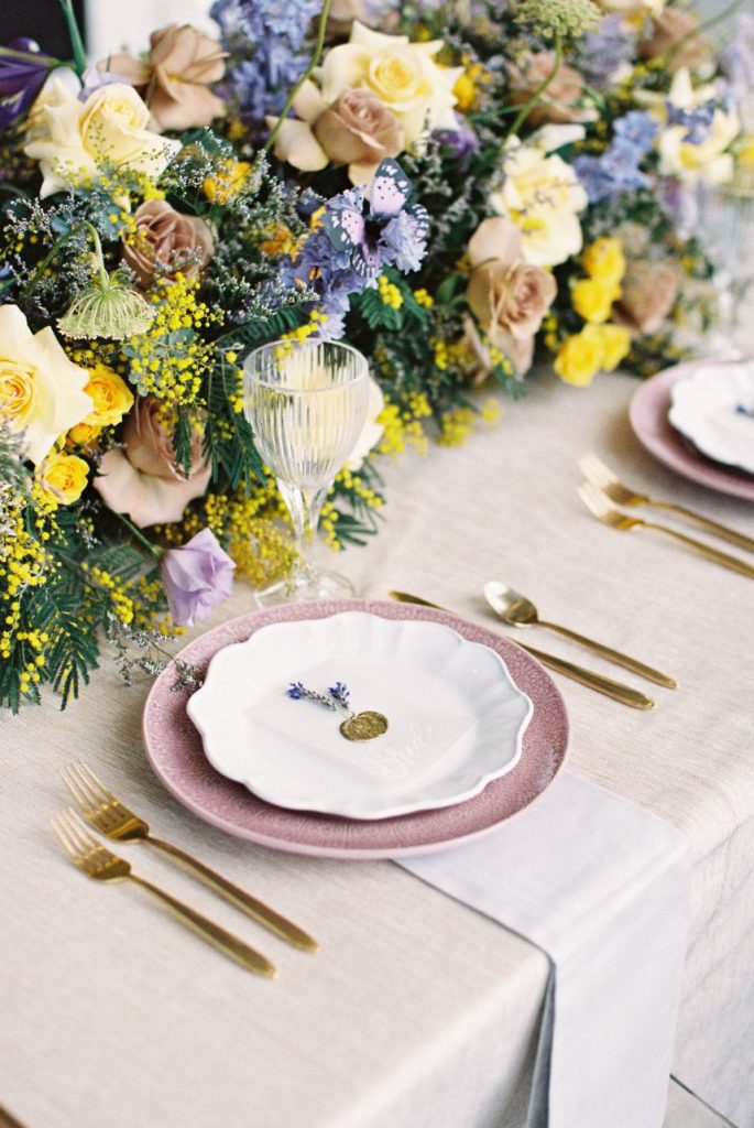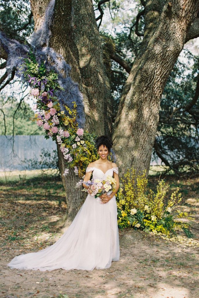 This regal wedding inspiration brings a bright and whimsical palette to refined and high-fashion design for a truly breathtaking outdoor affair captured in airy shots by Megan Kay Photography. A magical ceremony scene sets the tone for a simply lovely soiree where our beautiful bride was styled by Butter Artistry with an elegant updo and romantic, soft glam makeup for a flawless finish. She models in front of a huge romantic tree covered in creeping florals of lavender, baby blue, blush and bright yellow petals from Cali and Bloom that carry a chic, fine art feel. A flower-filled tablescape was styled to coordinate and a myriad of blooms create luxe al fresco dining vibes with fine china and flatware. Suited best for spring and summer months, we’re obsessed with the way this regal wedding inspiration combines refined with whimsical! Keep scrolling to see the stunning details of this styled shoot for yourself down below. Cheers!