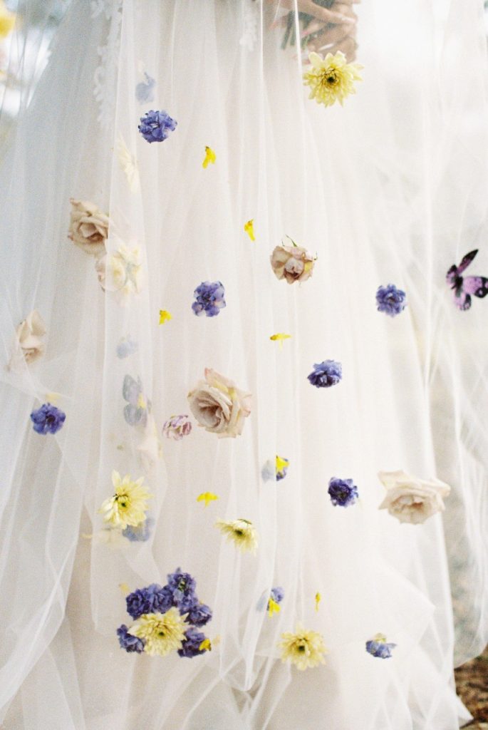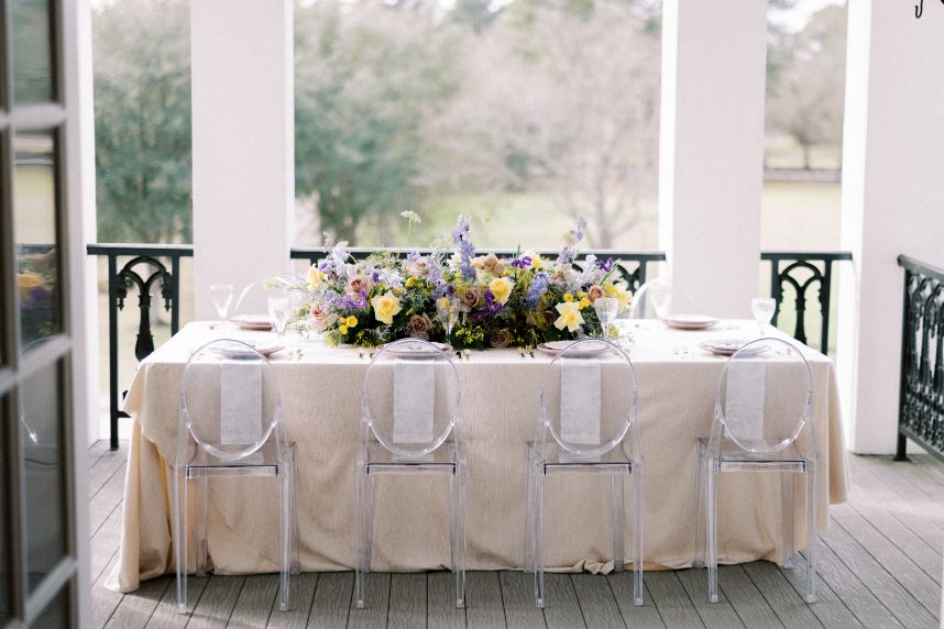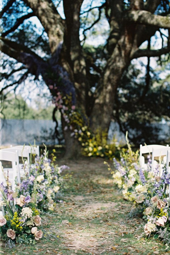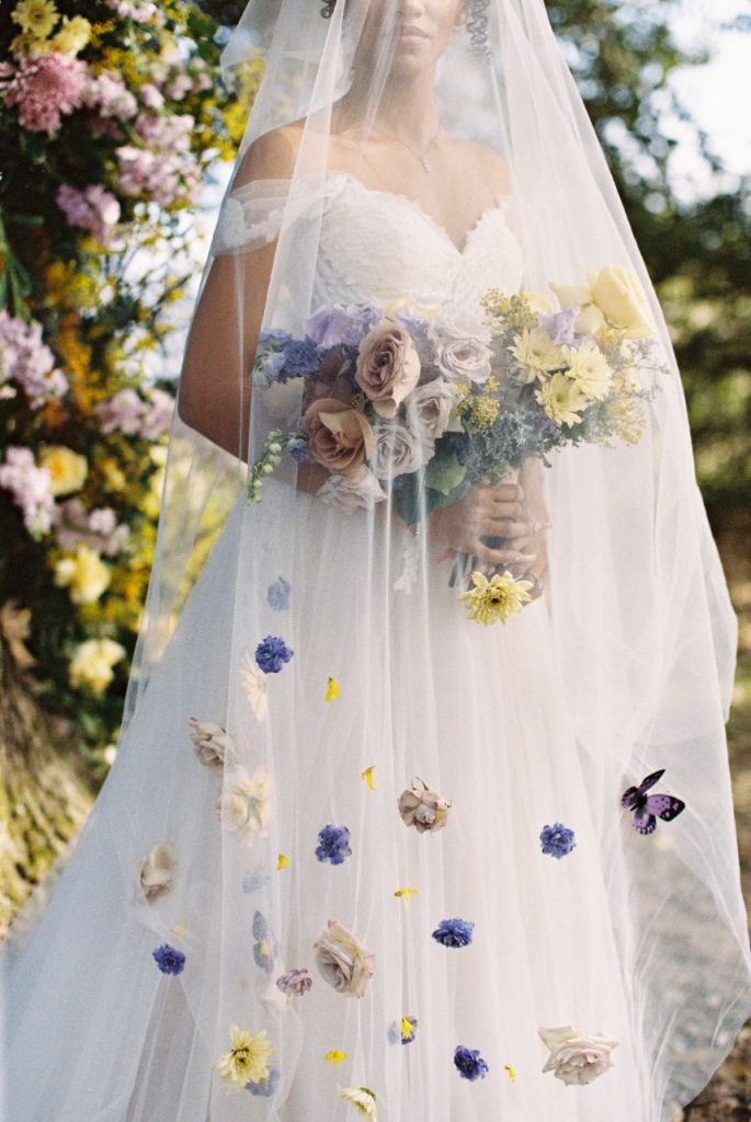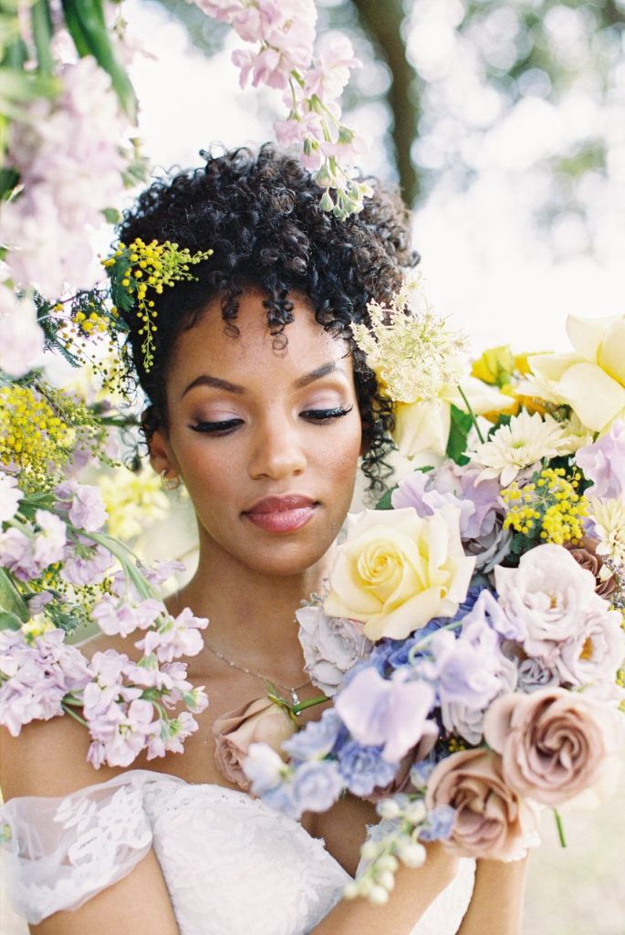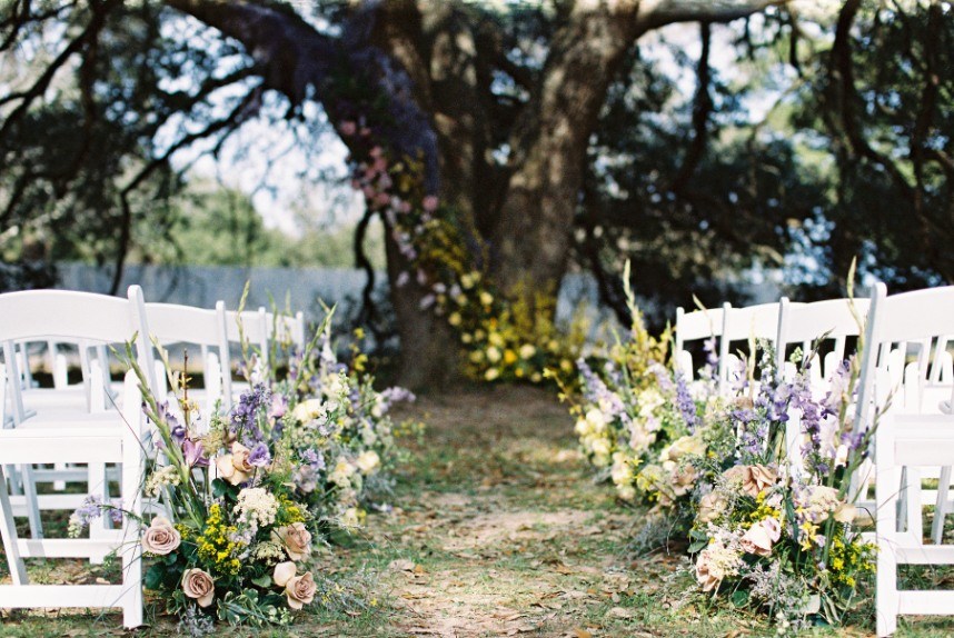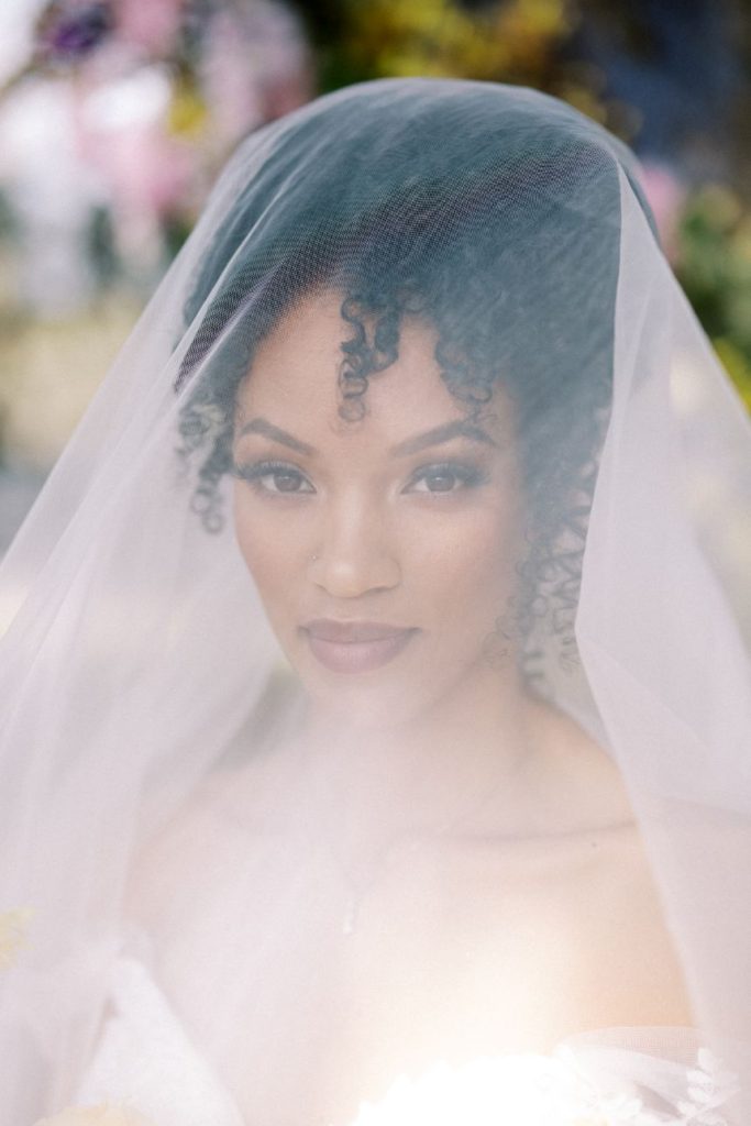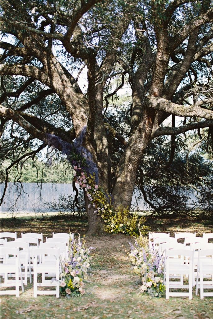This regal wedding inspiration brings a bright and whimsical palette to refined and high-fashion design for a truly breathtaking outdoor affair captured in airy shots by Megan Kay Photography. A magical ceremony scene sets the tone for a simply lovely soiree where our beautiful bride was styled by Butter Artistry with an elegant updo and romantic, soft glam makeup for a flawless finish. She models in front of a huge romantic tree covered in creeping florals of lavender, baby blue, blush and bright yellow petals from Cali and Bloom that carry a chic, fine art feel. A flower-filled tablescape was styled to coordinate and a myriad of blooms create luxe al fresco dining vibes with fine china and flatware. Suited best for spring and summer months, we’re obsessed with the way this regal wedding inspiration combines refined with whimsical! Keep scrolling to see the stunning details of this styled shoot for yourself down below. Cheers!