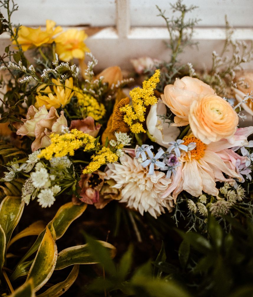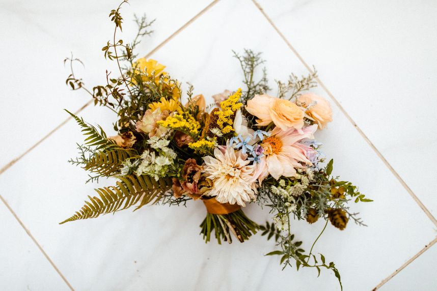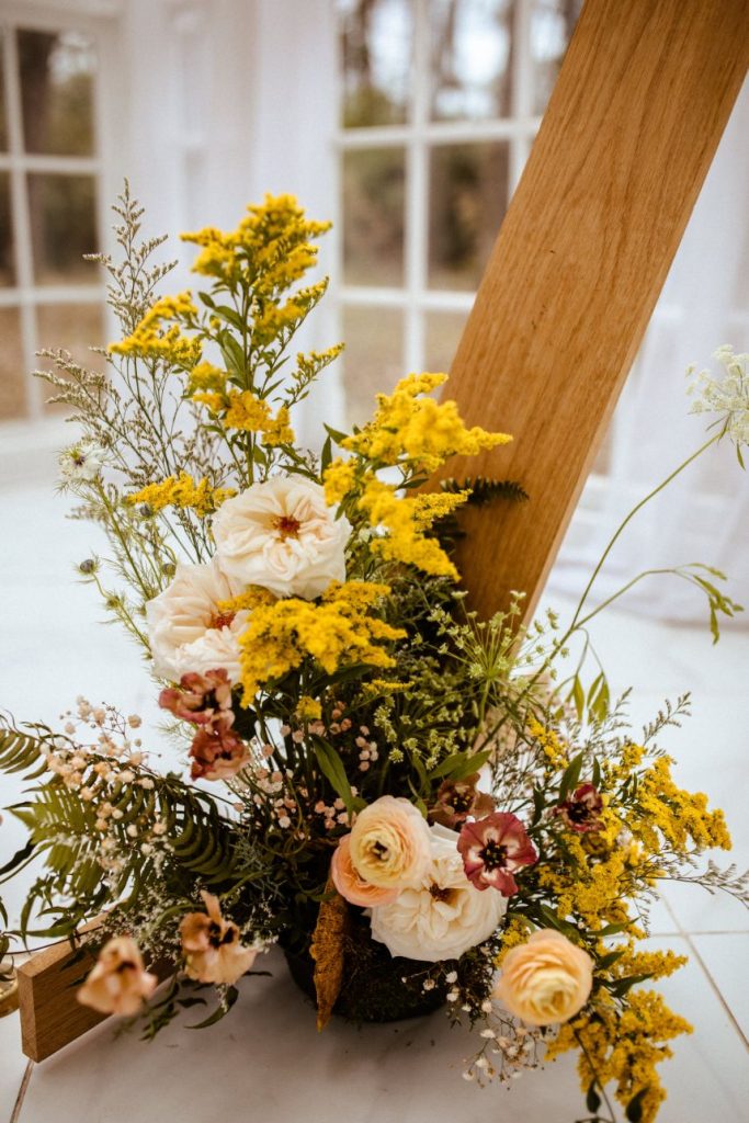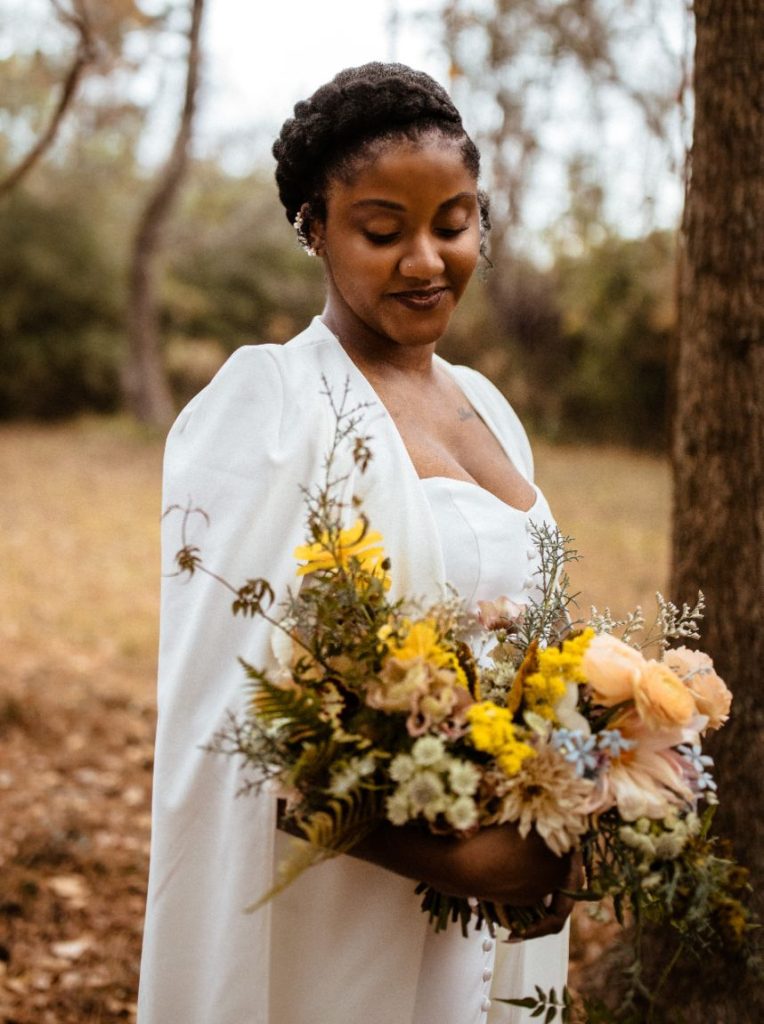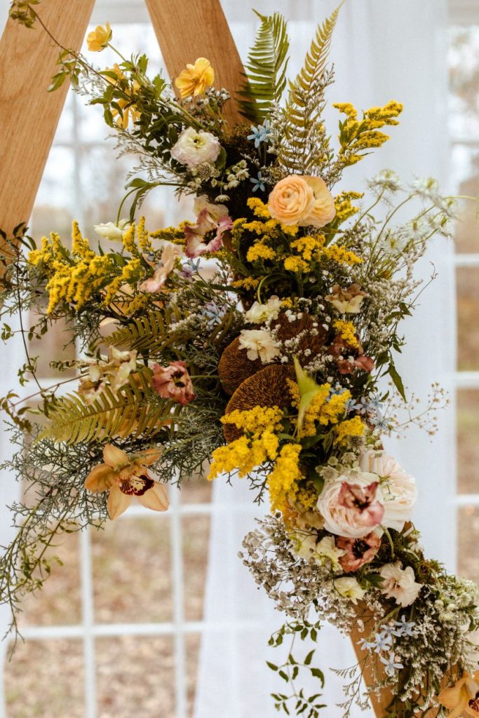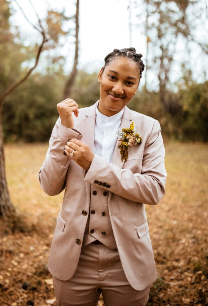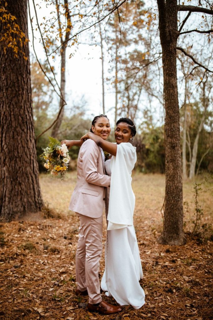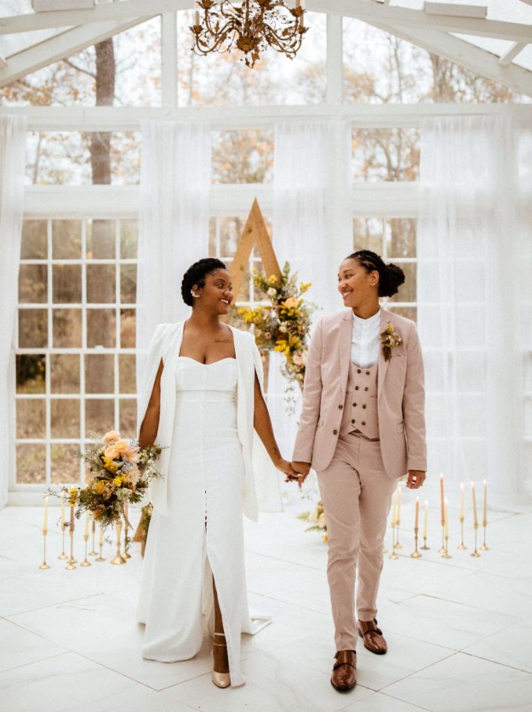 Alannah and Tracy had the most relaxed and intimate corona elopement I think we’ve ever seen – they were just that confident that they were marrying their best friend! On a cloudy, cold and moody day, the sweetest brides met to say their I do’s in front of only their closest family and friends under a beautiful Edges Wild Studio floral-adorned altar. Soft pastels in warm autumnal shades help bring in a little coziness to the cold day, and only made the romance more alive! As if it was fate, the skies opened up and it started to rain after their ceremony (which the couple takes as good luck), cancelling their plans to go to an outdoor bar and instead to get Italian takeout and hang out in the couple’s living room. There was truly no other perfect way Alanna and Tracy could have wanted their wedding day to go! Scroll to see all the pretty florals by Edges Wild Studio and to read about bride Tracy’s favorite wedding day memory. Cheers to Mrs. and Mrs. Richiez!