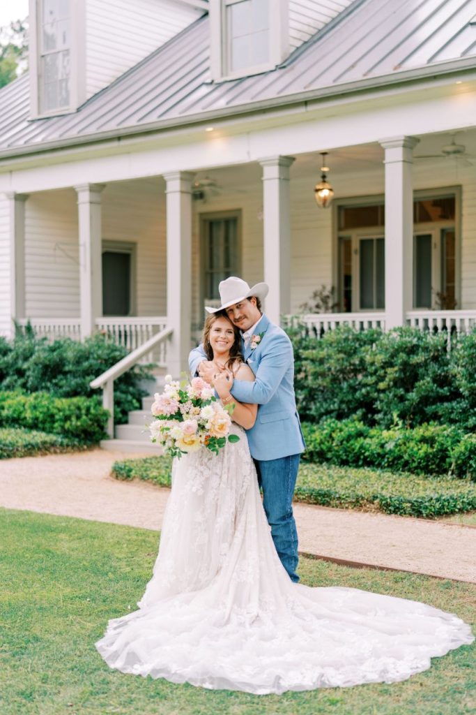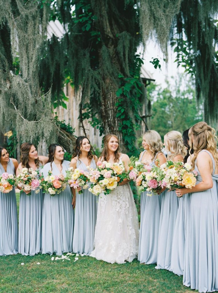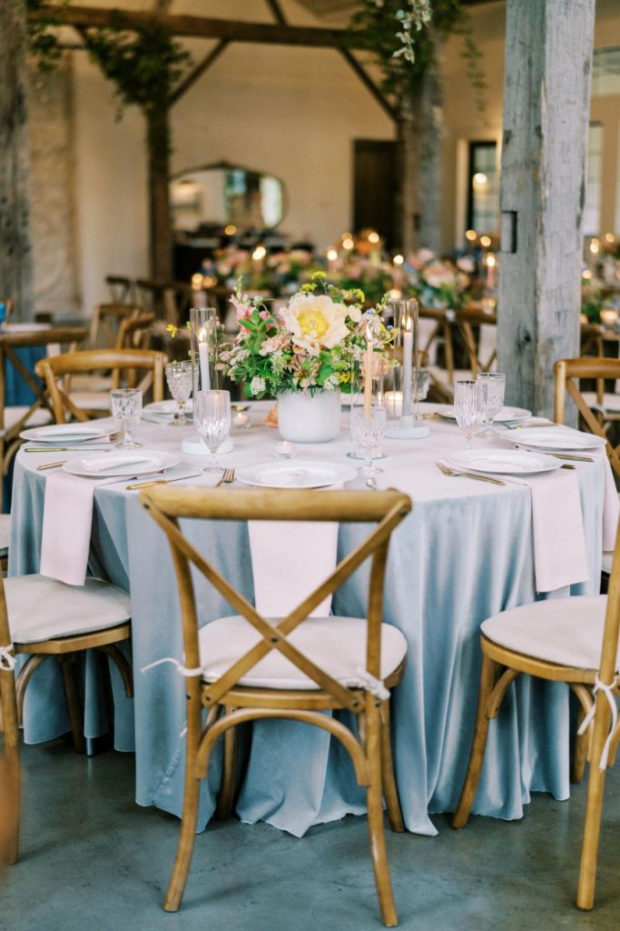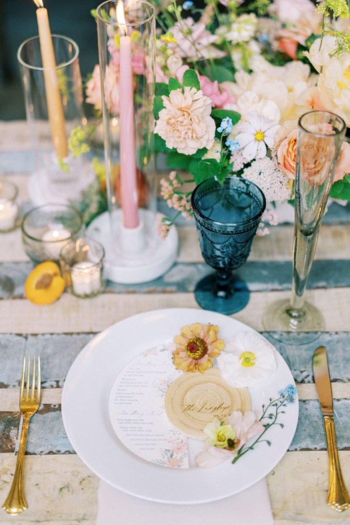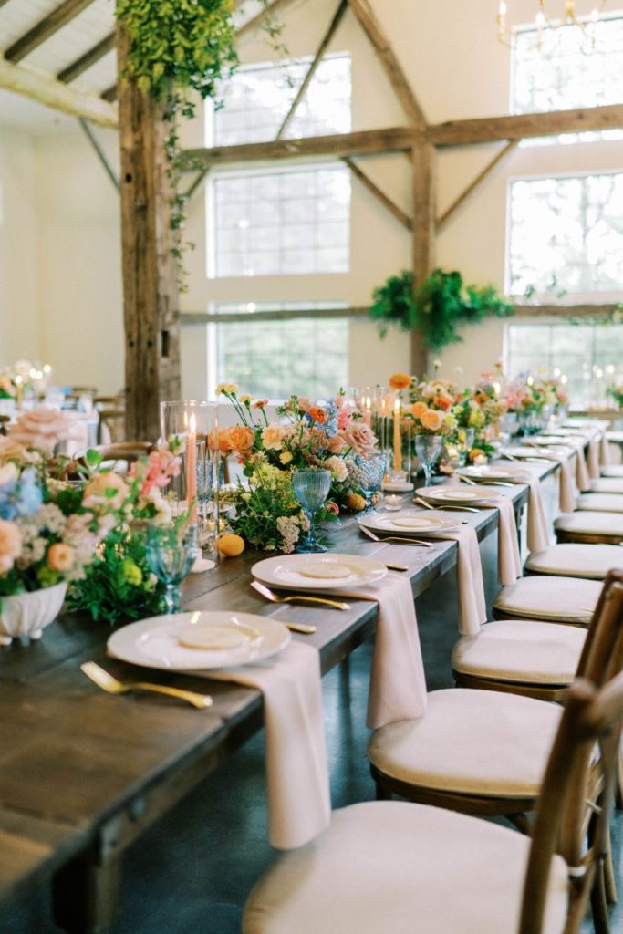 Robbi Flack and Ryan Langley planned a day filled to the brim with garden florals, meaningful details, and tasteful touches with help from the planners at Epoch Co+ and the result is an exquisite whimsical pastel wedding day! Spring is the bride’s favorite time of the year and she loves when everything is green and in bloom. Therefore, it was a no-brainer that Robbi and Ryan tie the knot in a wedding that carried the same fresh, springtime feeling full of color. Shades of peach, dusty pink, blue and yellow were the main palette for their outdoor ceremony and romantic indoor reception, where long tables and organic wood seating from Loot Rentals give a magical, fairytale feel to the room.