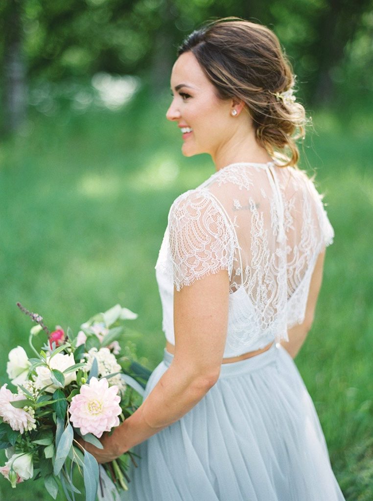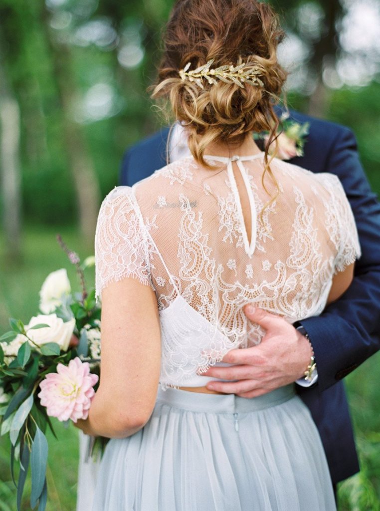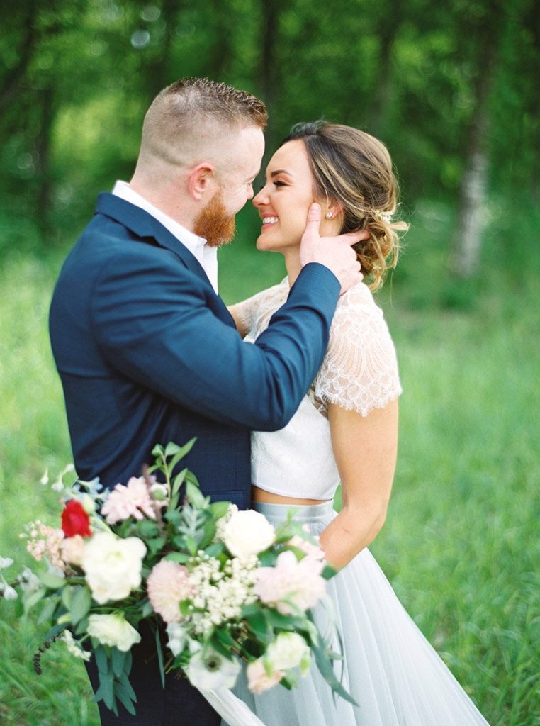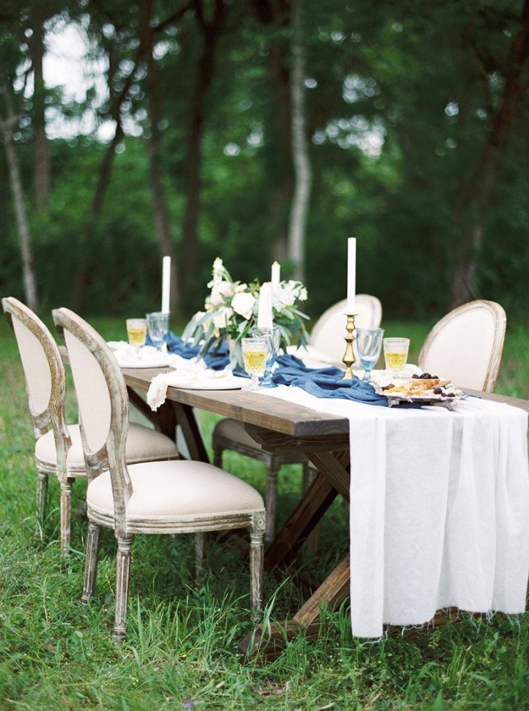 In an unsuspecting magical twist on a styled shoot, this romantic outdoor wedding shoot-turned-surprise proposal was nothing short of a true fairy tale brought to life! With a plan to help surprise the model bride, Jade Magnolia and Courtney Leigh Photography teamed up with the help of other talented vendors to seamlessly guide this “simulated” styled shoot into a full-blown engagement! Held on the lush, woodland property of a private residence, the team played up the naturally earthy elements of the backdrop, keeping any additional colors to a dreamy palette of powdery blue, navy and touches of glittering gold. Blush and Vine’s overgrown greenery arrangement included fresh blooms of roses, dahlias and others in shades of ivory and the softest pale blush to serve as both table decor and the soon-to-be-bride’s bouquet. A watercolor layered caked in pale blue and flecks of foiled gold from Buttercup Bakery was embellished with the same blossoming pale pink florals and shined as a centerpiece all on its own. Keeping with the blue hues, the model-turned-real bride was perfectly on trend, donning a stunning two piece ensemble by Alexandra Grecco featuring an old-world romance inspired high-neck lacy top and airy tulle skirt with a silk ribbon belt, paired with strappy metallic heels. Keeping her hair and makeup more natural-looking, Hey Lovely created a loosely pulled back, soft swept updo, secured with a glittering gold leaf-shaped brooch. We love the look on the model bride’s face as her soon-to-be groom swoops in for the big proposal moment—such a sweetly captured shoot for this couple!
