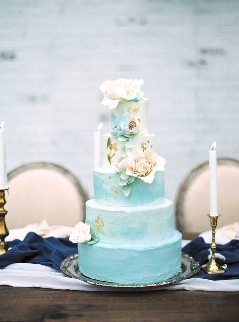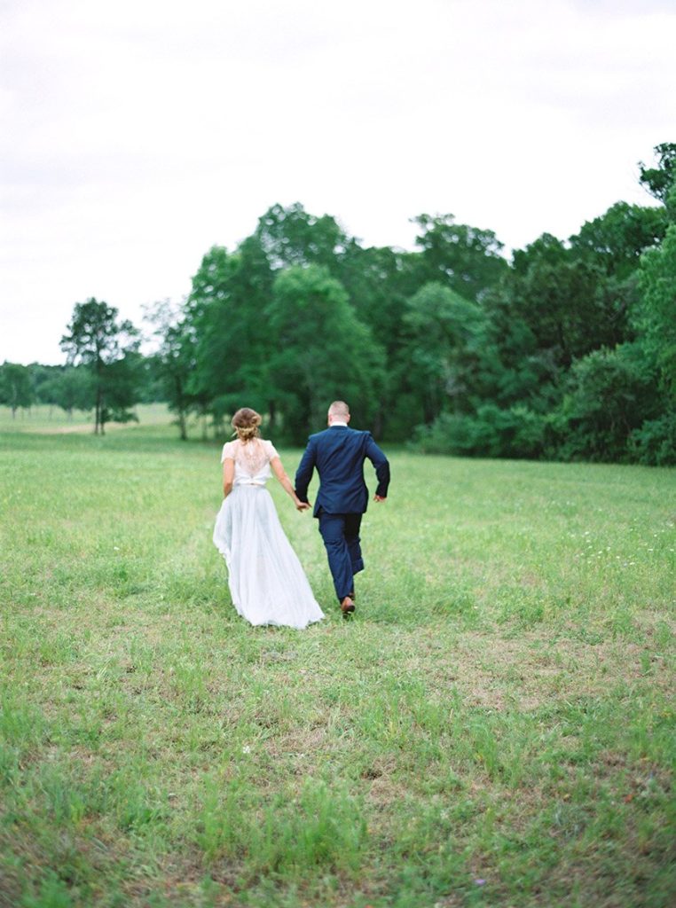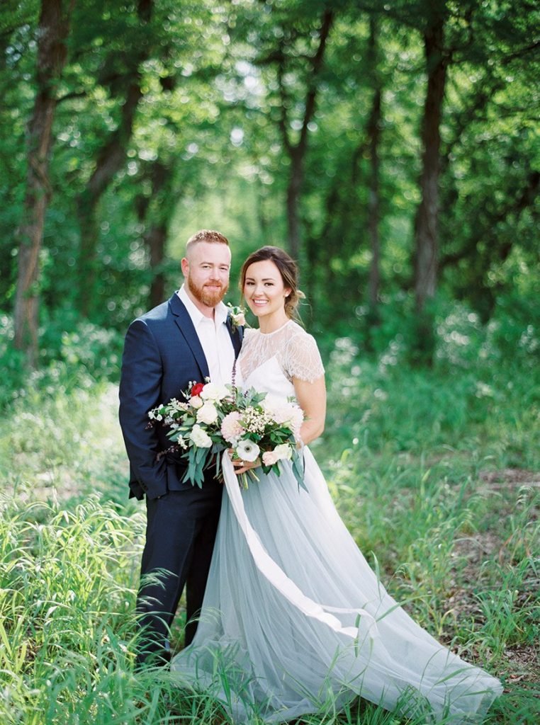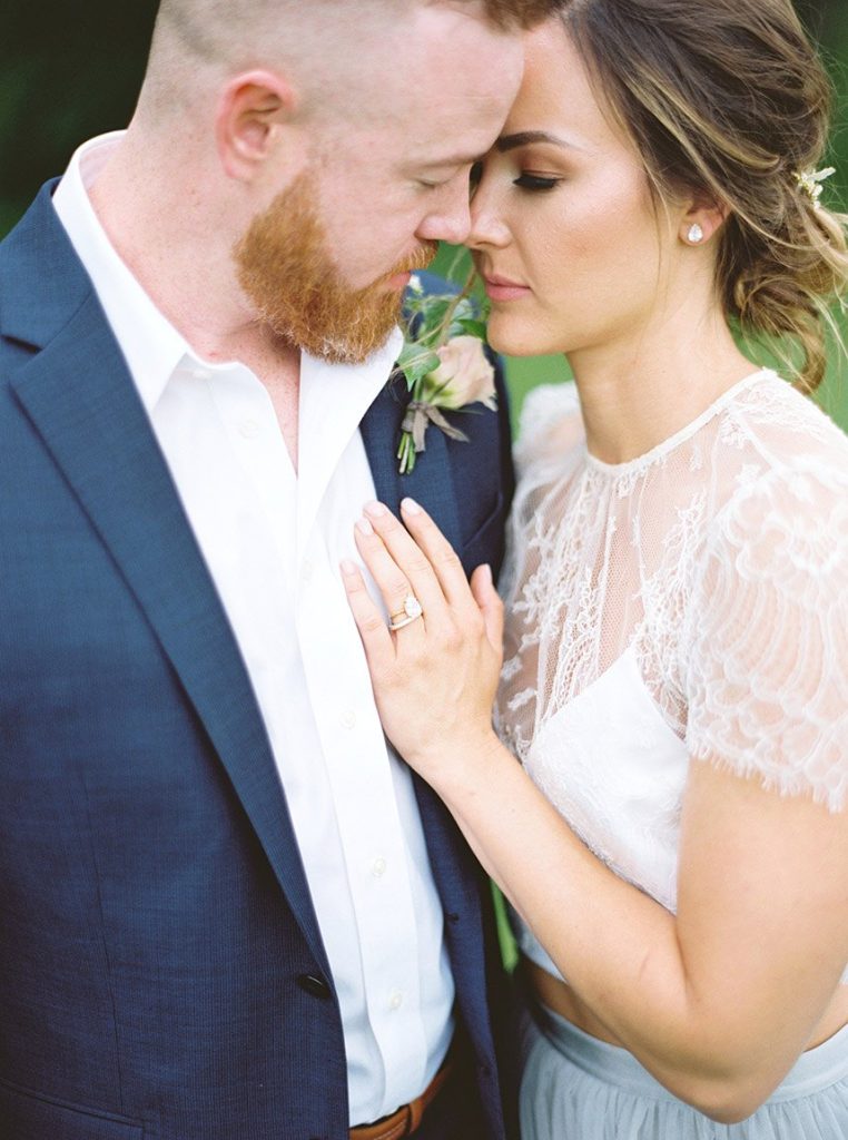 In an unsuspecting magical twist on a styled shoot, this romantic outdoor wedding shoot-turned-surprise proposal was nothing short of a true fairy tale brought to life! With a plan to help surprise the model bride, Jade Magnolia and Courtney Leigh Photography teamed up with the help of other talented vendors to seamlessly guide this “simulated” styled shoot into a full-blown engagement! Held on the lush, woodland property of a private residence, the team played up the naturally earthy elements of the backdrop, keeping any additional colors to a dreamy palette of powdery blue, navy and touches of glittering gold. Blush and Vine’s overgrown greenery arrangement included fresh blooms of roses, dahlias and others in shades of ivory and the softest pale blush to serve as both table decor and the soon-to-be-bride’s bouquet. A watercolor layered caked in pale blue and flecks of foiled gold from Buttercup Bakery was embellished with the same blossoming pale pink florals and shined as a centerpiece all on its own. Keeping with the blue hues, the model-turned-real bride was perfectly on trend, donning a stunning two piece ensemble by Alexandra Grecco featuring an old-world romance inspired high-neck lacy top and airy tulle skirt with a silk ribbon belt, paired with strappy metallic heels. Keeping her hair and makeup more natural-looking, Hey Lovely created a loosely pulled back, soft swept updo, secured with a glittering gold leaf-shaped brooch. We love the look on the model bride’s face as her soon-to-be groom swoops in for the big proposal moment—such a sweetly captured shoot for this couple!