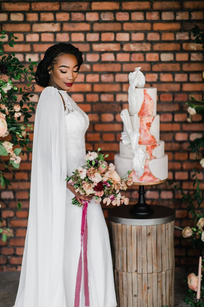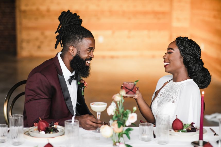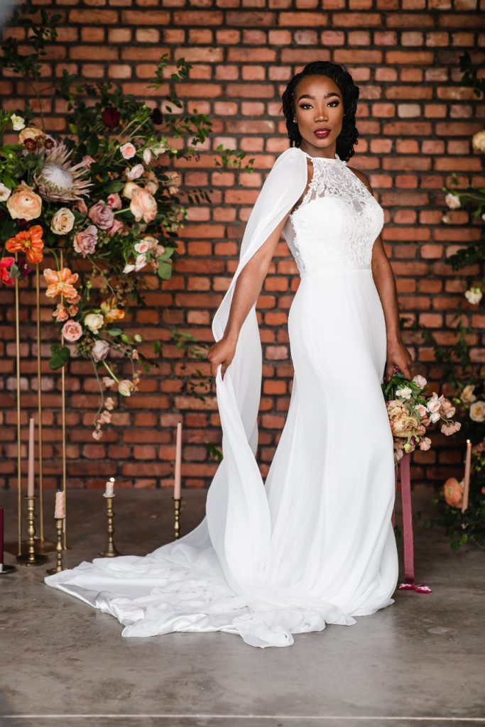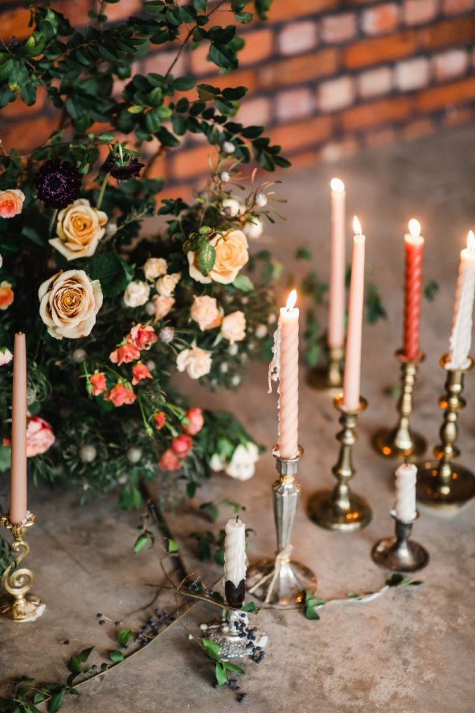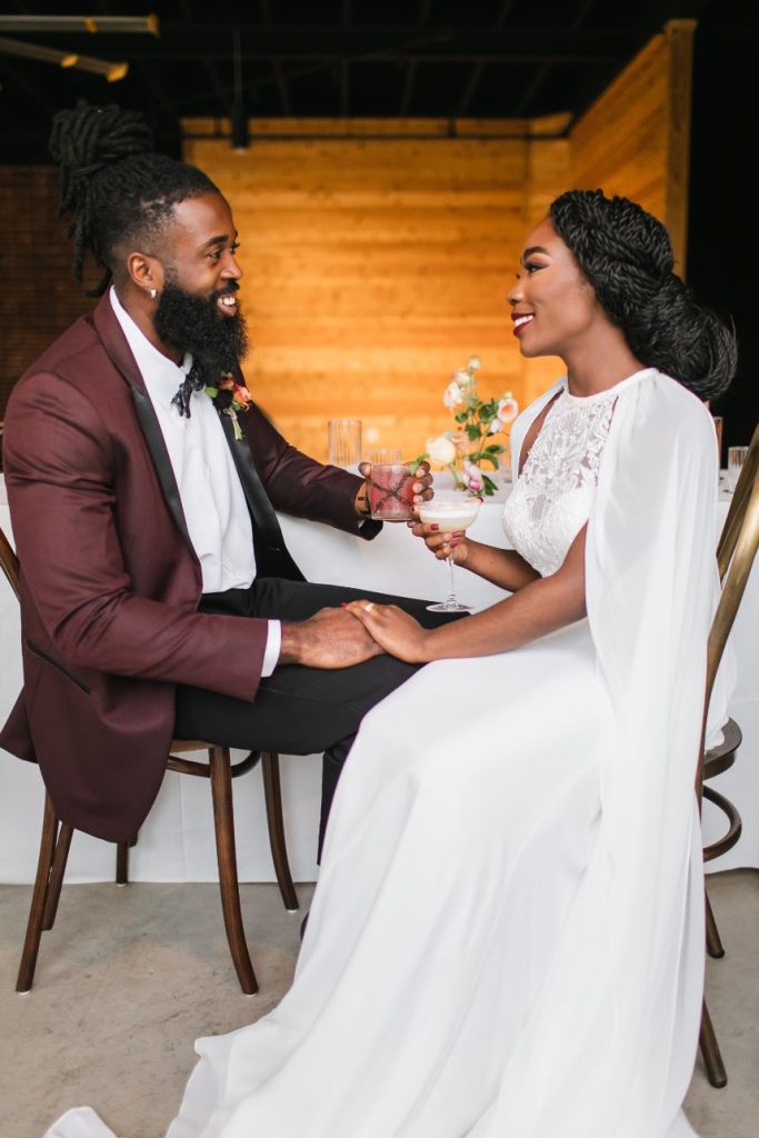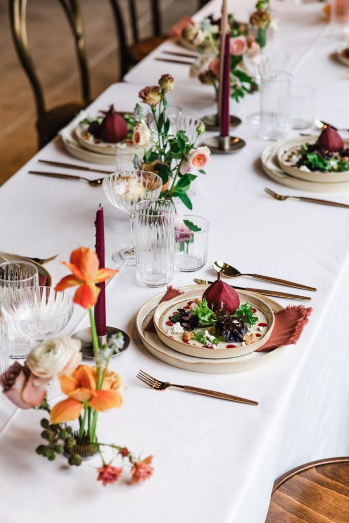 An abundance of florals paired with intimate, moody lighting is the recipe for some seriously unforgettable modern refined wedding inspiration – captured artfully by BLVD Photography! Salads, sips and sweets can be found among the organic linens of these tablescapes along with taper candles of elegant shapes and autumnal hues, scattered around frames in a whimsical and effortless manner to really set the mood. Beautiful, rustic wooden and opulent gold rentals from Swift + Company contrast perfectly with delicate petals in these romantic, woodland-esque scenes. This model looks absolutely radiant in an eclectic bridal look featuring the most incredible gown and cape combo we’ve ever seen from The Princess Bridal! There is so much obvious chemistry within the stunning scenes of this styled shoot and this modern pair looks so elegant together. Between the moody ambiance, the yummy-looking cocktails, and the bridal attire fit for the runway, we could never pick a favorite detail from this styled shoot! Keep scrolling to check it all out for yourself in this oh-so-romantic, refined wedding inspiration. Cheers!