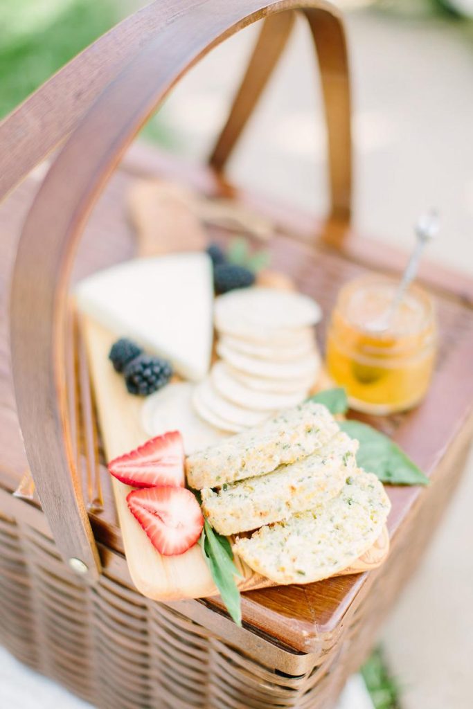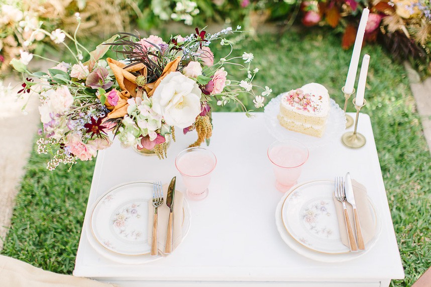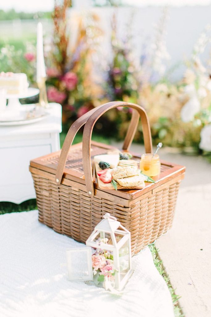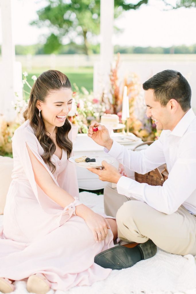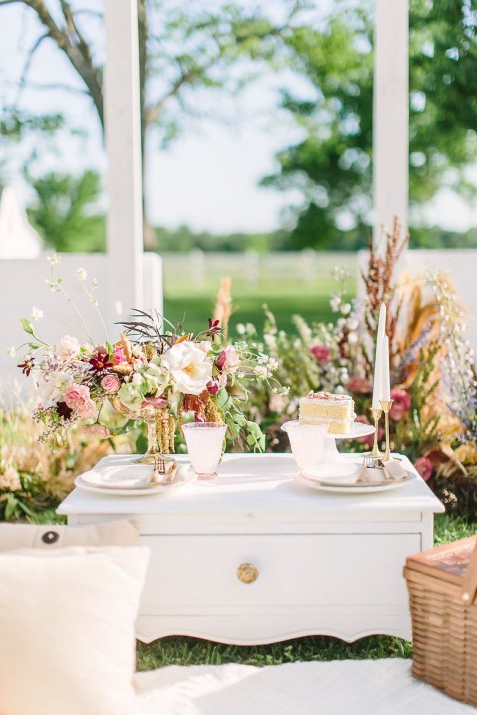 From the planner: “Everyone loves a sweet picnic celebration! This intimate picnic was surrounded by delightful organic floral, decadent morsels of fruit and cheese, and the cutest heart-shaped cake I have ever seen. Ashley and Alex took us on a journey through their beautiful love story, and it was so refreshing to witness! A huge thank you to all of the incredible vendors and friends who brought this shoot to life!”