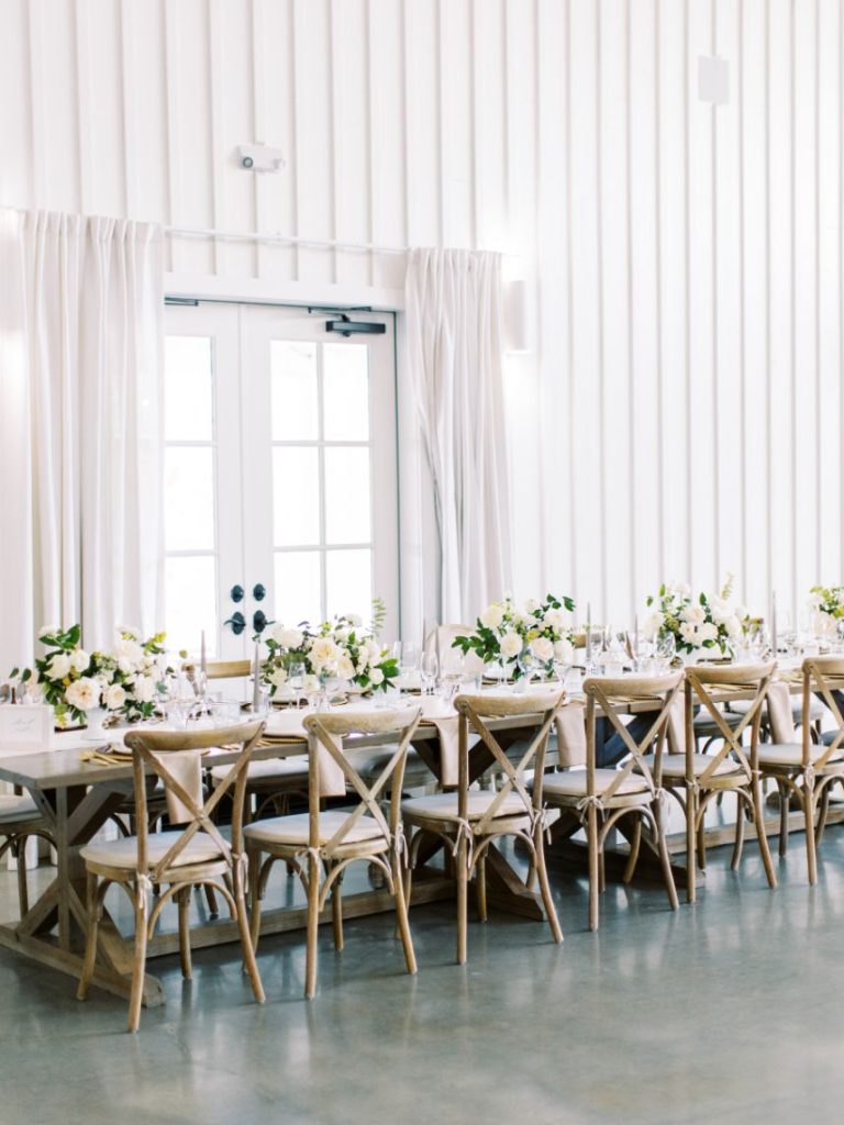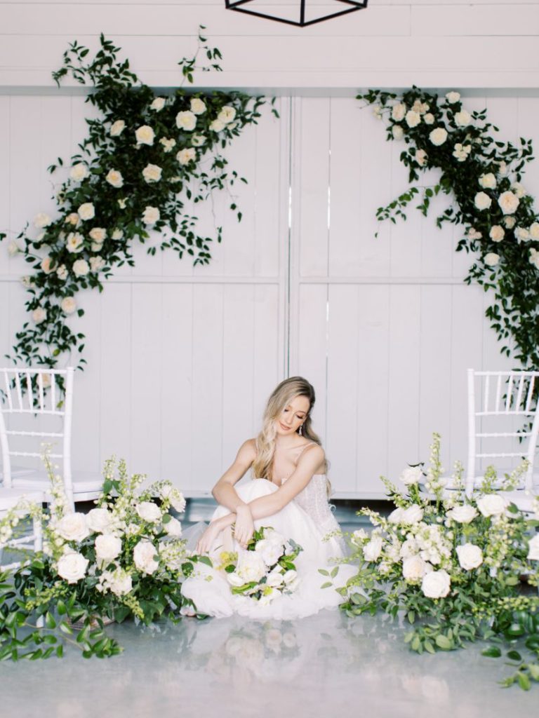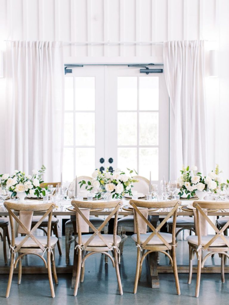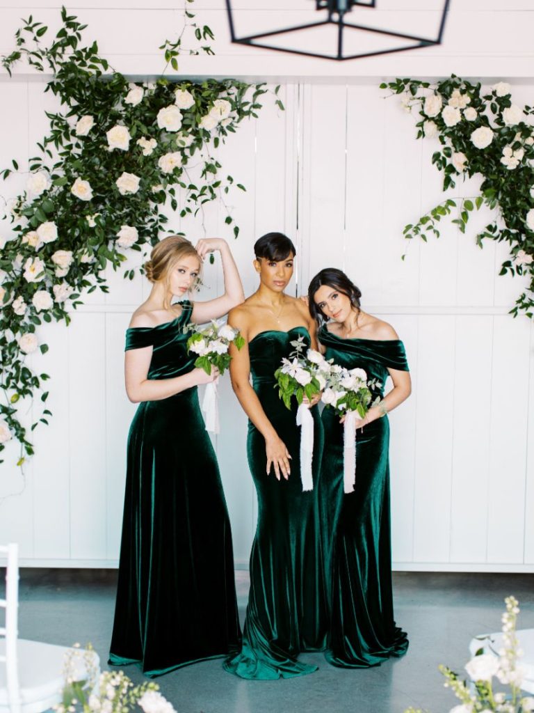 This romantic wedding inspiration is full of down-to-earth elegance captured by The Crakes in California cool scenes that feel so effortless. A stately setting offers the perfect black canvas background where a whitewashed barn just on the outskirts of rustic style was elevated by lush touches, gorgeous models and opulent décor. Luxurious springy florals in all white can be found around every corner but we’re partial to the ivory delphinium and roses from Jackie Trejo Floral Design that line the aisle, instantly making this ceremony setup so fresh and elegant. Our bridesmaids look stunning, keeping it simple but chic in luxe green velvet gowns to complement the bride’s modern, regal look. She is flawless from head to toe, styled by BP Artistry with loose waves secured back on one side and peach-toned wedding makeup that left her glowing. For the final touch, a reception scene was set with champagne linens and place settings hand-lettered with calligraphy by Design to Flourish in timeless, romantic script. Like a breath of fresh air, this California cool, romantic wedding inspiration is just waiting to be enjoyed! See the light-filled gallery down below. Cheers!