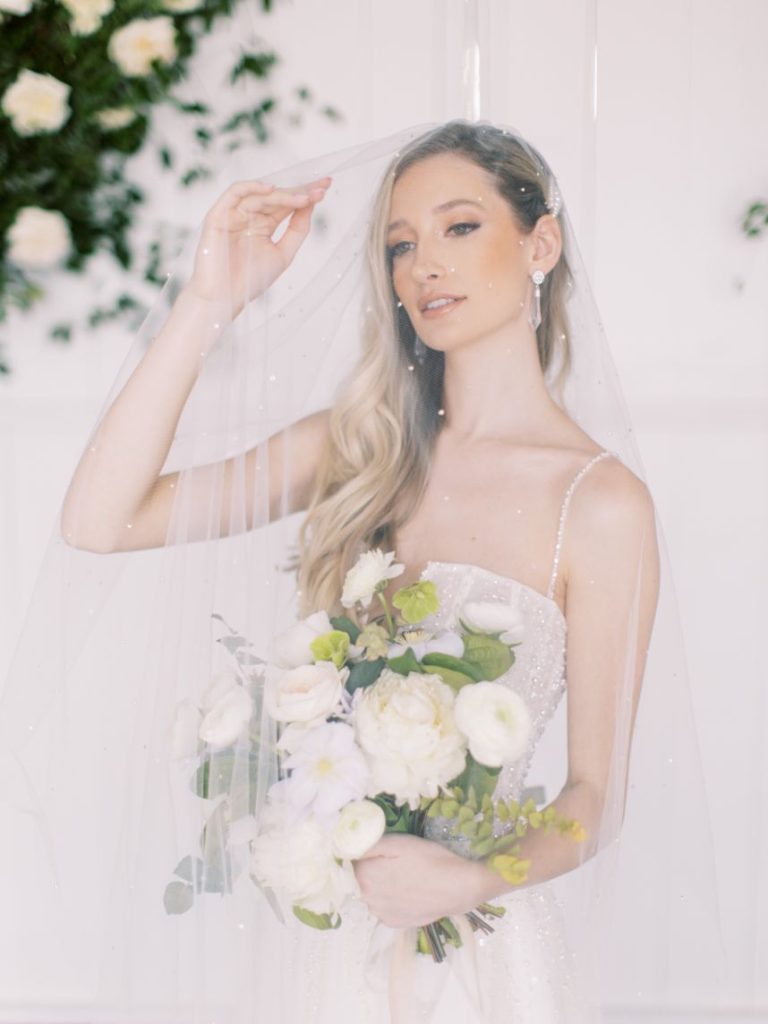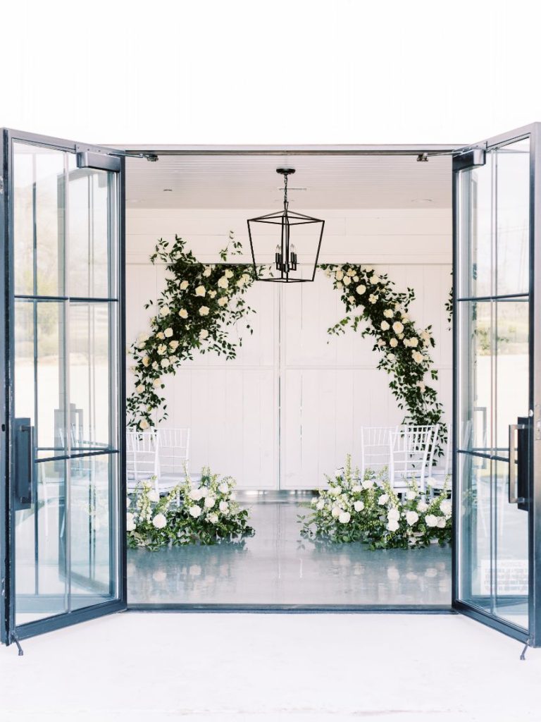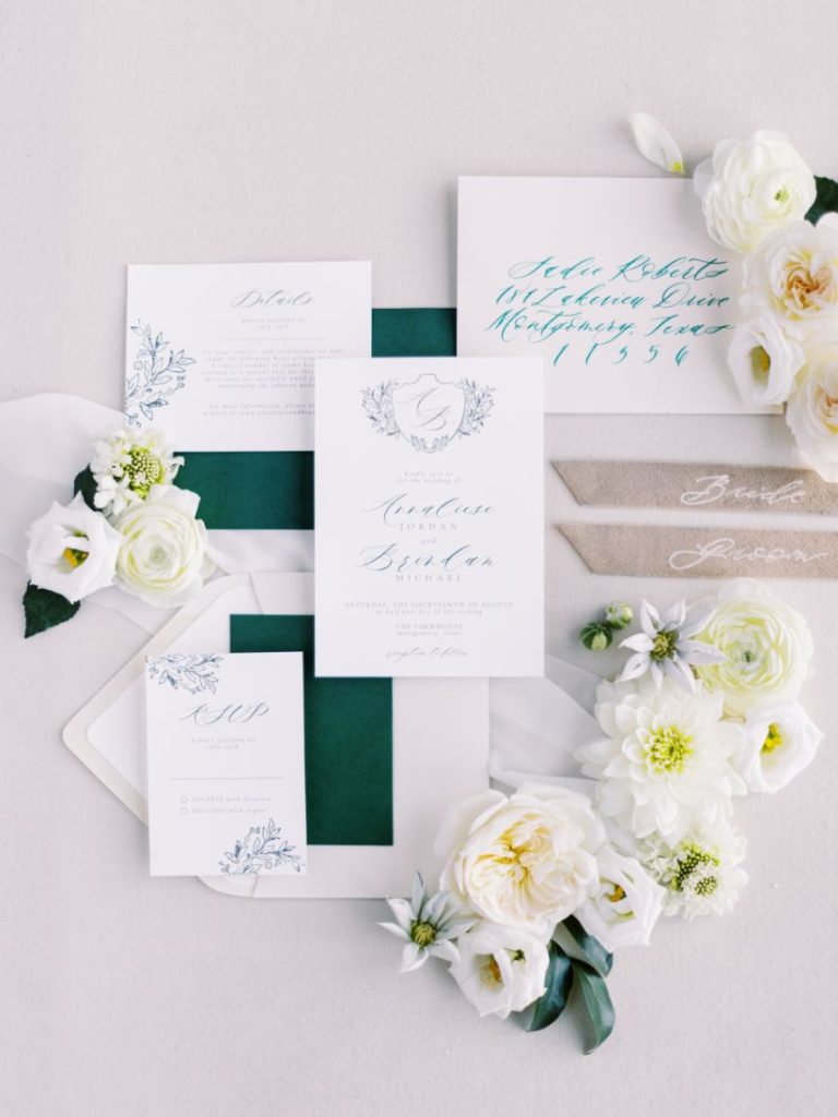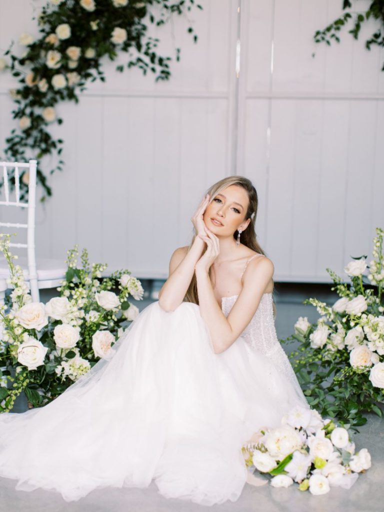 This romantic wedding inspiration is full of down-to-earth elegance captured by The Crakes in California cool scenes that feel so effortless. A stately setting offers the perfect black canvas background where a whitewashed barn just on the outskirts of rustic style was elevated by lush touches, gorgeous models and opulent décor. Luxurious springy florals in all white can be found around every corner but we’re partial to the ivory delphinium and roses from Jackie Trejo Floral Design that line the aisle, instantly making this ceremony setup so fresh and elegant. Our bridesmaids look stunning, keeping it simple but chic in luxe green velvet gowns to complement the bride’s modern, regal look. She is flawless from head to toe, styled by BP Artistry with loose waves secured back on one side and peach-toned wedding makeup that left her glowing. For the final touch, a reception scene was set with champagne linens and place settings hand-lettered with calligraphy by Design to Flourish in timeless, romantic script. Like a breath of fresh air, this California cool, romantic wedding inspiration is just waiting to be enjoyed! See the light-filled gallery down below. Cheers!