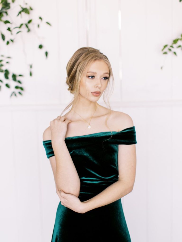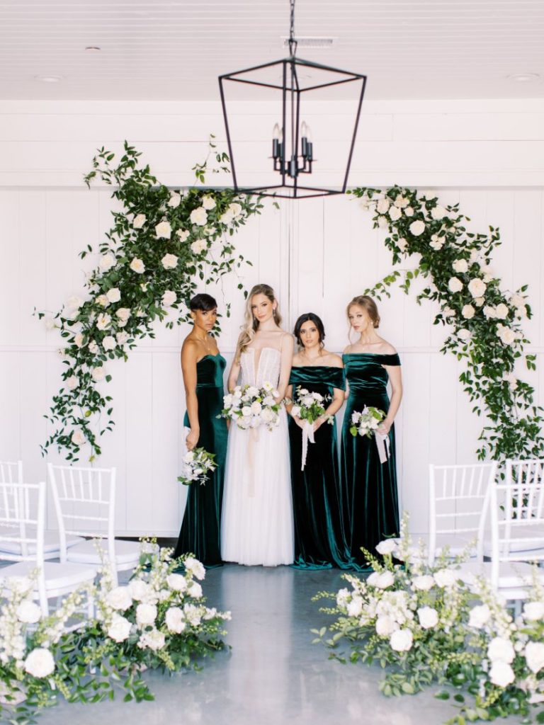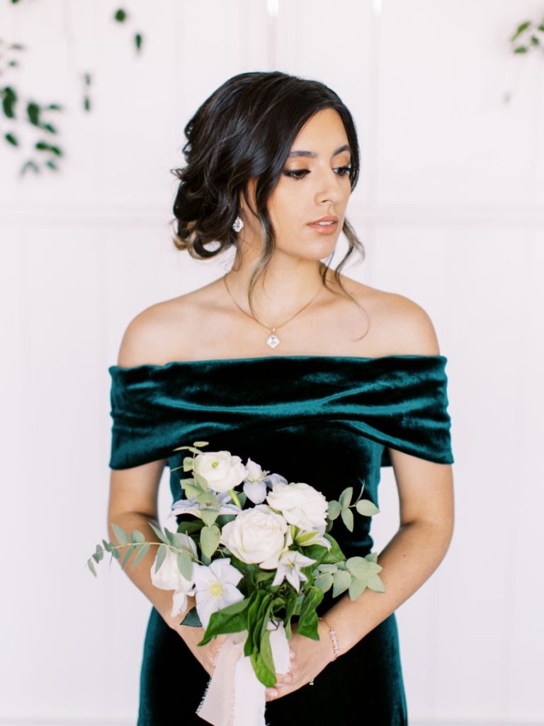 From the photographers, The Crakes: “Tammy, the planner, had this amazing vision in mind to bring in the velvet green to the shoot to really show the texture of winter. I loved the ceremony arrangement for a micro wedding due to covid restrictions and showing another way to use the venue. The models were amazing. Being able to have fun and pose with no time constraints is always the best!”