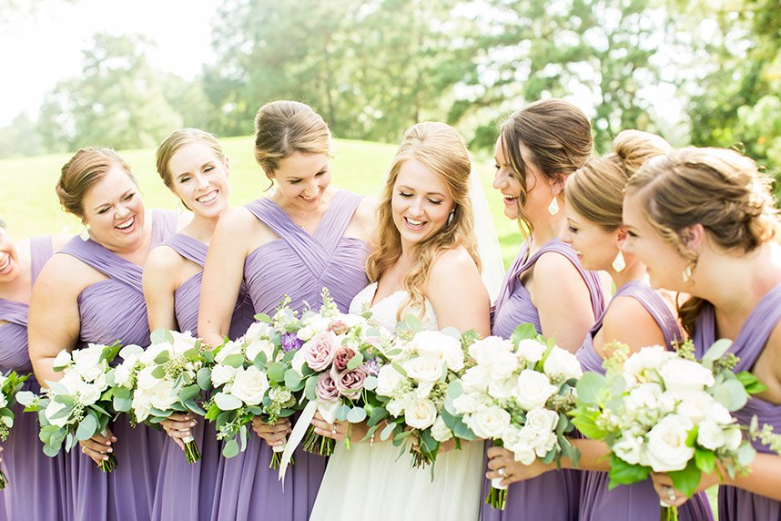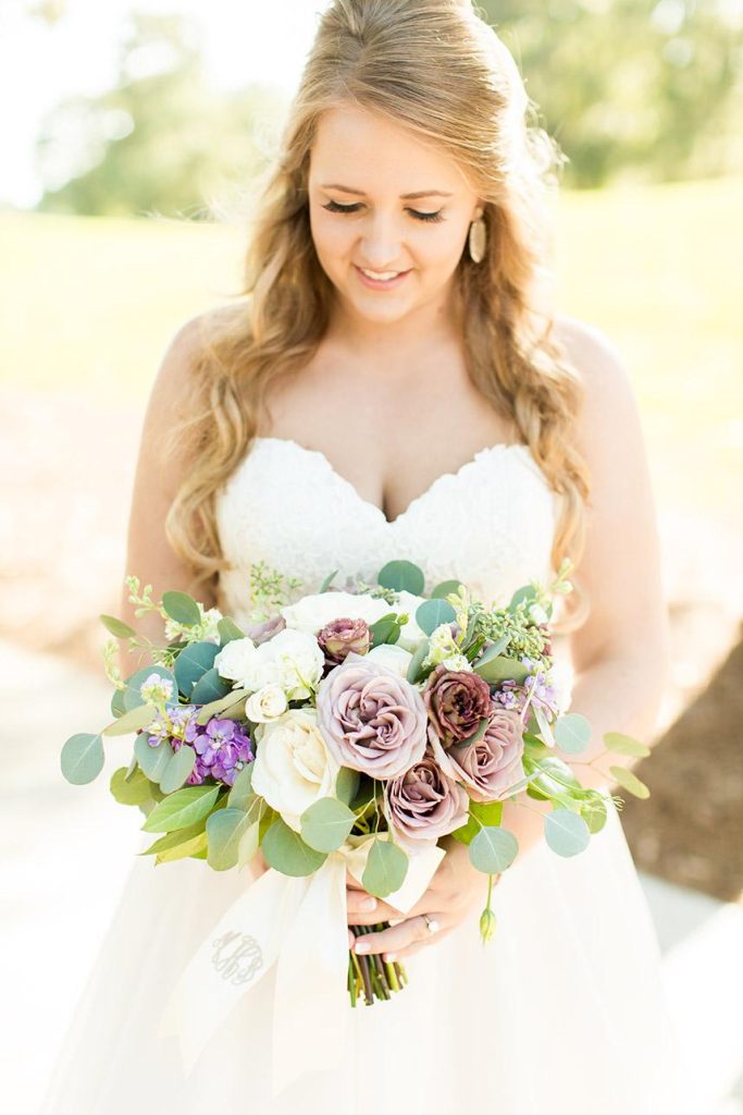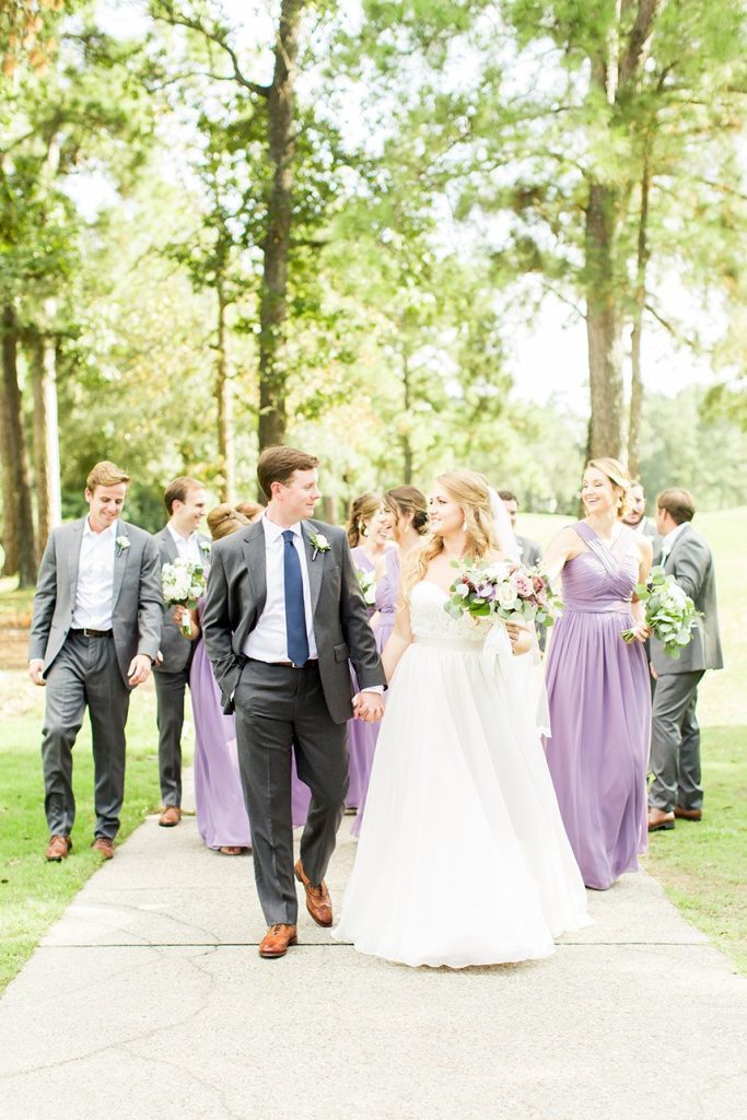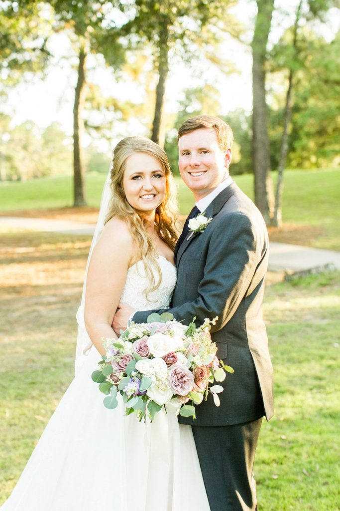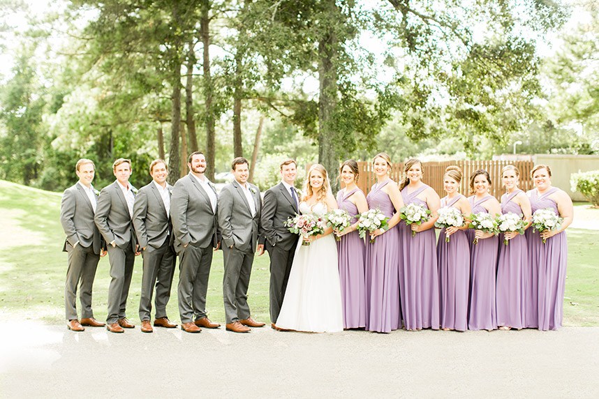 With a mix of soft lavender, popping purples and a green foliage backdrop, Meredith and Steve’s rustic elegance wedding coordinated by Plan Our Day at The Woodlands Country Club is the picture perfect epitome of a modern romance wedding theme. With the ceremony set outside overlooking the pond, an aisle decorated with wooden barrels and lanterns lead to the bride and groom who stood under a white-washed wood altar arch. Kasey Lynn Photography captured the sweet moments of the evening from altar to reception, beginning with the bride and her bridesmaids all in looks from Whittington Bridal. The bride’s strapless sweetheart gown was perfectly complemented by her bridesmaids’ lavender-hued gowns and simple bouquets of fresh white roses from Striking Stems. The bride chose a beauty look of soft waves pinned in a half up-do and soft and simple makeup from Adorne Artistry were a natural fit for the whimsical setting. Inside the reception, dark wood architecture, tables and chairs were contrasted by a mix of ivory and lilac hued florals and dozens of candles to create the most idyllic setting for the couple to celebrate their love story! Cheers to this gorgeous celebration!