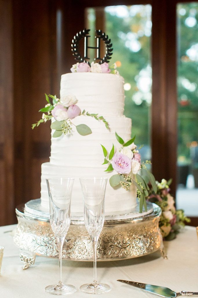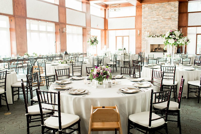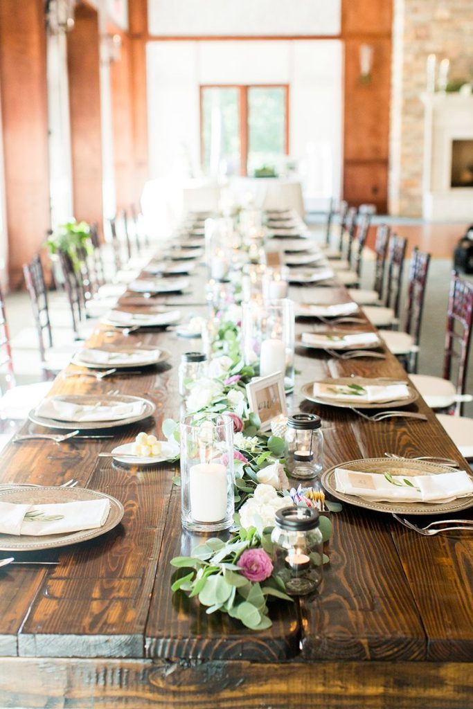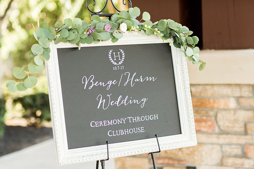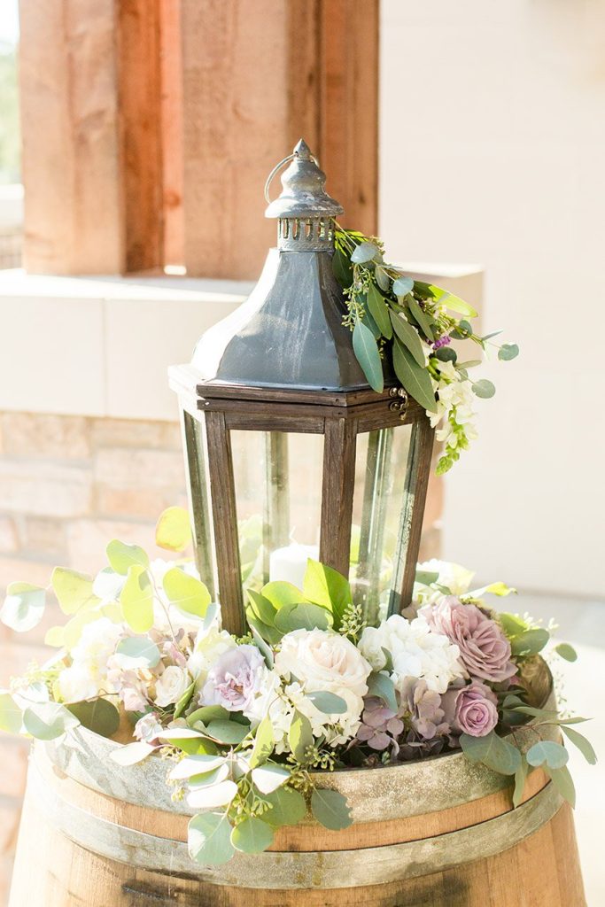From the bride: “Our wedding day was magical, meaningful, and hands down the most fun I have ever had! The rustic touches of lanterns and barrels and soft romantic florals set off the lakeside ceremony location and lush greenery of the golf course. The ceremony was beautifully framed by a breathtaking rustic chapel arch that i absolutely fell in love with. Our guests signed a rustic bourbon barrel guest book, and the reception space was completed with farm tables lined with greenery and candles, and a monogram cast onto the soaring fireplace, with mantle draped in greenery and florals. Seeing it all come together, thanks to my wonderful vendors, was absolutely incredible!