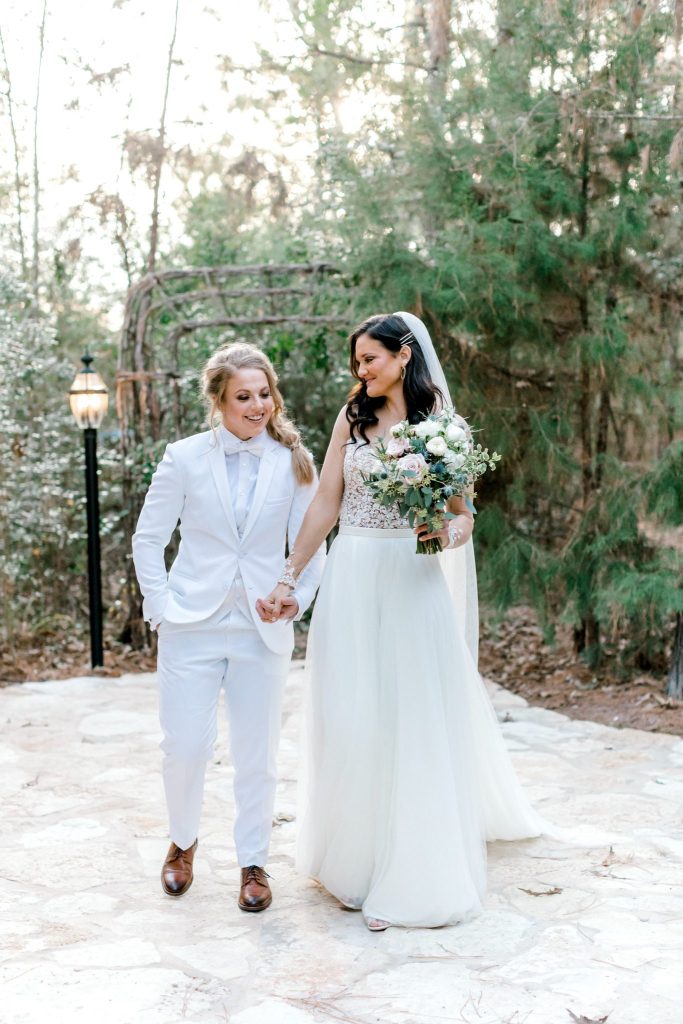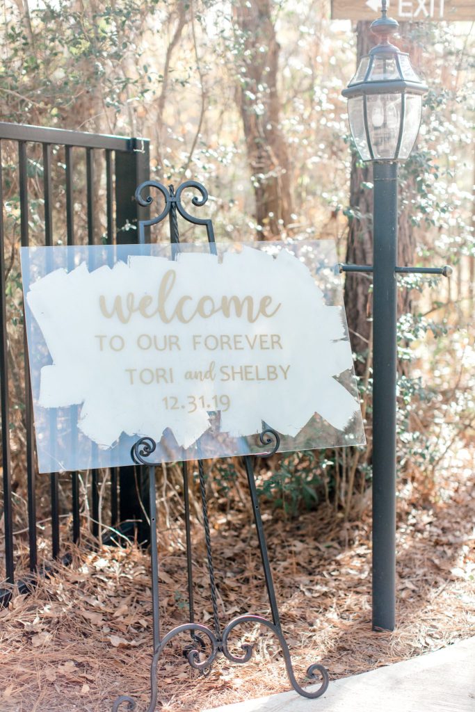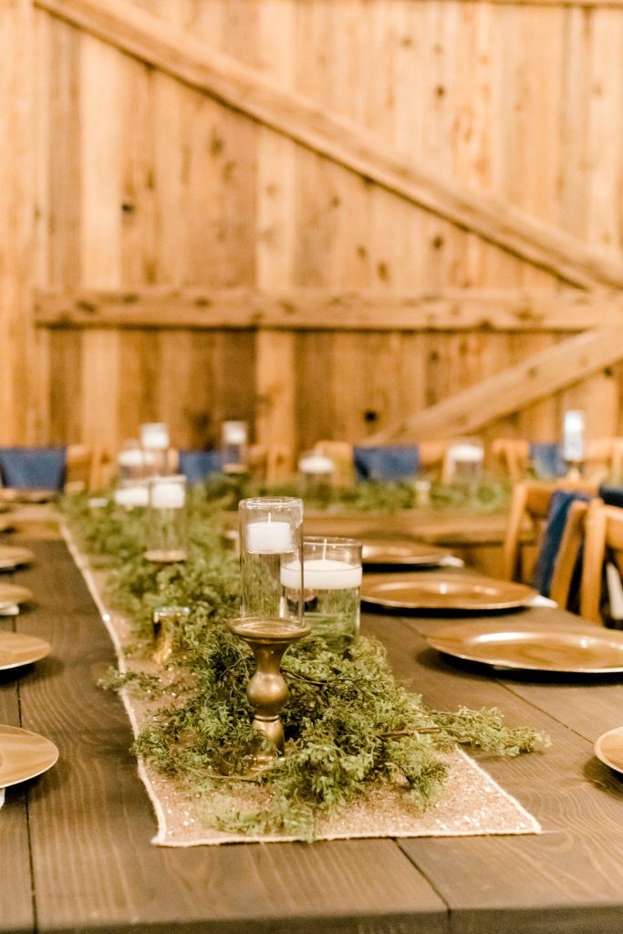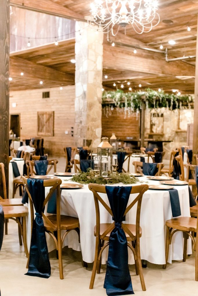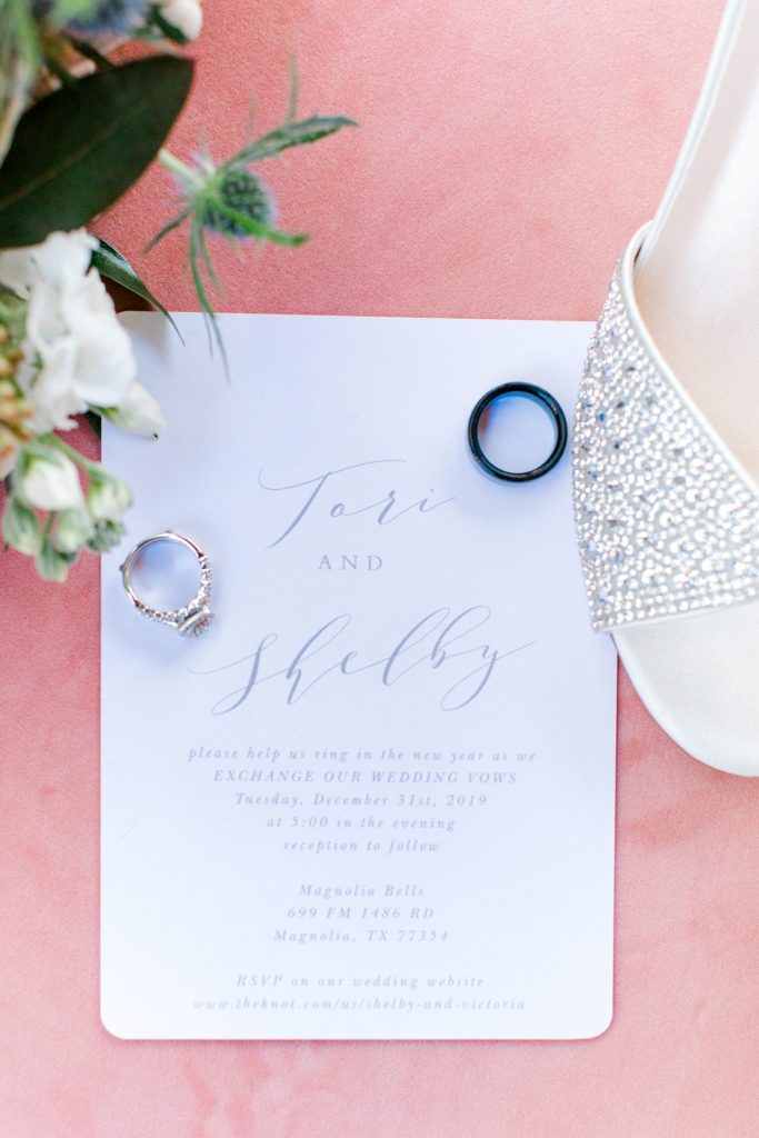 This romantic wedding is full of rustic details with the perfect touch of New Year’s Eve glam! Tori and Shelby’s New Year’s Eve celebration featuring a beautiful deep navy blue and soft blush color palette made for the perfect way to ring in the new year, and pops of gold throughout bring in the New Year’s Eve feel in the most romantic way. Rustic wood accents and light, delicate florals curated from Shelby’s sister make this scene feel cozy, warm and oh-so romantic, complemented by bunches of lush greenery and chic leather decor. While both brides looked absolutely stunning, we can’t seem to take our eyes off of Shelby’s gorgeous gown from Brickhouse Bridal – illusion sleeves with a sweetheart neckline go perfectly with her flowing veil and bridal accessories from Grace Loves Lace. If there’s one piece of advise the couple wants to pass on, it’s to soak in every moment because the day goes by too fast – so spend it with the people you love and enjoy all of the special moments that come! Scroll to see all of the rustic details of this romantic day that had the perfect touch of New Year’s Eve glam. Cheers to the happy couple!