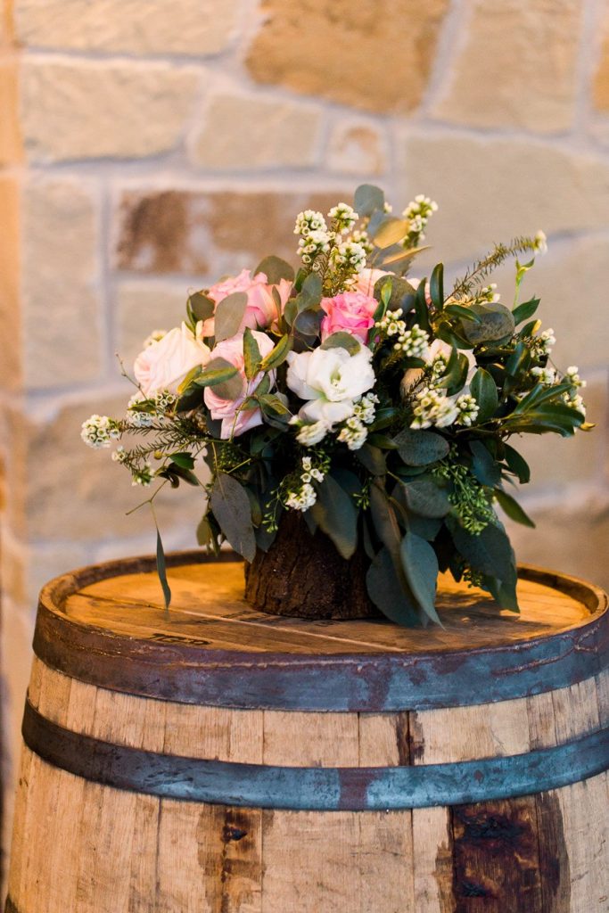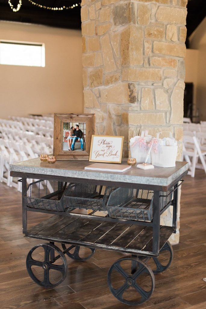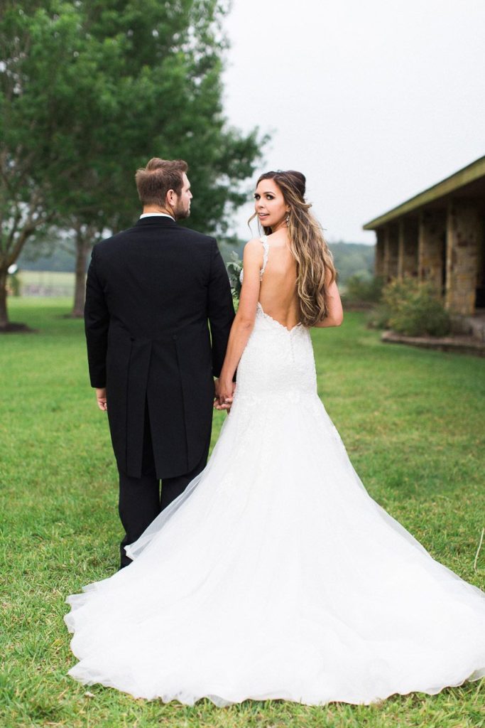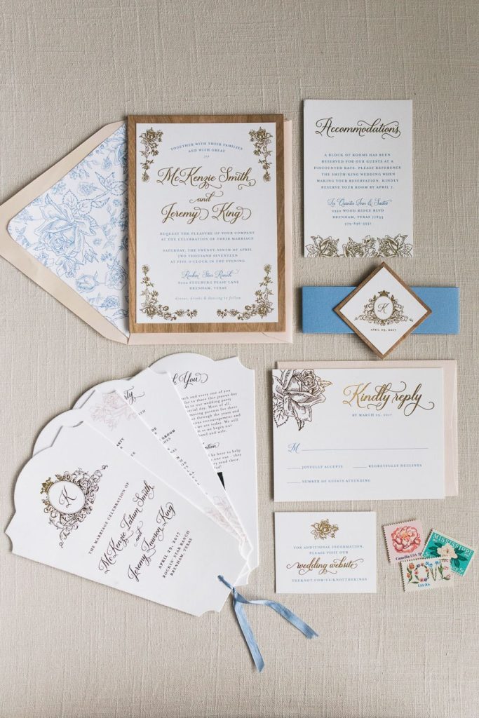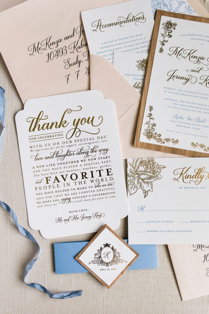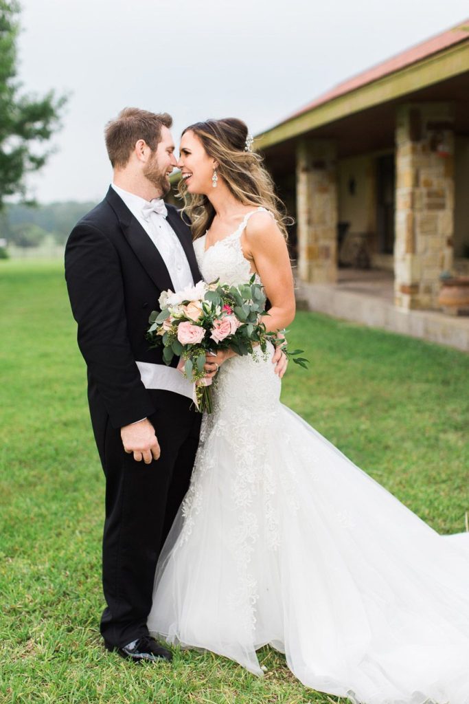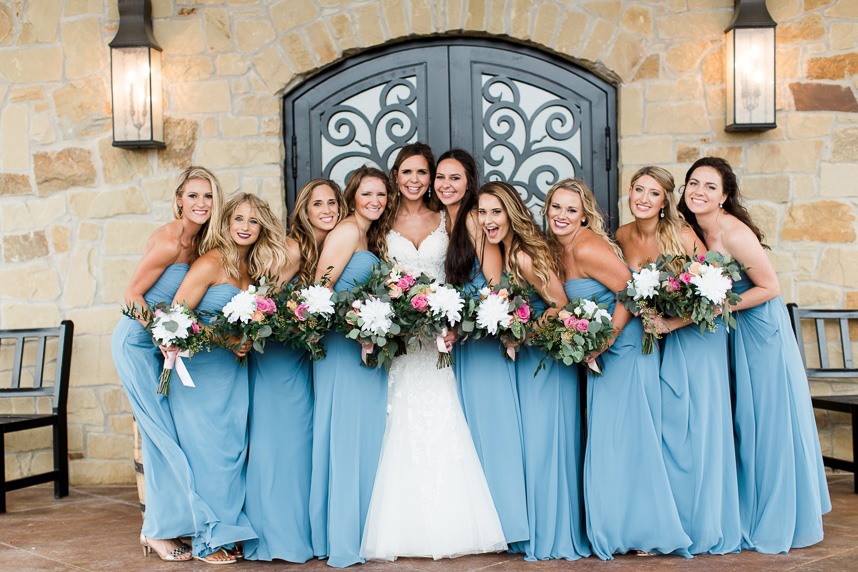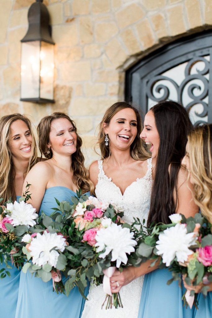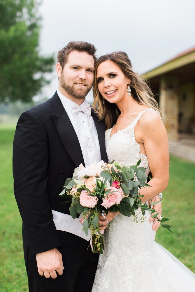 This rustic romantic ranch wedding had no shortage of beautiful stationery elements and sweet treats. After all, it was the smashing soirée of owner and invitation designer Kenzie of Paper Tie Affair! Kenzie used her creative talents throughout her own wedding, designing a romantic invitation suite and adorable signage throughout the venue, Rockin’ Star Ranch in Brenham, Texas. Hues of light blue in both the stationery and bridesmaids’ dresses, classic greenery woven throughout the beautiful florals and delicate pink roses for a classically romantic touch made this couple’s day unforgettable. Make sure to read Kenzie’s favorite wedding day memory below!