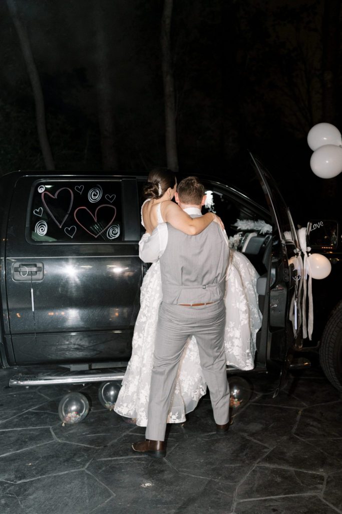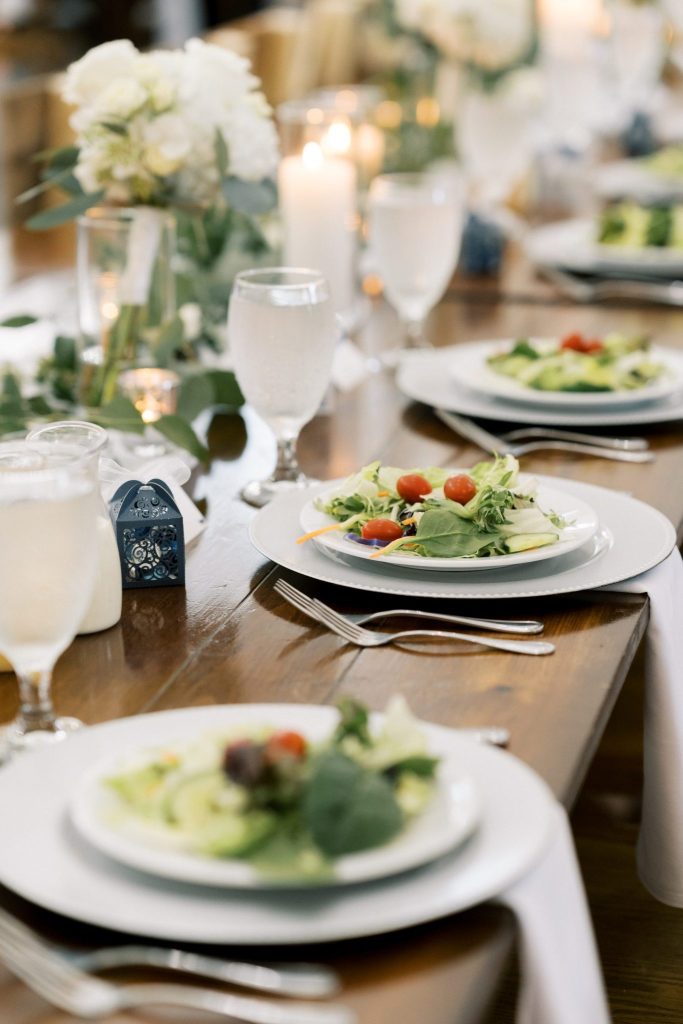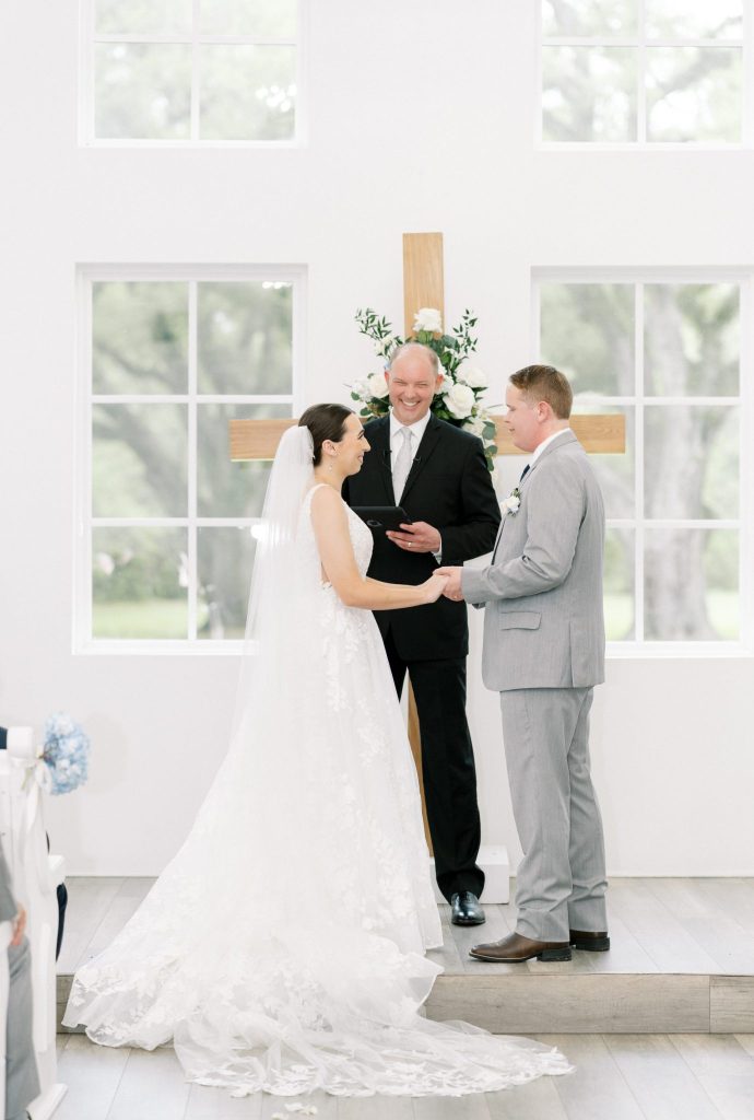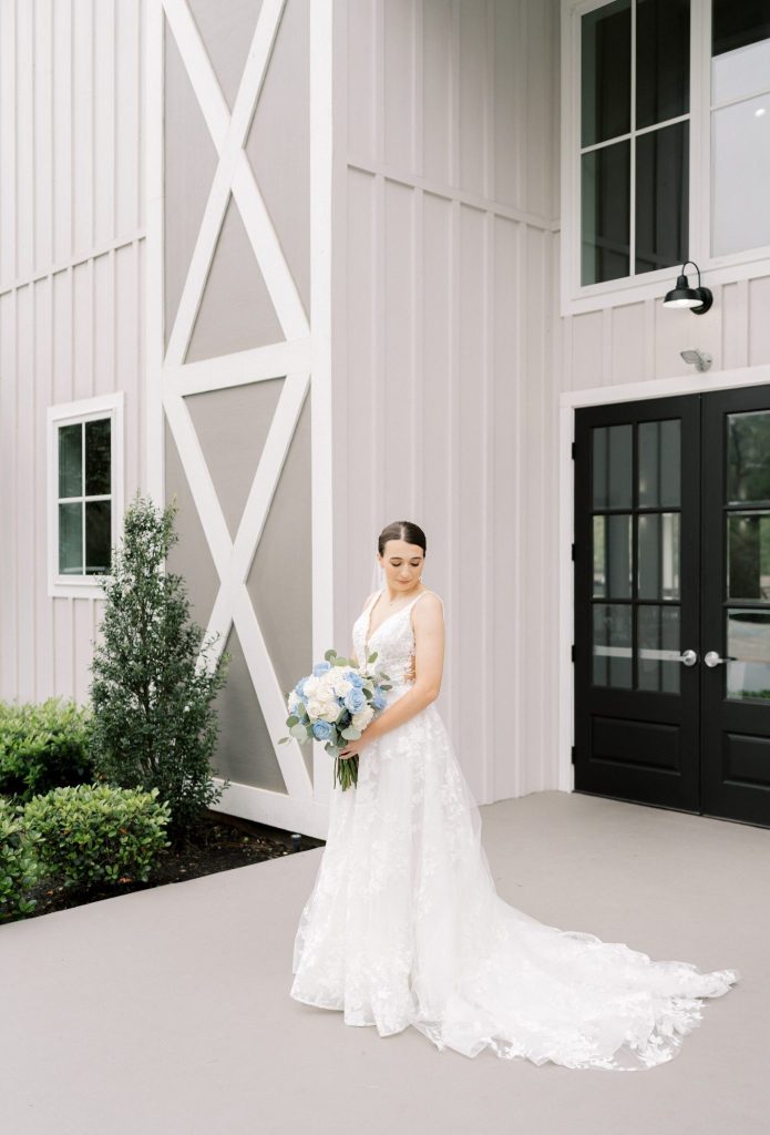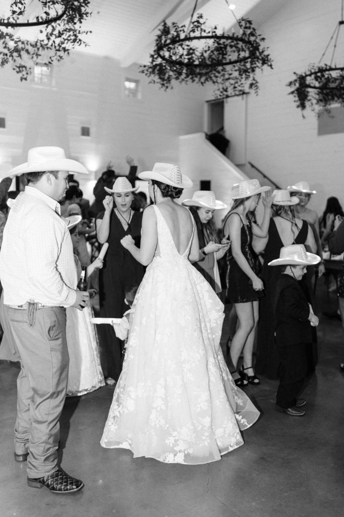 Kathryn + Kolten wed at The Woodlands, with a modern take on a traditional and rustic spring celebration. Twinkling lights and flower arrangements adorned the venue, with shades of white and blue everywhere. The couple told vows that touched the hearts of their guests before everyone danced the night away with custom cocktails in hand and cowboy lighting hats on their heads.
