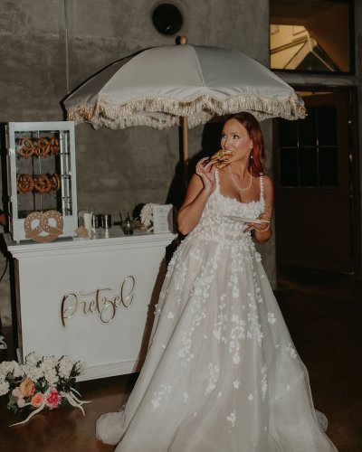 Mackenzie & Michael’s celebration had it all—romance, personality, and the perfect salty snack! After saying “I do” beneath a dreamy floral arch, guests were greeted with warm pretzels from Baked Pretzel Catering—and they were an instant crowd favorite!