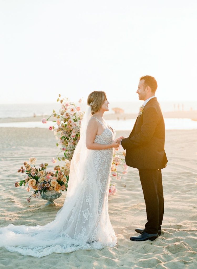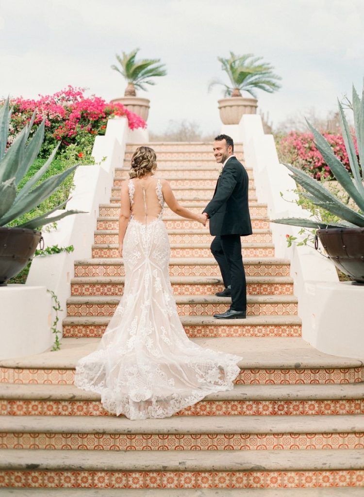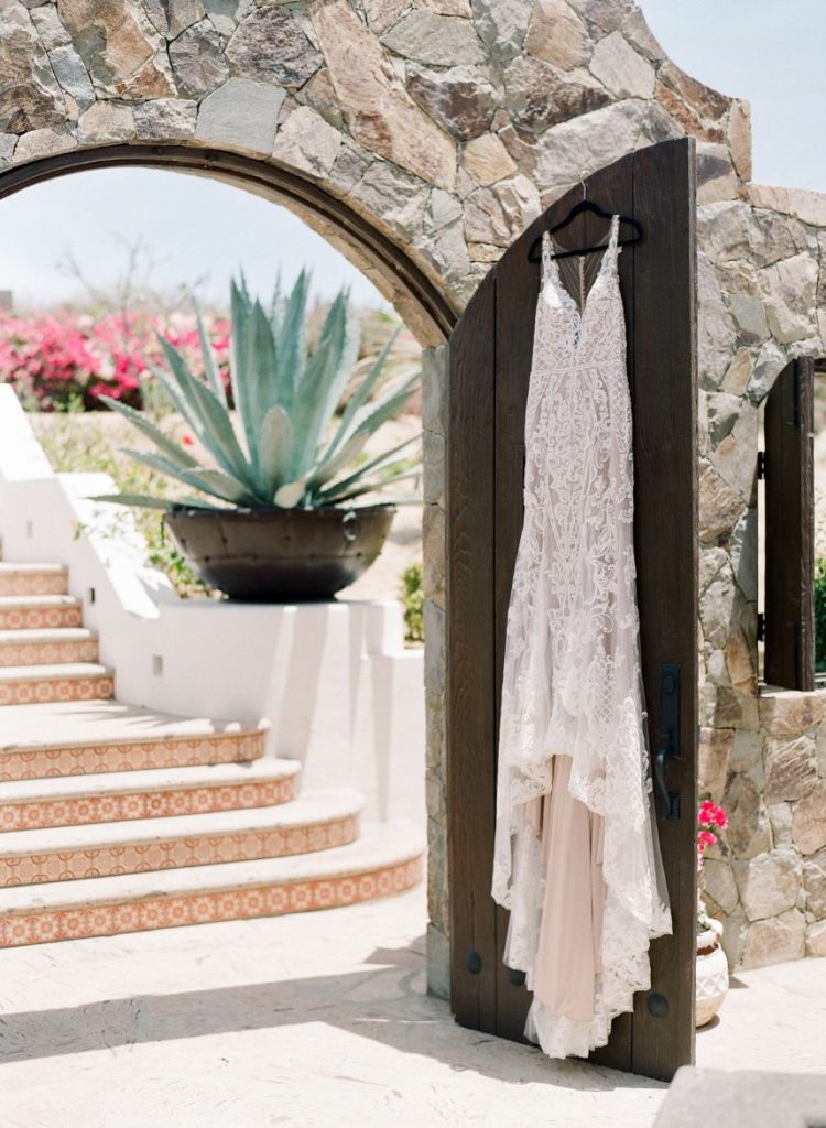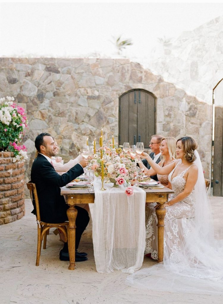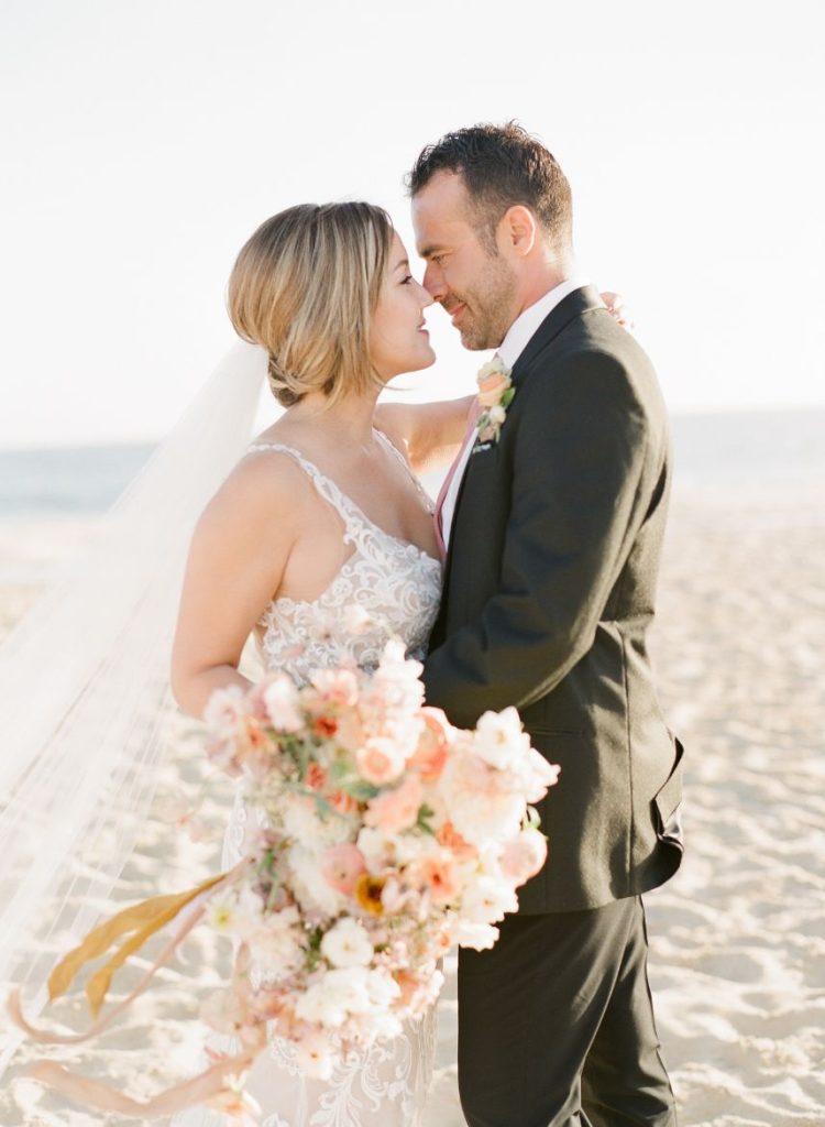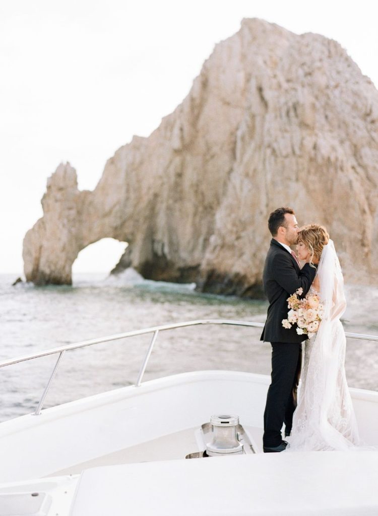 From the planner: “While we wanted to create something magical, we also wanted it to feel real. Day one, we shot the beachside ceremony and courtyard reception. After a group effort of setting up the table with a Tono & Co linen runner, gold flatware, and the most beautiful arrangement of blooms (some picked from the florist’s personal garden), we lit the candles, and Sophie began shooting her magic. The “wedding guests” enjoyed eating all the beautiful gourmet foods and drinks prepared by Diamante’s head chef. After our mock reception, we headed over to the beach. While the sea of insane flowers installed at the altar made it feel like a dream. As the sun was setting, the ocean roaring, and wind blowing, we shot the ceremony. We captured some great moments of our local couple, Gaby and Andres. To finish it off, we got to set sail with our bride and groom on The Mick Yacht, often used by Diamante for sunset cruises. We were able to get shots of our couple in front of The Arch!”