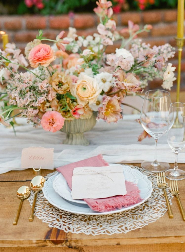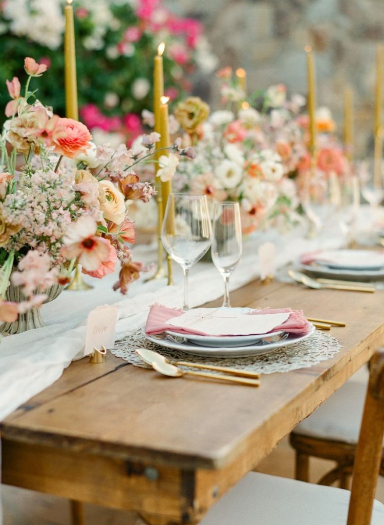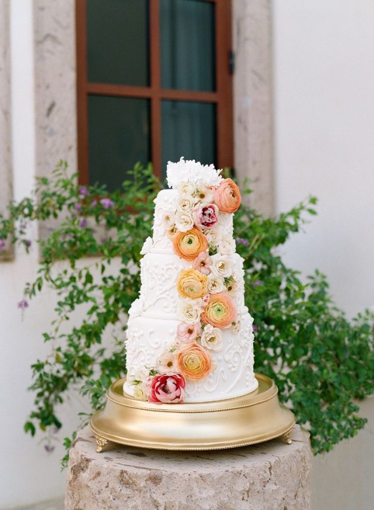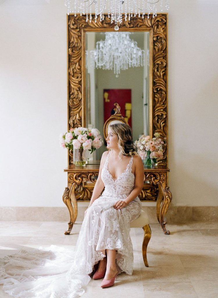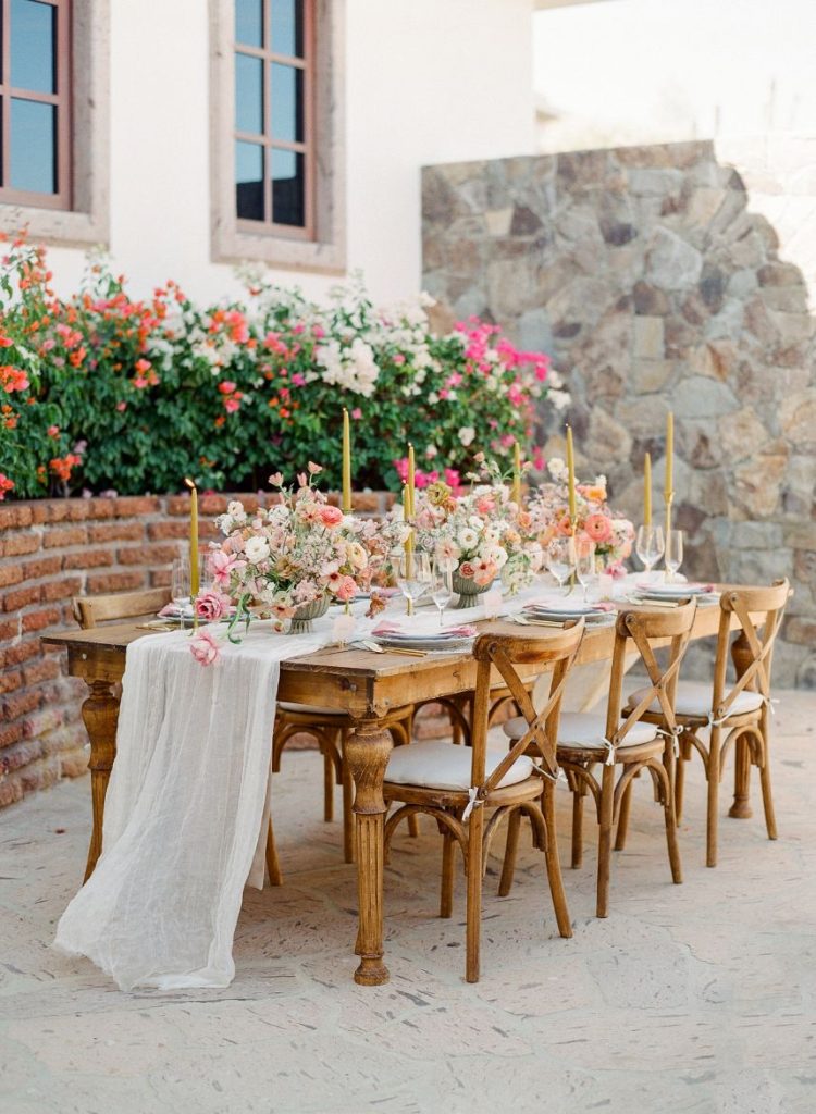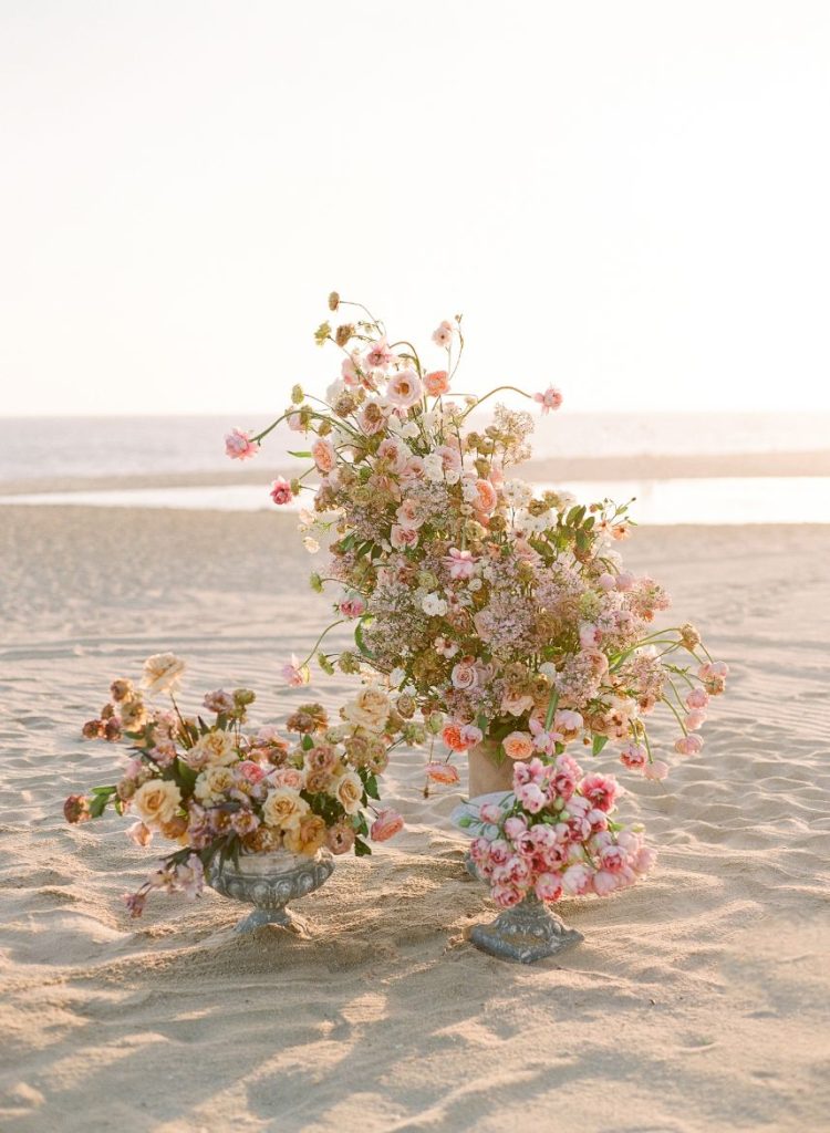 From the planner: “While we wanted to create something magical, we also wanted it to feel real. Day one, we shot the beachside ceremony and courtyard reception. After a group effort of setting up the table with a Tono & Co linen runner, gold flatware, and the most beautiful arrangement of blooms (some picked from the florist’s personal garden), we lit the candles, and Sophie began shooting her magic. The “wedding guests” enjoyed eating all the beautiful gourmet foods and drinks prepared by Diamante’s head chef. After our mock reception, we headed over to the beach. While the sea of insane flowers installed at the altar made it feel like a dream. As the sun was setting, the ocean roaring, and wind blowing, we shot the ceremony. We captured some great moments of our local couple, Gaby and Andres. To finish it off, we got to set sail with our bride and groom on The Mick Yacht, often used by Diamante for sunset cruises. We were able to get shots of our couple in front of The Arch!”