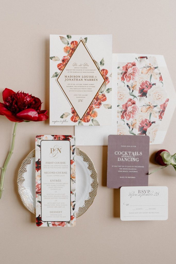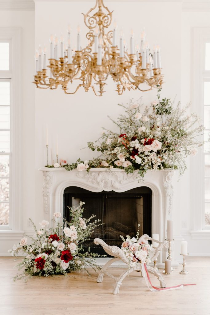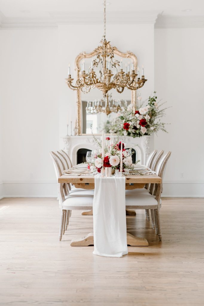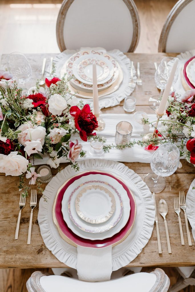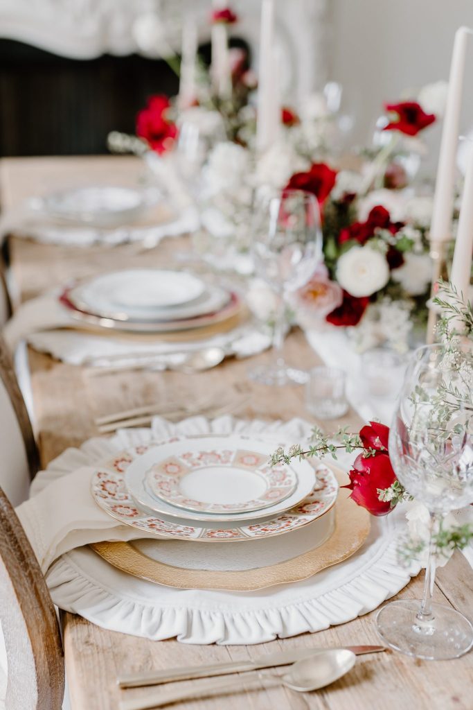 From Nanan with Event by OVA: “I love to come back to the traditional side of the winter season – high contrast with emerald green, holly berry red, and stark black and white. I love the overall setup and had a little crush on the abundant garden style of the tablescape. The blooms that are the most present in the design are Peonies, Garden roses, Standard roses and Ranunculus. I also added some structural elements like Japanese spirea to add some interest. I was always inspired first by the color palette – red in the winter feels warm and abundant – and this is what I tried to reproduce in a romantic, not traditional way, creating a garden feel that will carry the warm and abundant love of the Christmas season.”