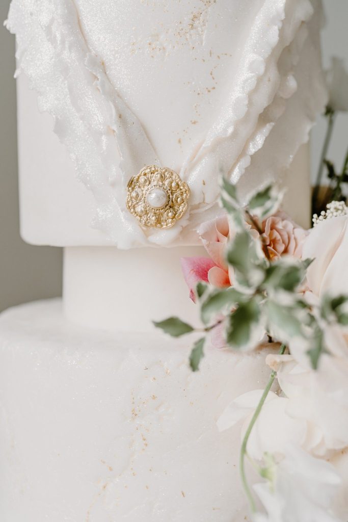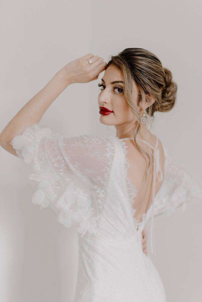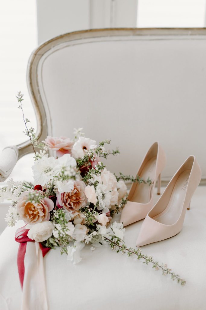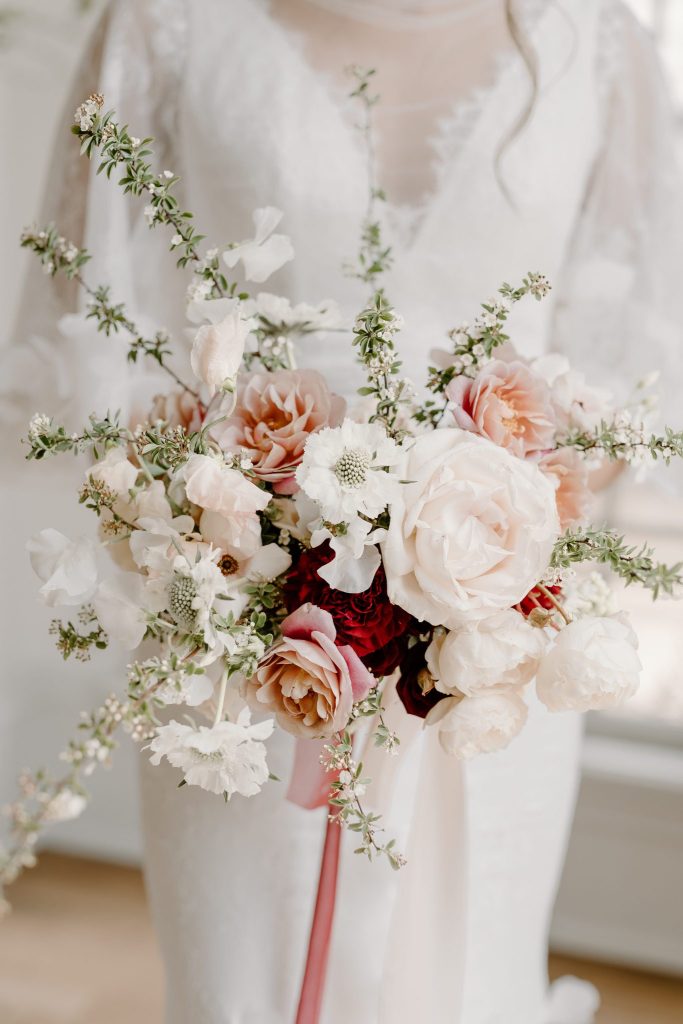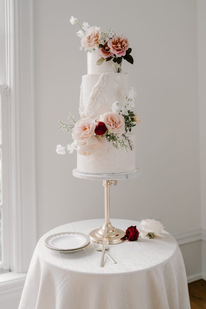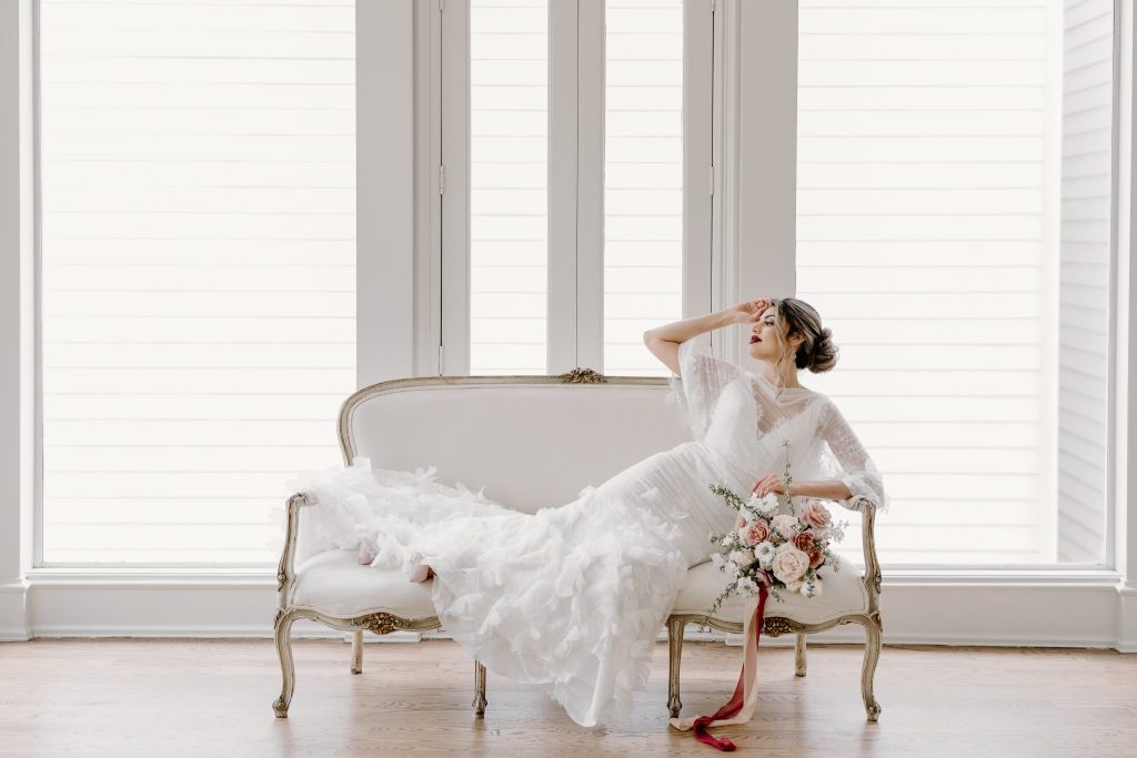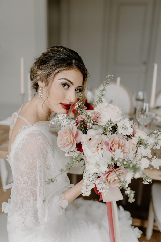 Some traditions are meant to be kept, while others are meant to be elevated over time – it’s safe to say this winter color palette inspo is the perfect mix of both! Showcasing the traditional high contrast color palette of emerald green, deep berry red and stark black and white, this weddingscape truly gets its unique abundant garden style feel from the gorgeous blooms by Event by OVA. Peonies, ranunculus and both garden and standard roses adorn this tablescape, as well as perfectly curated place settings from Bering’s that bring in the warm, romantic feels brought on by the holidays in crisp details. Striking in a bold red lip, our bride embodies the classic winter bridal look – with face-framing curls and moody makeup look from Pearl & Co. Artistry complimenting all too-well her stunning gown from Belle Âme Bridal with snow drift-esque elements. Combining every unique and traditional detail of this editorial into one, Alchemy Bake Lab‘s three-tiered cake is truly unlike anything we’ve ever seen before in the best way possible. The all-white setting of The Creative Chateau and the bright photography style of Erika Geier Photography resulted in a flawlessly captured scene that has us endlessly scrolling! You don’t want to miss all of the details featured below as well as reading Event by Ova‘s inspiration for this wintery shoot. Cheers!