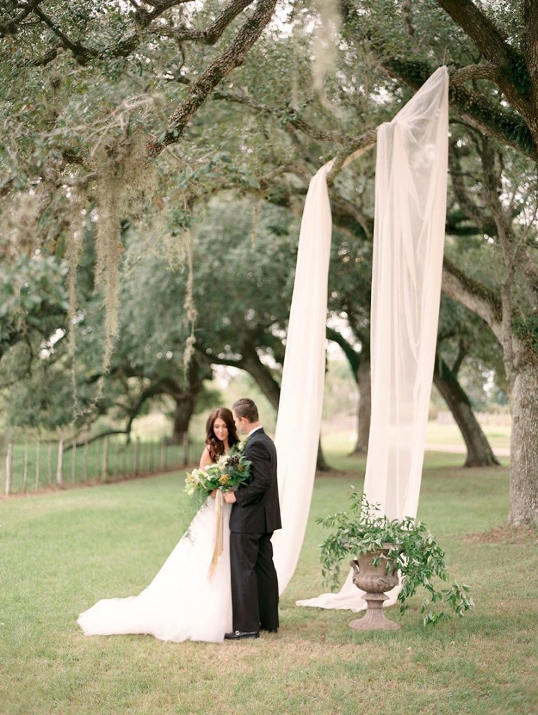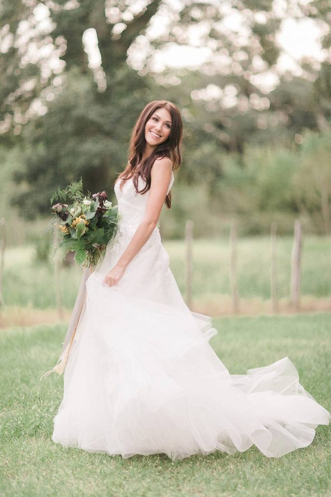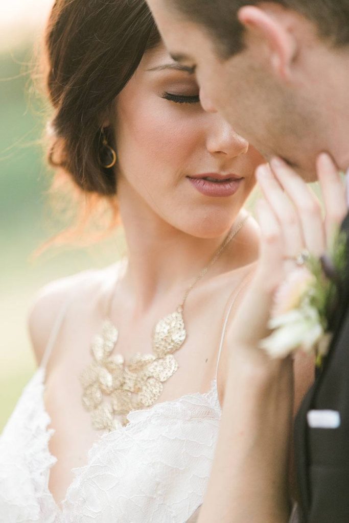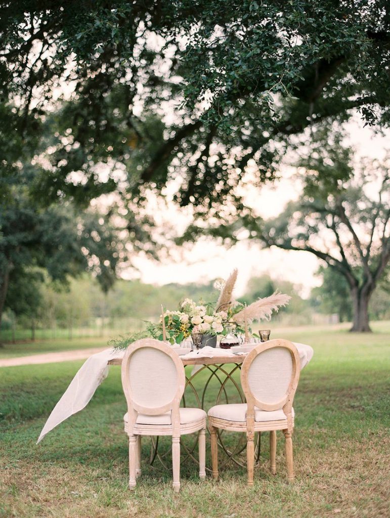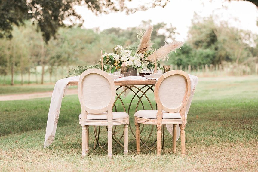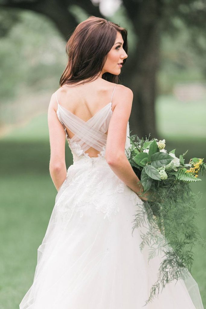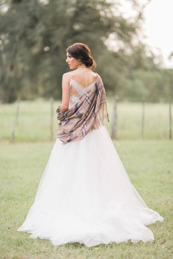 From the genius work of Houston wedding photography duo Luke & Cat‘s recent Life and Craft Workshop comes the blissfully romantic wedding inspiration we never knew we were missing in this soft neutrals styled shoot, designed by Two be Wed. Inspired by ideals of nature, simplicity and pastoral elements, the team used a soft color palette and delicate design details to keep the focus on the romance between the model couple. Taking a cue from the sprawling outdoor setting, Bramble & Bee created a fresh bouquet and table arrangement piece to mimic the idea of a wildflower bunch filled with overgrown greenery, classic white daisies, wispy-like feather stems and ivory and yellow floral buds. The table was set to maintain the same simplistic approach, using white linens and striped place setting napkins matched with setting-appropriate decor like feather place card holders and even a tree-bark like cake stand! Buttercup Bakery created a sweet three-tiered cake in coordinating hues of pale powder blue, gold and ivory, topped with sprigs of greenery and fresh rose blooms and floral buds. To create a look equally romantic yet minimal for the model bride, Hey Lovely Makeup created soft, bendable waves to frame her face that were easily swept back into an easy, low bun to create a more ethereal beauty look. Her makeup was kept natural with a focus on a warm cheek tint and thick, full lashes. Her swoon-worthy lace and tulle criss-crossed back gown from Now and Forever Bridal Boutique was accessorized with an intricate metal plated necklace and an airy plaid shawl. Chock-full of delightful nature-focused details and fresh neutral hues, we can’t get enough from this gorgeous shoot!
