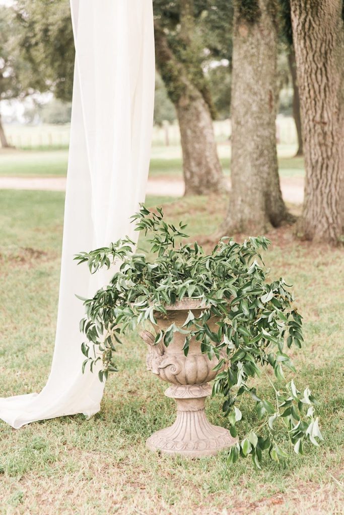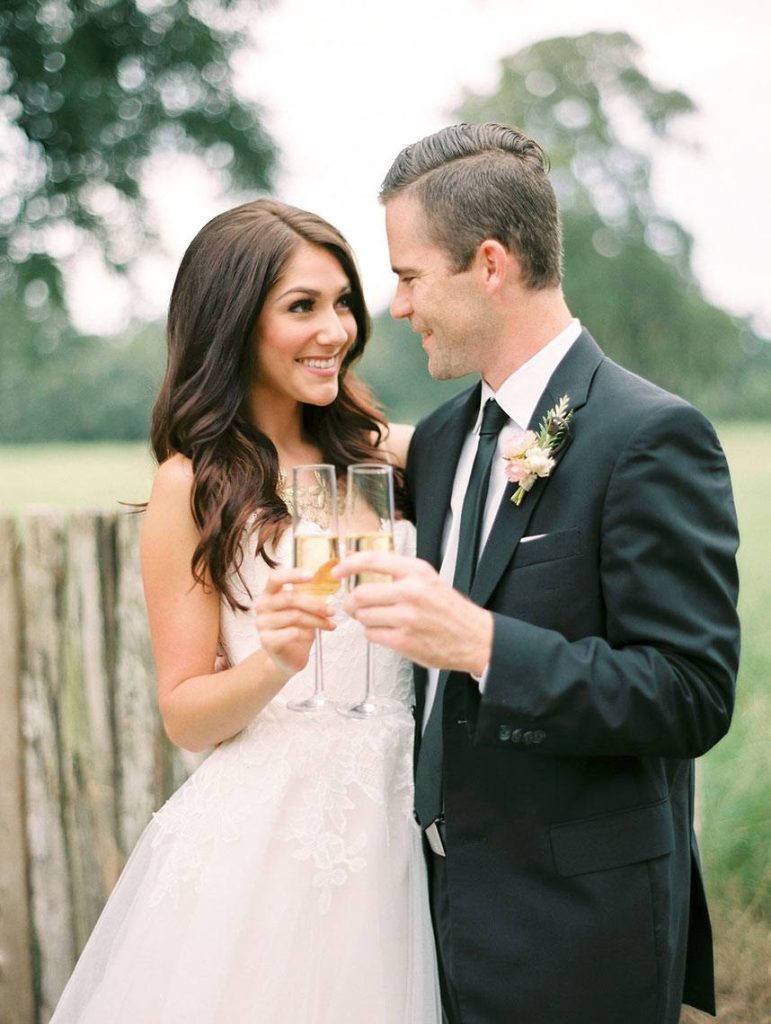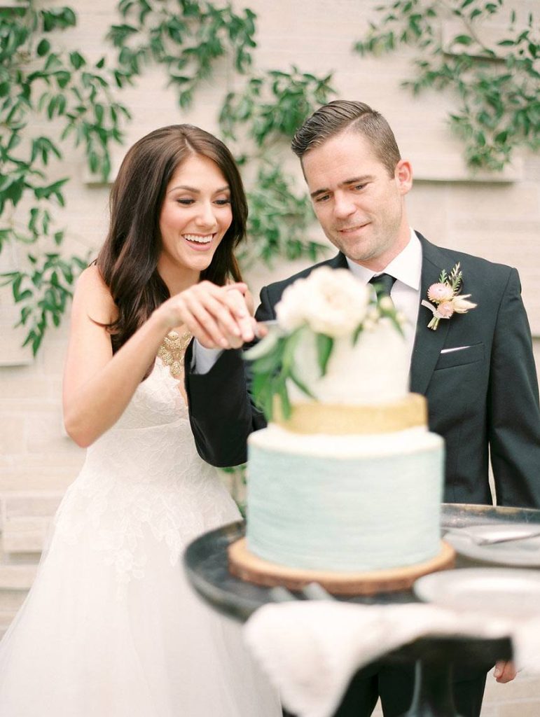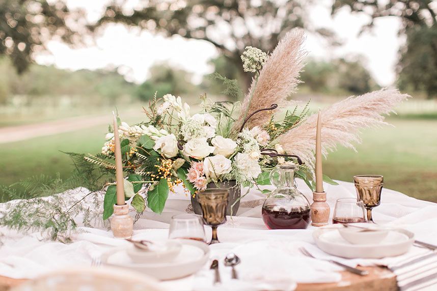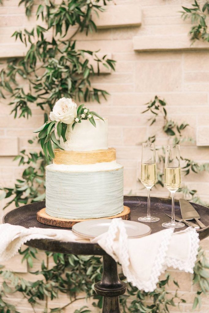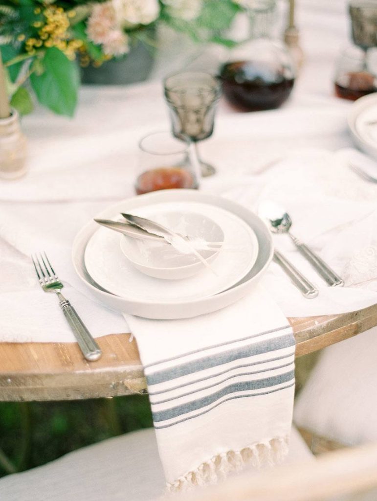 From the genius work of Houston wedding photography duo Luke & Cat‘s recent Life and Craft Workshop comes the blissfully romantic wedding inspiration we never knew we were missing in this soft neutrals styled shoot, designed by Two be Wed. Inspired by ideals of nature, simplicity and pastoral elements, the team used a soft color palette and delicate design details to keep the focus on the romance between the model couple. Taking a cue from the sprawling outdoor setting, Bramble & Bee created a fresh bouquet and table arrangement piece to mimic the idea of a wildflower bunch filled with overgrown greenery, classic white daisies, wispy-like feather stems and ivory and yellow floral buds. The table was set to maintain the same simplistic approach, using white linens and striped place setting napkins matched with setting-appropriate decor like feather place card holders and even a tree-bark like cake stand! Buttercup Bakery created a sweet three-tiered cake in coordinating hues of pale powder blue, gold and ivory, topped with sprigs of greenery and fresh rose blooms and floral buds. To create a look equally romantic yet minimal for the model bride, Hey Lovely Makeup created soft, bendable waves to frame her face that were easily swept back into an easy, low bun to create a more ethereal beauty look. Her makeup was kept natural with a focus on a warm cheek tint and thick, full lashes. Her swoon-worthy lace and tulle criss-crossed back gown from Now and Forever Bridal Boutique was accessorized with an intricate metal plated necklace and an airy plaid shawl. Chock-full of delightful nature-focused details and fresh neutral hues, we can’t get enough from this gorgeous shoot!