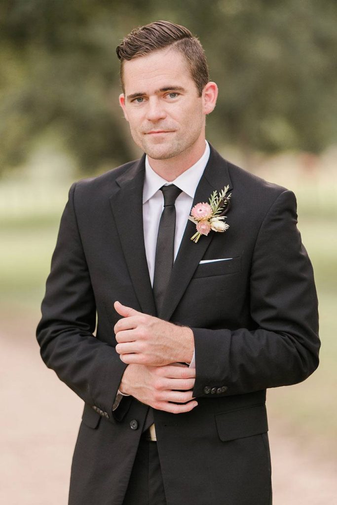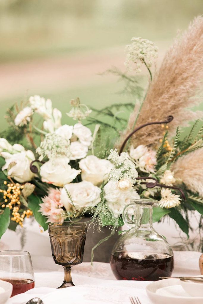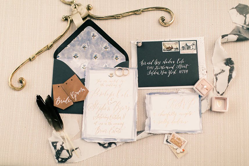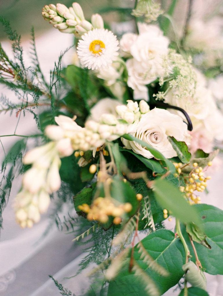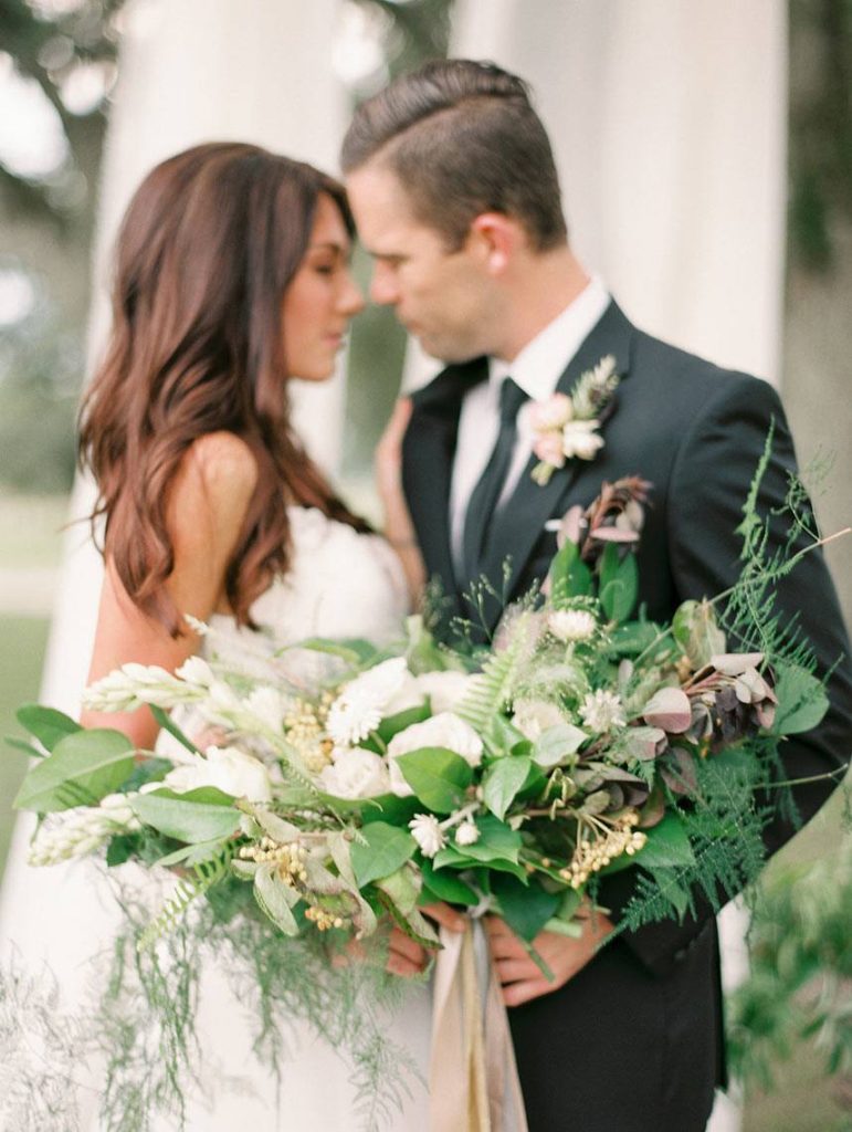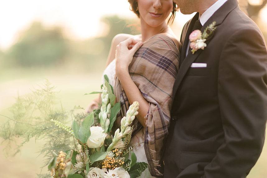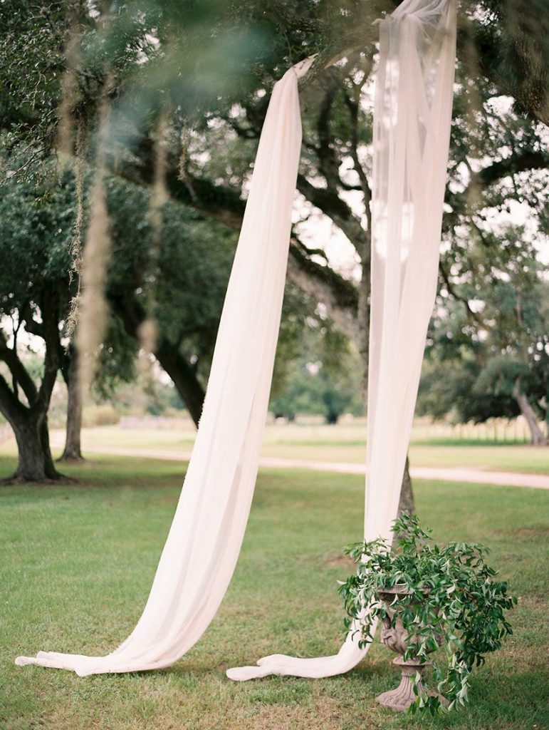 From the genius work of Houston wedding photography duo Luke & Cat‘s recent Life and Craft Workshop comes the blissfully romantic wedding inspiration we never knew we were missing in this soft neutrals styled shoot, designed by Two be Wed. Inspired by ideals of nature, simplicity and pastoral elements, the team used a soft color palette and delicate design details to keep the focus on the romance between the model couple. Taking a cue from the sprawling outdoor setting, Bramble & Bee created a fresh bouquet and table arrangement piece to mimic the idea of a wildflower bunch filled with overgrown greenery, classic white daisies, wispy-like feather stems and ivory and yellow floral buds. The table was set to maintain the same simplistic approach, using white linens and striped place setting napkins matched with setting-appropriate decor like feather place card holders and even a tree-bark like cake stand! Buttercup Bakery created a sweet three-tiered cake in coordinating hues of pale powder blue, gold and ivory, topped with sprigs of greenery and fresh rose blooms and floral buds. To create a look equally romantic yet minimal for the model bride, Hey Lovely Makeup created soft, bendable waves to frame her face that were easily swept back into an easy, low bun to create a more ethereal beauty look. Her makeup was kept natural with a focus on a warm cheek tint and thick, full lashes. Her swoon-worthy lace and tulle criss-crossed back gown from Now and Forever Bridal Boutique was accessorized with an intricate metal plated necklace and an airy plaid shawl. Chock-full of delightful nature-focused details and fresh neutral hues, we can’t get enough from this gorgeous shoot!