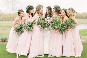 From the genius work of Houston wedding photography duo Luke & Cat‘s recent Life and Craft Workshop comes the blissfully romantic wedding inspiration we never knew we were missing in this soft neutrals styled shoot, designed by Two be Wed. Inspired by ideals of nature, simplicity and pastoral elements, the team used a soft color palette and delicate design details to keep the focus on the romance between the model couple. Taking a cue from the sprawling outdoor setting, Bramble & Bee created a fresh bouquet and table arrangement piece to mimic the idea of a wildflower bunch filled with overgrown greenery, classic white daisies, wispy-like feather stems and ivory and yellow floral buds. The table was set to maintain the same simplistic approach, using white linens and striped place setting napkins matched with setting-appropriate decor like feather place card holders and even a tree-bark like cake stand! Buttercup Bakery created a sweet three-tiered cake in coordinating hues of pale powder blue, gold and ivory, topped with sprigs of greenery and fresh rose blooms and floral buds. To create a look equally romantic yet minimal for the model bride, Hey Lovely Makeup created soft, bendable waves to frame her face that were easily swept back into an easy, low bun to create a more ethereal beauty look. Her makeup was kept natural with a focus on a warm cheek tint and thick, full lashes. Her swoon-worthy lace and tulle criss-crossed back gown from Now and Forever Bridal Boutique was accessorized with an intricate metal plated necklace and an airy plaid shawl. Chock-full of delightful nature-focused details and fresh neutral hues, we can’t get enough from this gorgeous shoot!