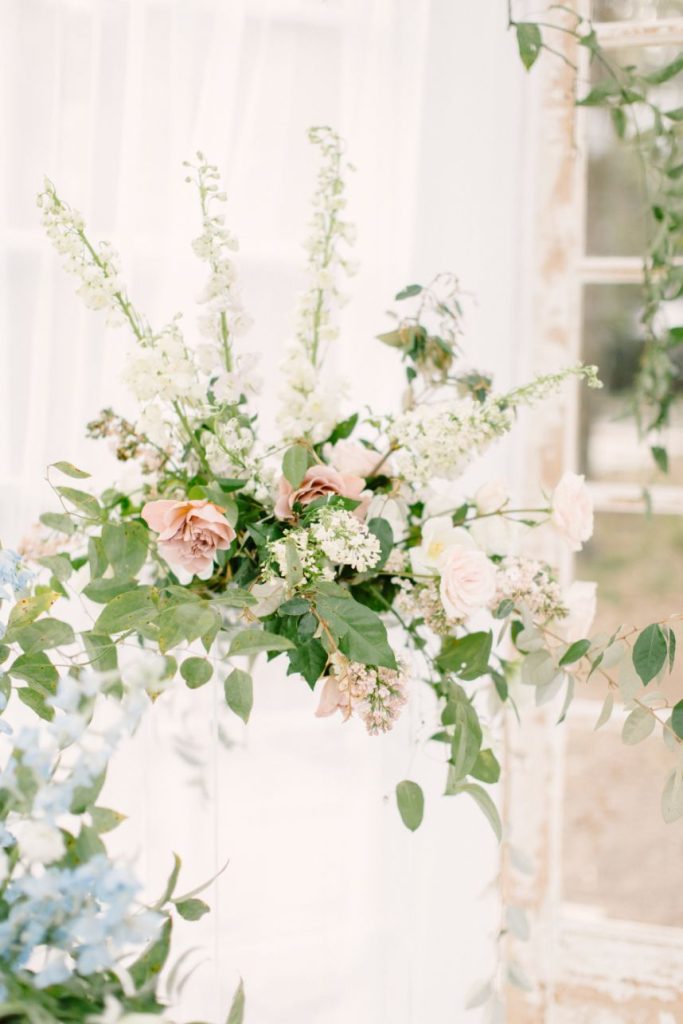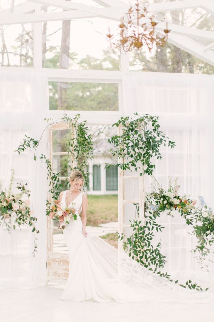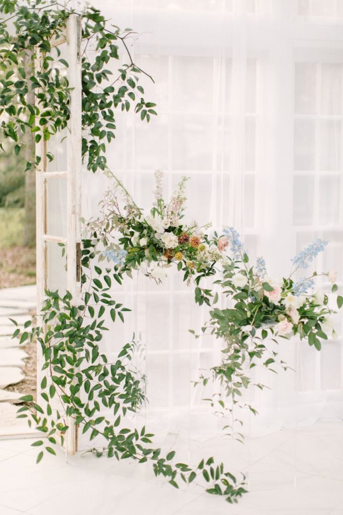Movement is communicated through the arrangements sitting on acrylic pedestals by the beautiful antique French doors. Naturally, we wanted to use these natural elements to guide our viewer’s eyes to various points of interest. First, the bride, her bouquet, and the greenery that frames and drapes above her. Second, the subtle colors that contrast each other in the arrangements themselves. Lastly, the circular motion created on the right through the intentional layering of greenery at the bottom of the door.