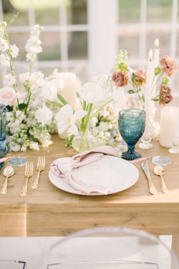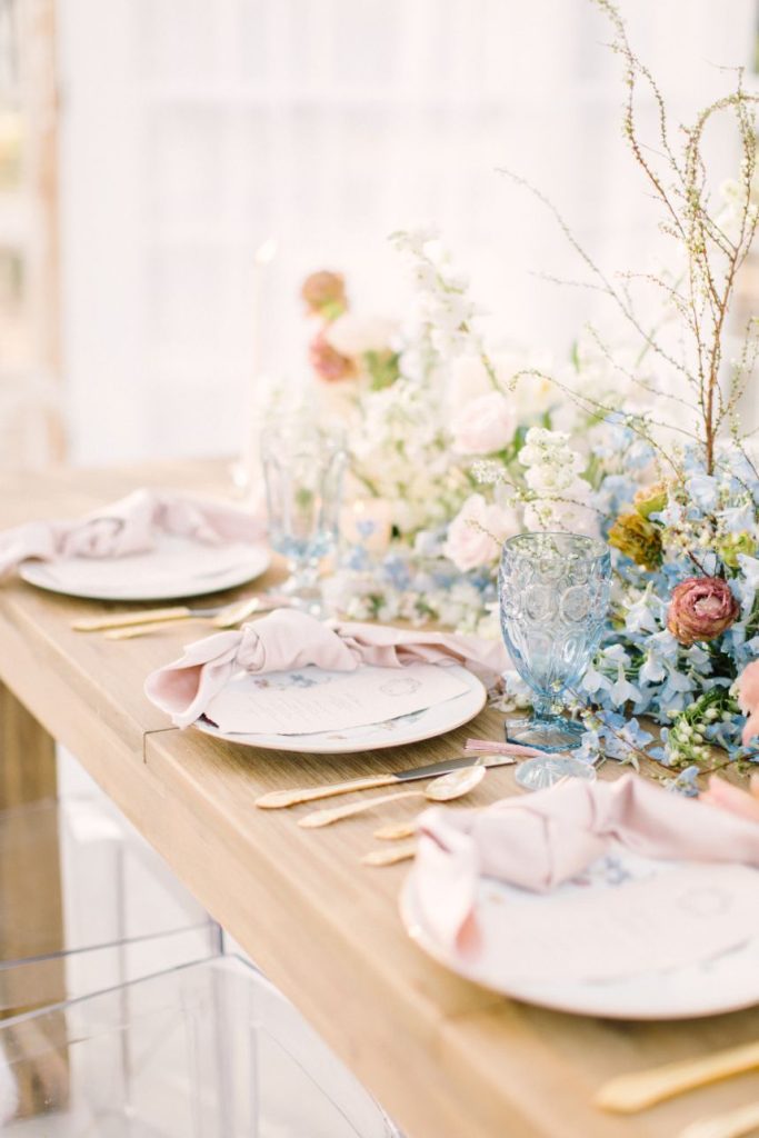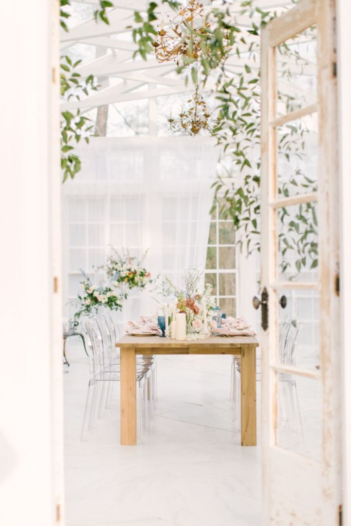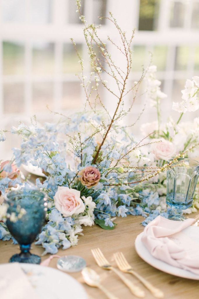 Delicate, feminine details are the center of attention in this stunningly sophisticated wedding inspiration! Between the flowers and this incredible color palette, both work to create so much elegance and class in this styled shoot. This model looks almost too good to be true, clad in a gorgeous deep V-neck gown from Belle Âme Bridal with the prettiest illusion open back. Tablescapes in this glass house are perfectly accented with blue glass, incredible pieces from Oliver and Penelope Vintage, plus the sweetest silky blush linens from EB Inc. Event Rentals that totally elevate this curated shoot. Drawing inspiration from natural elements and soft shades of pink and blues, there is no shortage of opulent design in this sophisticated wedding inspiration! Read on to hear a note from the planner of the shoot about its inspiration and the thought behind its elegant design. Cheers!