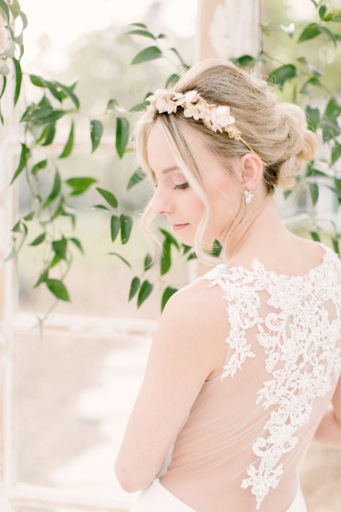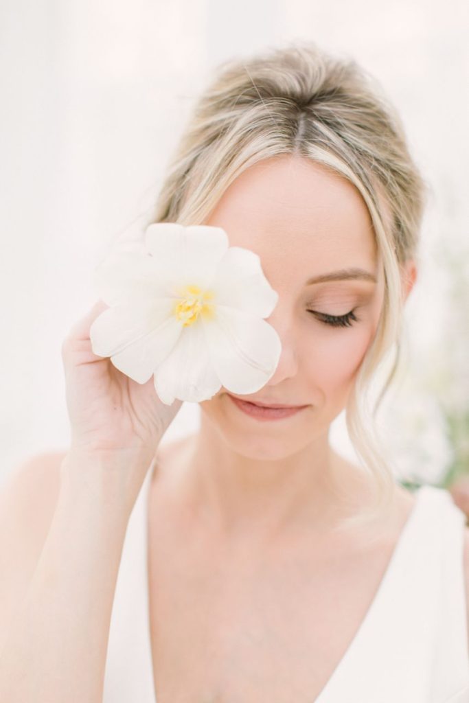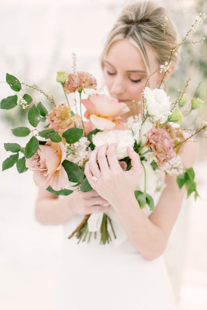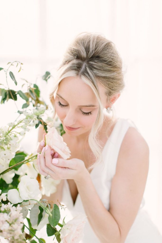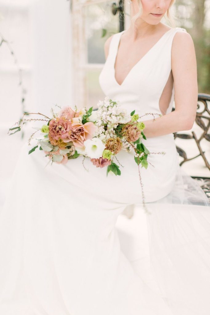 Delicate, feminine details are the center of attention in this stunningly sophisticated wedding inspiration! Between the flowers and this incredible color palette, both work to create so much elegance and class in this styled shoot. This model looks almost too good to be true, clad in a gorgeous deep V-neck gown from Belle Âme Bridal with the prettiest illusion open back. Tablescapes in this glass house are perfectly accented with blue glass, incredible pieces from Oliver and Penelope Vintage, plus the sweetest silky blush linens from EB Inc. Event Rentals that totally elevate this curated shoot. Drawing inspiration from natural elements and soft shades of pink and blues, there is no shortage of opulent design in this sophisticated wedding inspiration! Read on to hear a note from the planner of the shoot about its inspiration and the thought behind its elegant design. Cheers!