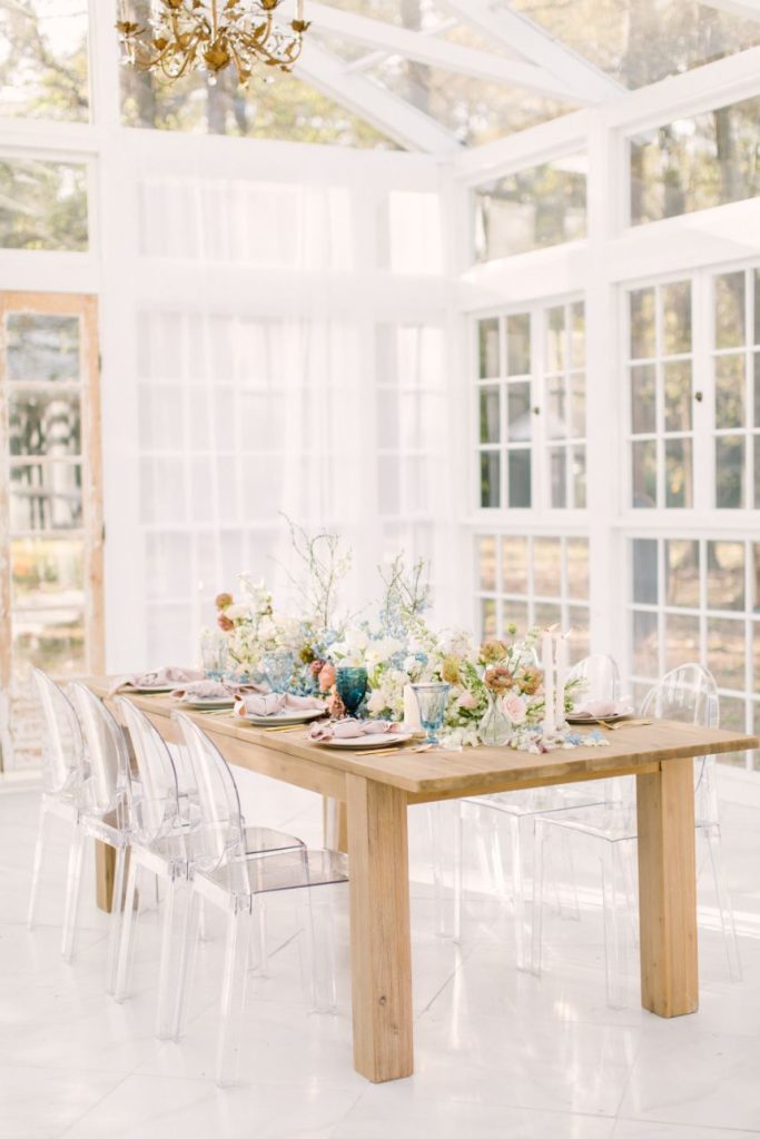 From the planner, LoveLee Experiences: “The inspiration originated from the newly constructed glass house with its delicate design. We wanted to maintain that delicacy by embedding soft colors that gradually transition from pops of blues to various hues of pink as your eyes move from one frame to another.