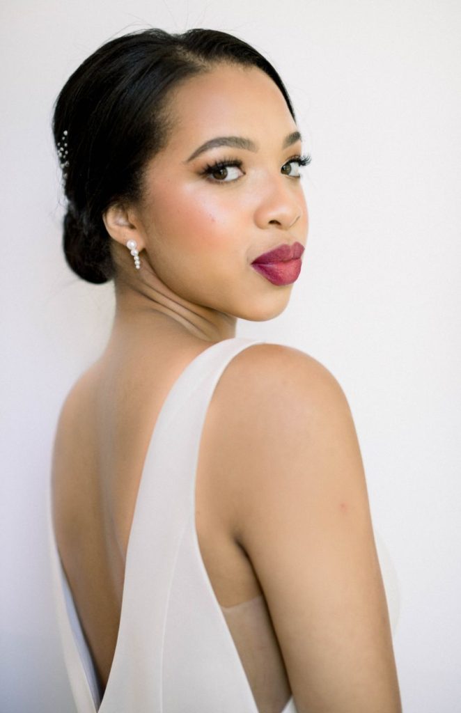 From the hair and makeup artists with Glow + Grace Artistry: “We immediately knew we wanted an elegant but soft-focused, romantic look that would compliment the white florals and overall feel of the shoot. We kept the eyes simple, with subtle, shimmery bronze and cocoa shades to compliment and highlight Amber’s beautiful skin with a pop of powder liner to define her lash line for amplified effect. For Amber’s complexion, we wanted her to have that ‘no makeup’ makeup with a glowy complexion, subtle contour and hues of a mauvy-toned blush to highlight how BEAUTIFUL her skin was. To balance the look and make sure there was a pop somewhere without overpowering the vision of the shoot, we decided to add a ‘bold-ish’ lip with muted berry tones. Amber already has gorgeous, full lips so I decided an ‘ombre’ styled lip would be best– I applied richer mulberry liner to the outer corners of her mouth, and gradually lightened the depth of the berry moving towards the center of the lips until it was finished with Maybelline’s Baddest Beige lipstick in the center to create the perfect pout.