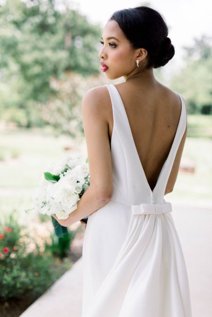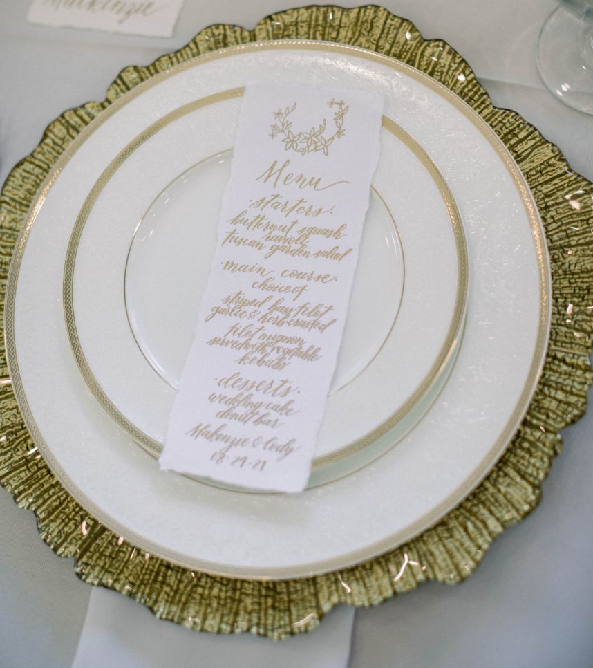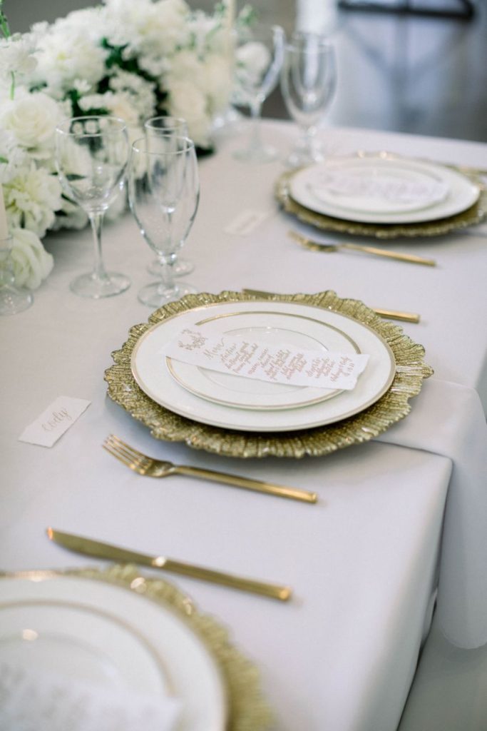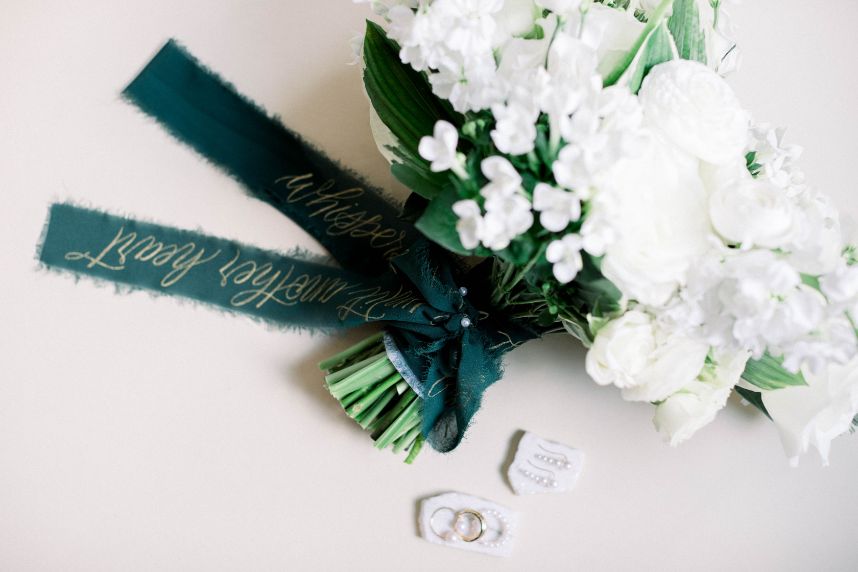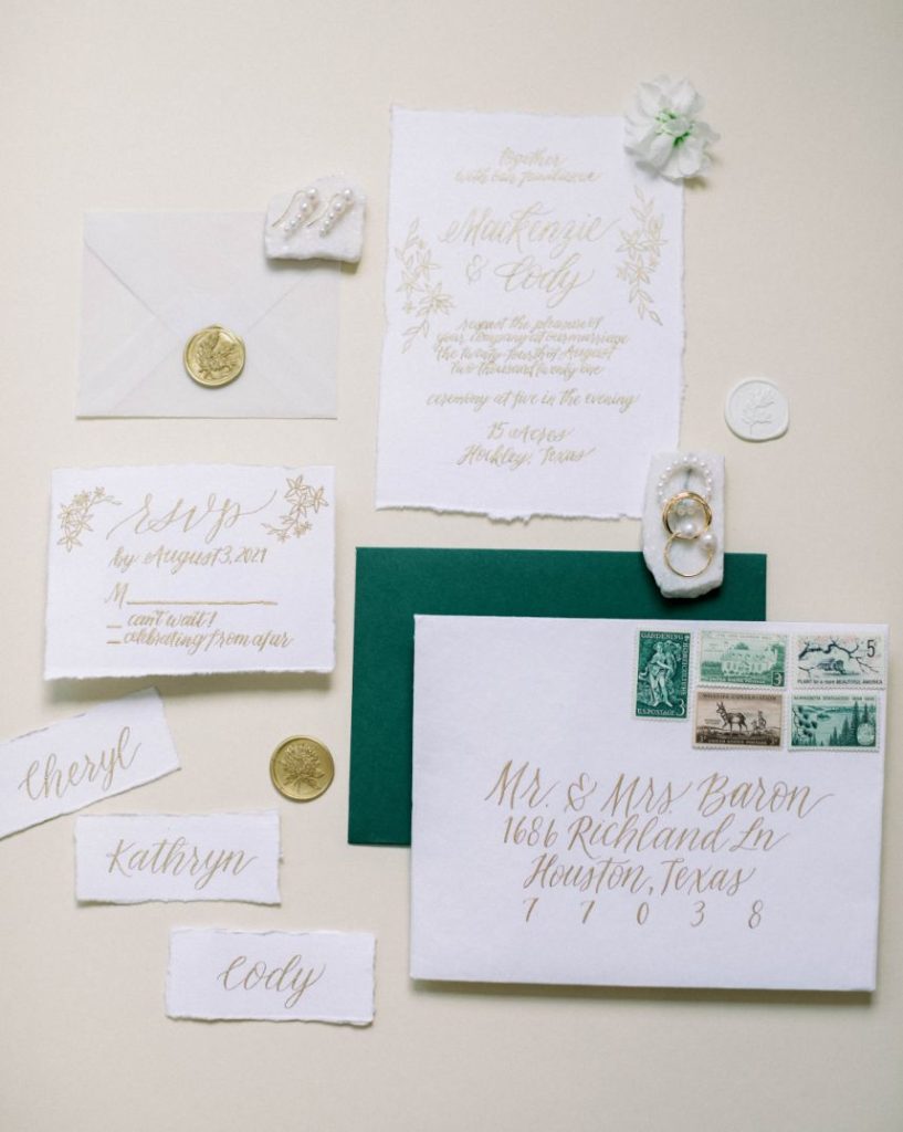 Looking for a guide to classic chic wedding style? Look no further! This captivating wedding editorial plays out in a perfect nod to timeless deco style at 15 Acres, a stunning, clean open-concept venue that works well with any theme or color scheme you choose. Green and gold work together in unison to give a stately vibe with down-to-earth details like hand-lettering by She Made it Like That, LLC on invitations, menus, and so much more. Nothing says classic bridal beauty quite like a bold red lip and a low chignon styled by the talented hair and makeup artists at Glow + Grace Artistry who know how to create a timeless wedding look. Add one sleek satin gown from Modern Affinity Bridal with open back plus bow detail and you have yourself a bride! Your bouquet wrap is the perfect place to subtly incorporate a meaningful quote or lyric like the words scripted on this emerald ribbon in metallic ink. Monochrome petals from The Senterpiece make a lush and full bridal bouquet along with adding a captivating, romantic tone to reception tablescapes. Wow your guests with a multi-course place setting in gilded gold dinnerware from Avalon Event Rentals plus crisp clean linens and modern, round-back chairs to style the scene. See it all in symphony captured by Brandy Palacios Photography in the classic chic wedding gallery down below. Cheers!