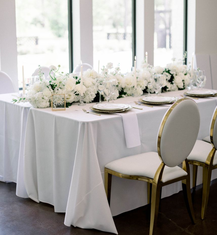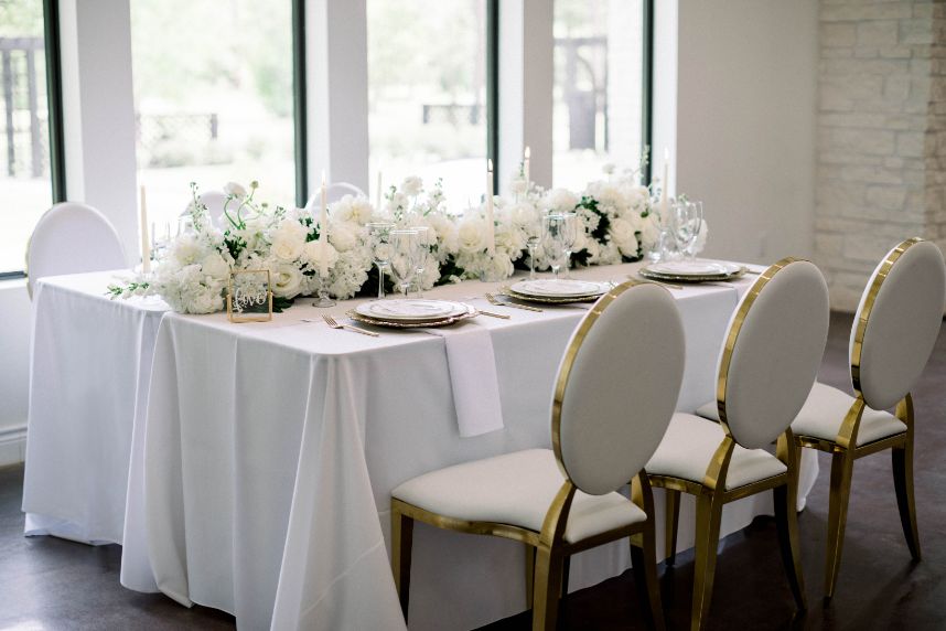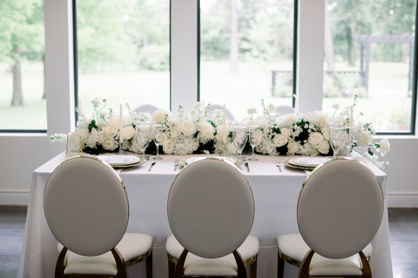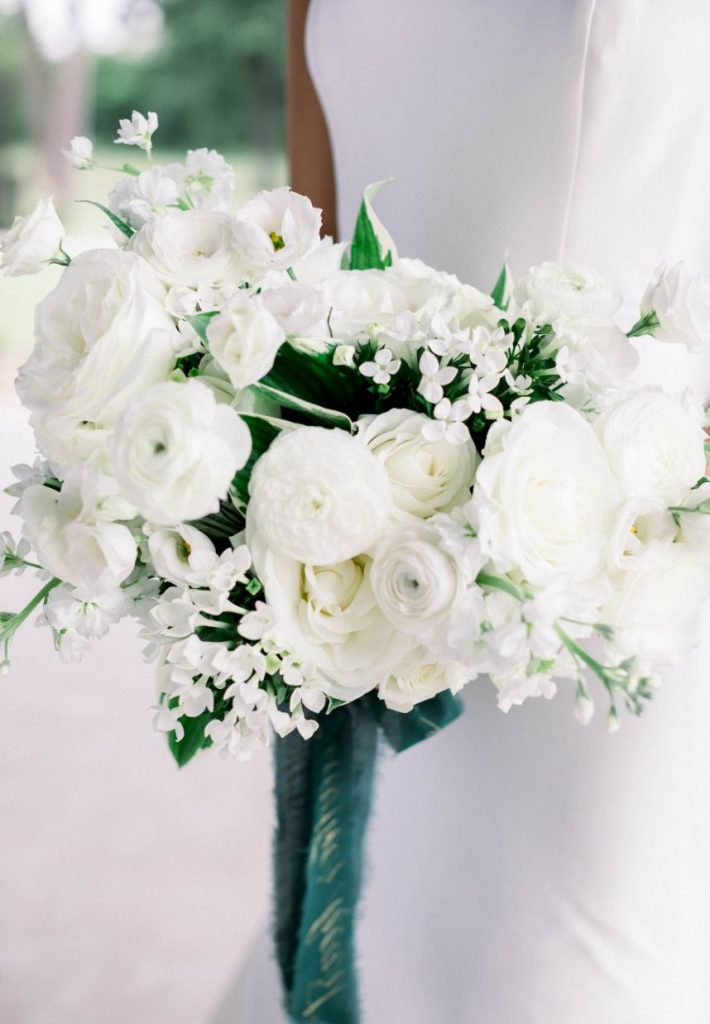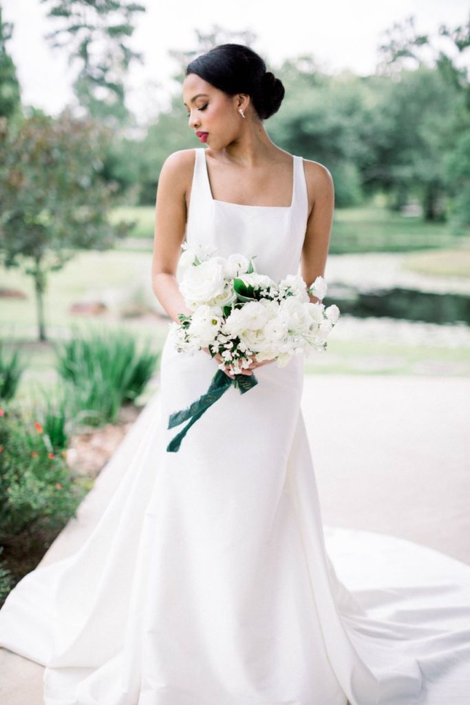 Looking for a guide to classic chic wedding style? Look no further! This captivating wedding editorial plays out in a perfect nod to timeless deco style at 15 Acres, a stunning, clean open-concept venue that works well with any theme or color scheme you choose. Green and gold work together in unison to give a stately vibe with down-to-earth details like hand-lettering by She Made it Like That, LLC on invitations, menus, and so much more. Nothing says classic bridal beauty quite like a bold red lip and a low chignon styled by the talented hair and makeup artists at Glow + Grace Artistry who know how to create a timeless wedding look. Add one sleek satin gown from Modern Affinity Bridal with open back plus bow detail and you have yourself a bride! Your bouquet wrap is the perfect place to subtly incorporate a meaningful quote or lyric like the words scripted on this emerald ribbon in metallic ink. Monochrome petals from The Senterpiece make a lush and full bridal bouquet along with adding a captivating, romantic tone to reception tablescapes. Wow your guests with a multi-course place setting in gilded gold dinnerware from Avalon Event Rentals plus crisp clean linens and modern, round-back chairs to style the scene. See it all in symphony captured by Brandy Palacios Photography in the classic chic wedding gallery down below. Cheers!
