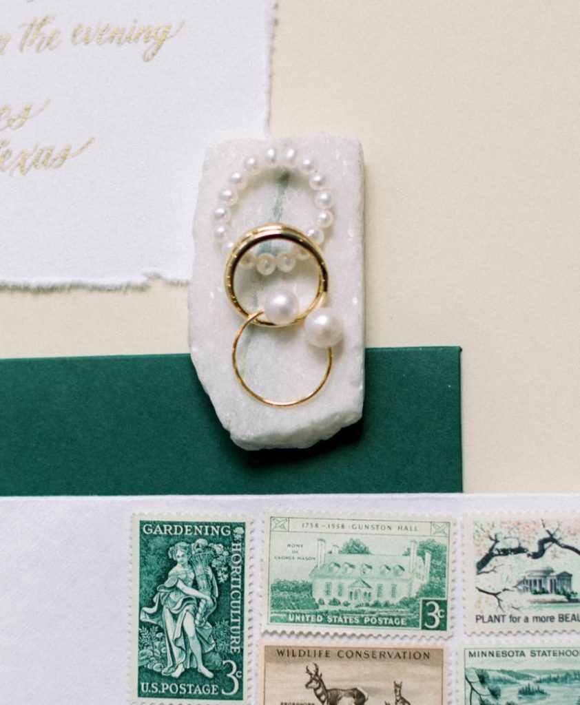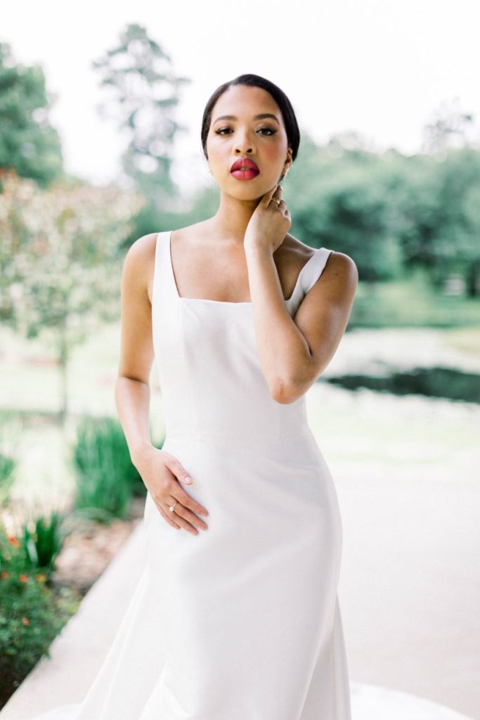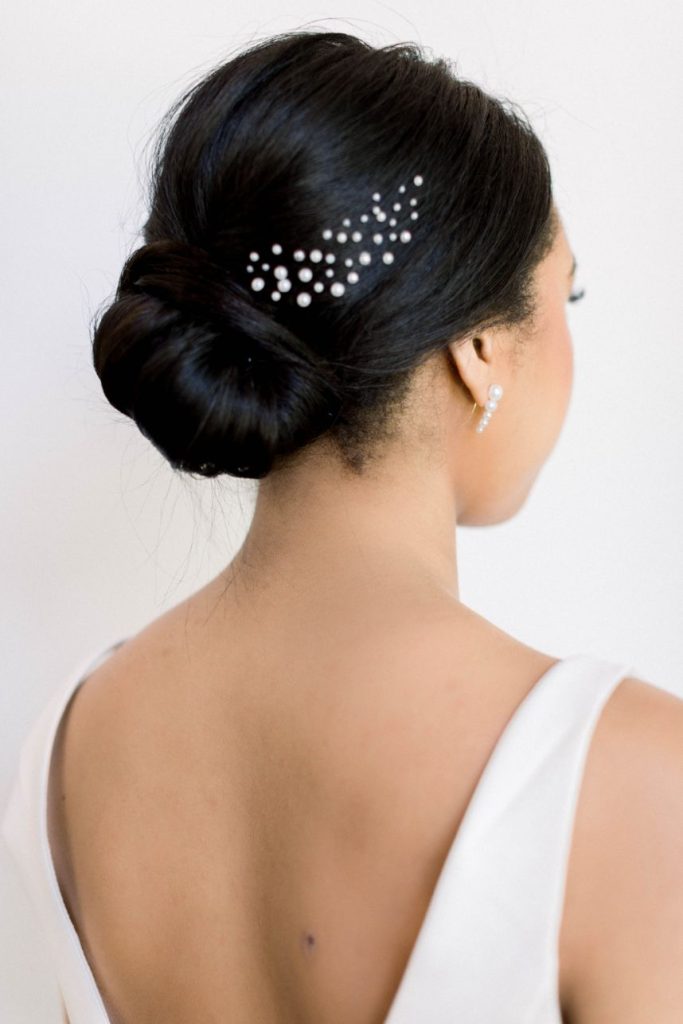 The hair was always intended to be a classic bridal favorite, but Lexi not only executed a polished, romantic chignon to coincide with the overall aesthetic of the shoot – She also chose to add an embellishment to elevate the simplicity of Amber’s updo. Lexi added delicate craft pearls in a starburst shape to one side of Amber’s chignon to complete her bridal updo, which was so fun and beautiful in an elegantly unique way!”