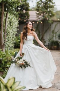 Take a look below at how our team of talented Houston vendors took a theme idea – an intimate European soirée – and brought each element together at the McGovern Centennial Gardens, from the palette to the place setting. Everything flows so well! The bride’s classic look features an off-the-shoulder gown from Belle Âme Bridal with a chic updo and radiant makeup by Hey Lovely. On the table, vintage place cards and menus by Half Moon Lettering pair perfectly with the simple floral place settings by Bering’s, and of course, flower-adorned desserts from Becca Cakes and Bonjour Brigadeiro. Fulleylove Photography‘s bright, timeless images preserve every detail beautifully. Scroll below for styling tips from each vendor!
