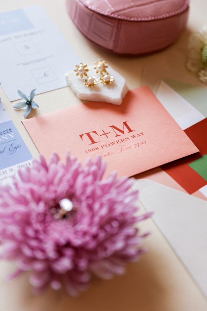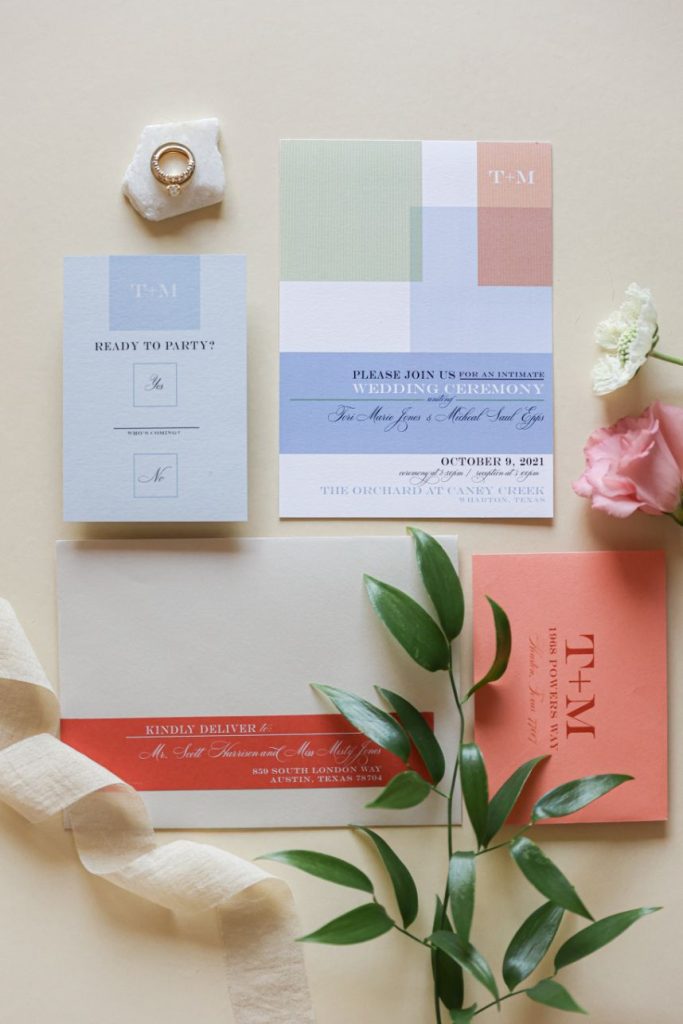 I also love abstract art so I incorporated the color palette into a fun combination of overlays, similar to Mondrian’s art. Even though he wasn’t an artist during this decade, it reminds me of that aesthetic. What I love about this design is that the color palette could change for any couple and become something soft and tonal with all the same shades. Or go a completely different direction with an autumn or winter color scheme. This was digitally flat printed, but it would also work with letterpress and be gorgeous.”
