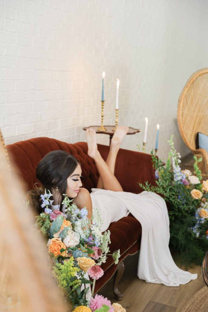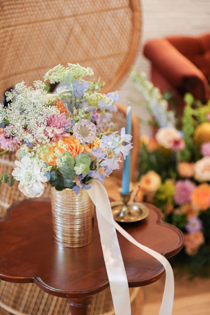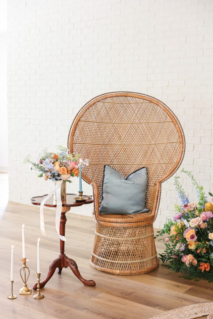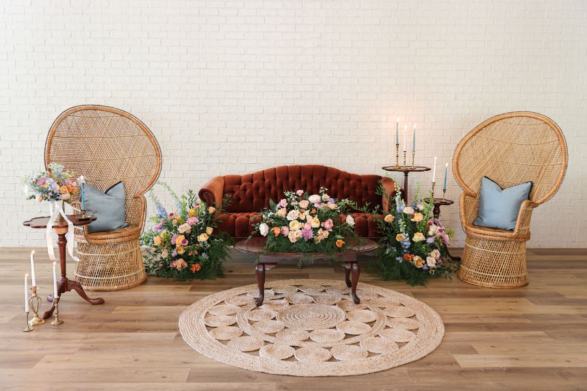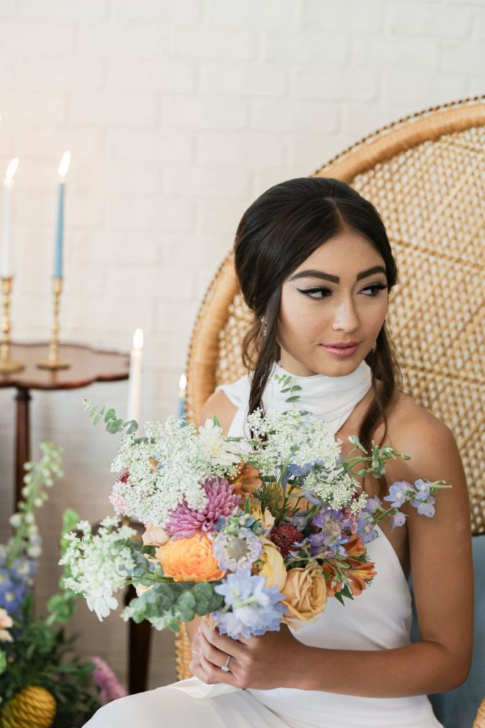 If your idea of a dream wedding involves some vintage sixties style or flower power, let us introduce the editorial inspiration for you. Meeker Pictures perfectly captured this mod sixties dream wedding where a palette of effervescent pastels was an obvious choice for this retro design. All eyes are drawn to a focal lounge scene set with nostalgic rattan décor from Junk in Love Events and rich velvet textures that make our hearts sing. The natural and luxe feel of these elements was a refreshing change for The Orchard at Caney Creek where a revival of mod hippie style is in full effect. Installations Holyoak Floral Design truly brought the flower power with whimsical blooms in the same muted pastel palette as this technicolor wedding cake created by Cake Conspiracy that’s giving all the sunburst vibes with its artful and cheery three-tiered goodness. Hair and makeup pro AH Specialties gave us a total Kacey Musgraves meets Priscilla Presley moment with a full lash and winged liner plus her volumized pony with a classic middle part. Our model stuns in a high-neck gown from Wanderlust Bridal Boutique that looks as if it’s straight out of Megan Draper’s closet and she pairs it with a stylish chiffon sash to match – a retro revival in a la mod accessories. Add a few more tasteful custom elements like a colorblock invitation suite from Jo’s Paper Kitchen with simplistic and playful details documented throughout this photo gallery, or see it captured in highlights by Still Productions Films – plus, read on for a note from just a few of the talented creatives that brought this upscale wedding editorial to life. Cheers!