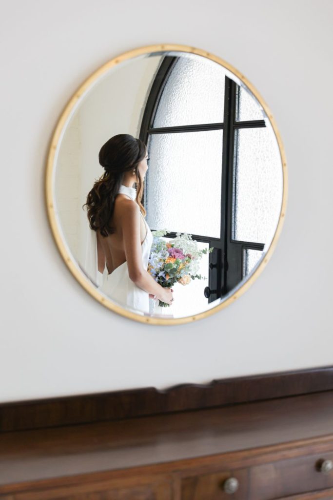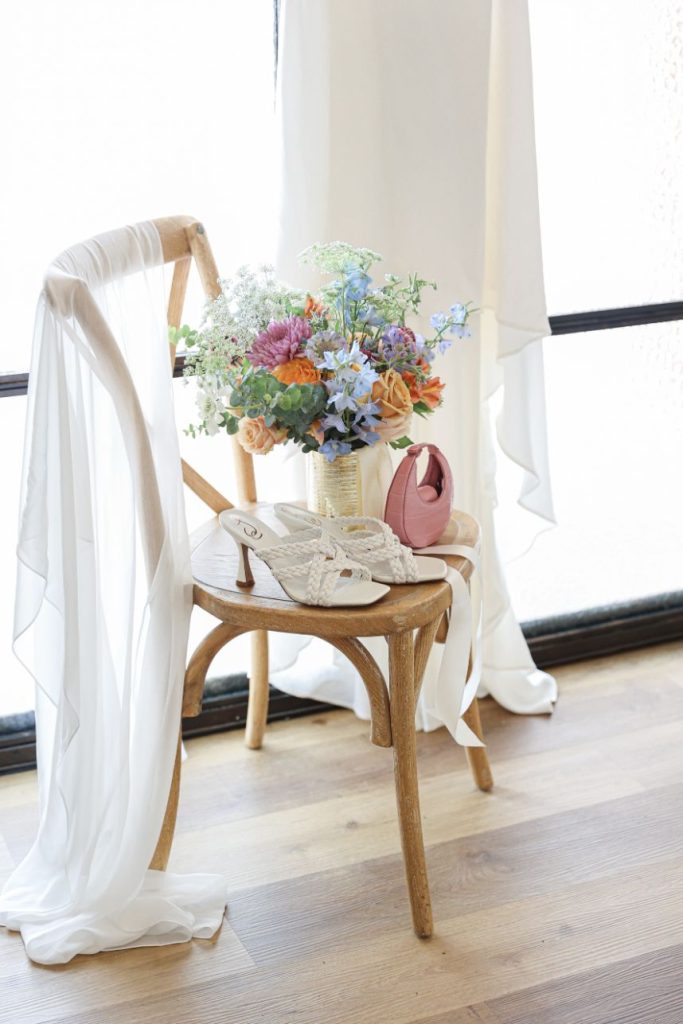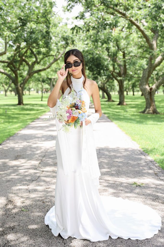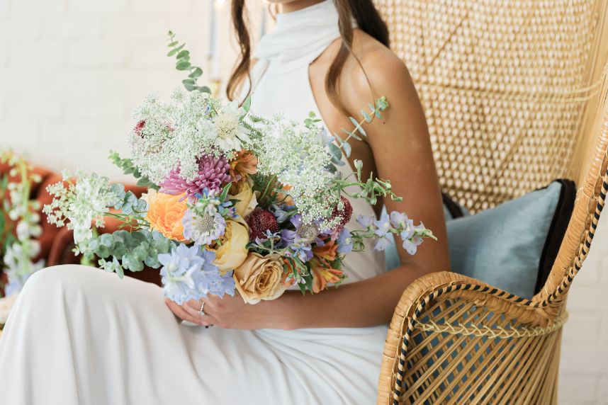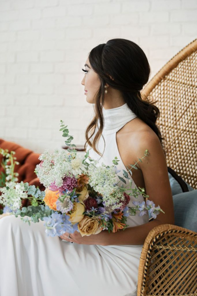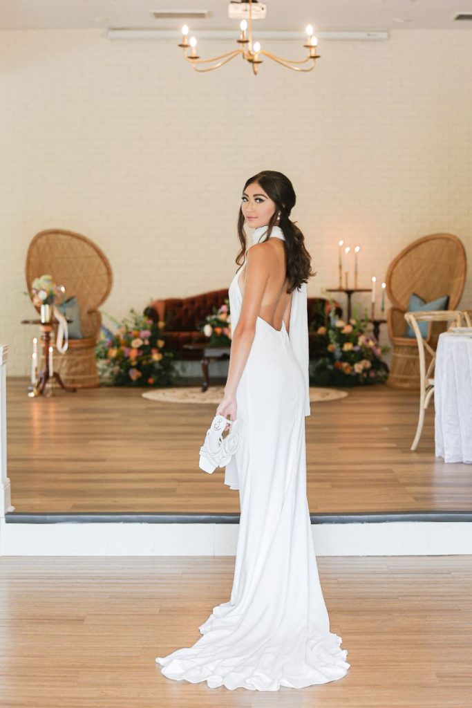 If your idea of a dream wedding involves some vintage sixties style or flower power, let us introduce the editorial inspiration for you. Meeker Pictures perfectly captured this mod sixties dream wedding where a palette of effervescent pastels was an obvious choice for this retro design. All eyes are drawn to a focal lounge scene set with nostalgic rattan décor from Junk in Love Events and rich velvet textures that make our hearts sing. The natural and luxe feel of these elements was a refreshing change for The Orchard at Caney Creek where a revival of mod hippie style is in full effect. Installations Holyoak Floral Design truly brought the flower power with whimsical blooms in the same muted pastel palette as this technicolor wedding cake created by Cake Conspiracy that’s giving all the sunburst vibes with its artful and cheery three-tiered goodness. Hair and makeup pro AH Specialties gave us a total Kacey Musgraves meets Priscilla Presley moment with a full lash and winged liner plus her volumized pony with a classic middle part. Our model stuns in a high-neck gown from Wanderlust Bridal Boutique that looks as if it’s straight out of Megan Draper’s closet and she pairs it with a stylish chiffon sash to match – a retro revival in a la mod accessories. Add a few more tasteful custom elements like a colorblock invitation suite from Jo’s Paper Kitchen with simplistic and playful details documented throughout this photo gallery, or see it captured in highlights by Still Productions Films – plus, read on for a note from just a few of the talented creatives that brought this upscale wedding editorial to life. Cheers!