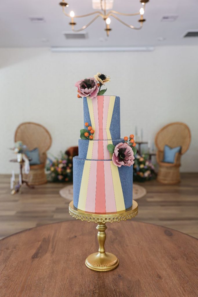 From the baker, Cheryl with Cake Conspiracy: “Whenever I have to create a design based on a specific time period, I always look to fabric and clothing from that era for inspiration. For this cake design, I chose a bold vintage pattern paired with muted tones and stretched them the height of the cake for the focal point. We then added some multicolor texture to the rest of the design in bell-bottom blue to provide interest all the way around the cake. That last bit of 60s ‘flower power’ was added in the way of a few handmade sugar poppies and hypericum berries. I absolutely love designing colorful, unconventional wedding cakes. I get the distinct impression that most couples are reluctant to break out of the traditional white wedding cake mold, but I say ‘be you!’ Be bold, and make your cake exactly what you dream it can be!”