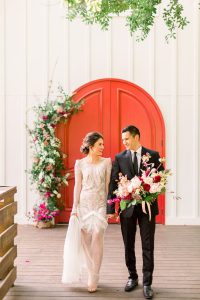 Mixing romance, bold hues and sweet “Texas Charm” comes this gorgeous editorial prominently displaying elegant southern wedding inspiration at Briscoe Manor! Capturing all the magic of this swoon-worthy shoot, Catherine Smeader Photography was behind the lens at the gorgeous venue, featuring a sprawling property accented by enormous pecan trees, ponds and classic Texas limestone-prominent architecture. Filling the bride’s bouquet and table arrangements, Ode to Joy combined lush crimson, blush and ivory hued blooms for a bold yet romantic feel. Fully embodying elegance and timeless glamour, the model bride wore a stunning, body skimming lace bodice gown from The Princess Bridal and completed her look with full lashes, a bold lip and an ethereal updo by Tousled + Teased. Scroll on for more sweet Southern wedding charm and read more on the fabulous Briscoe Manor below!