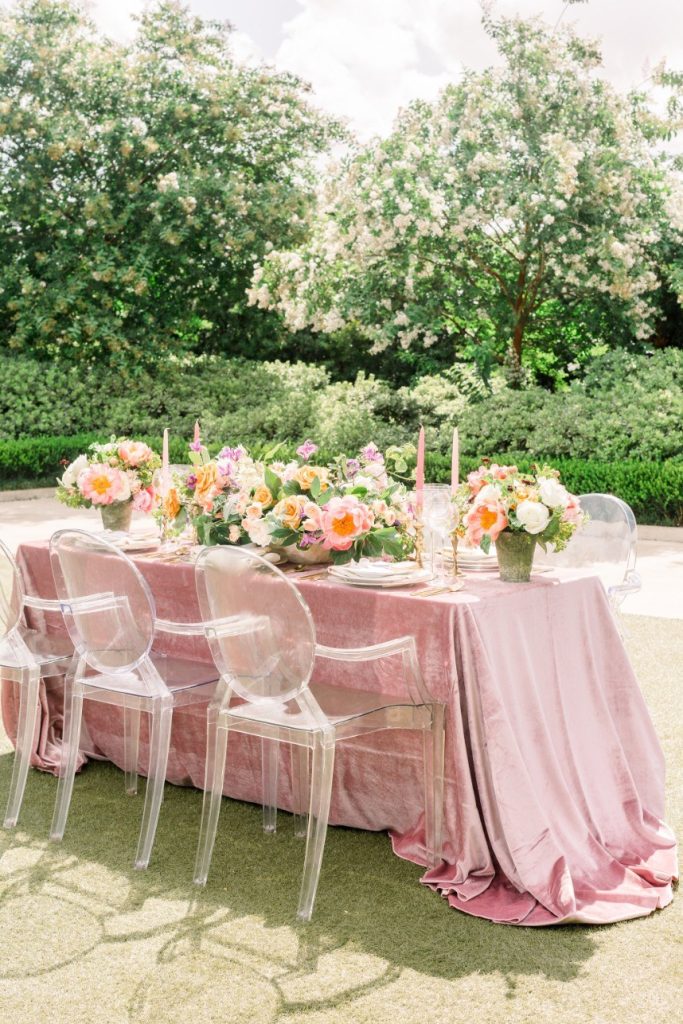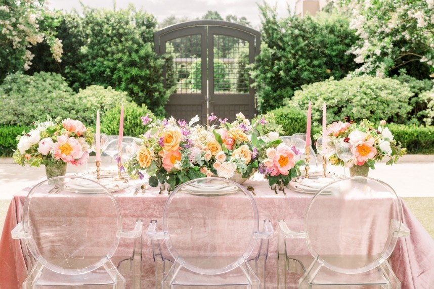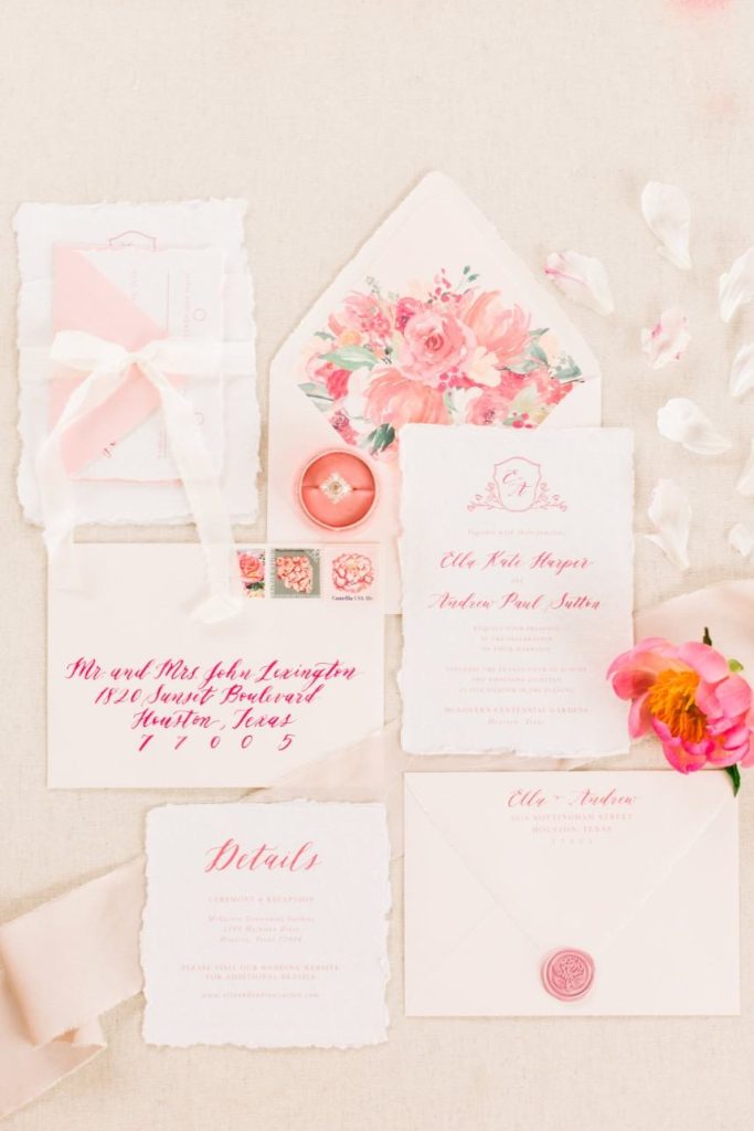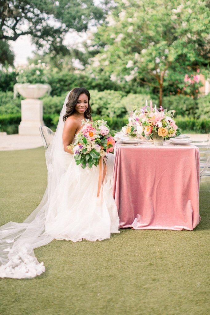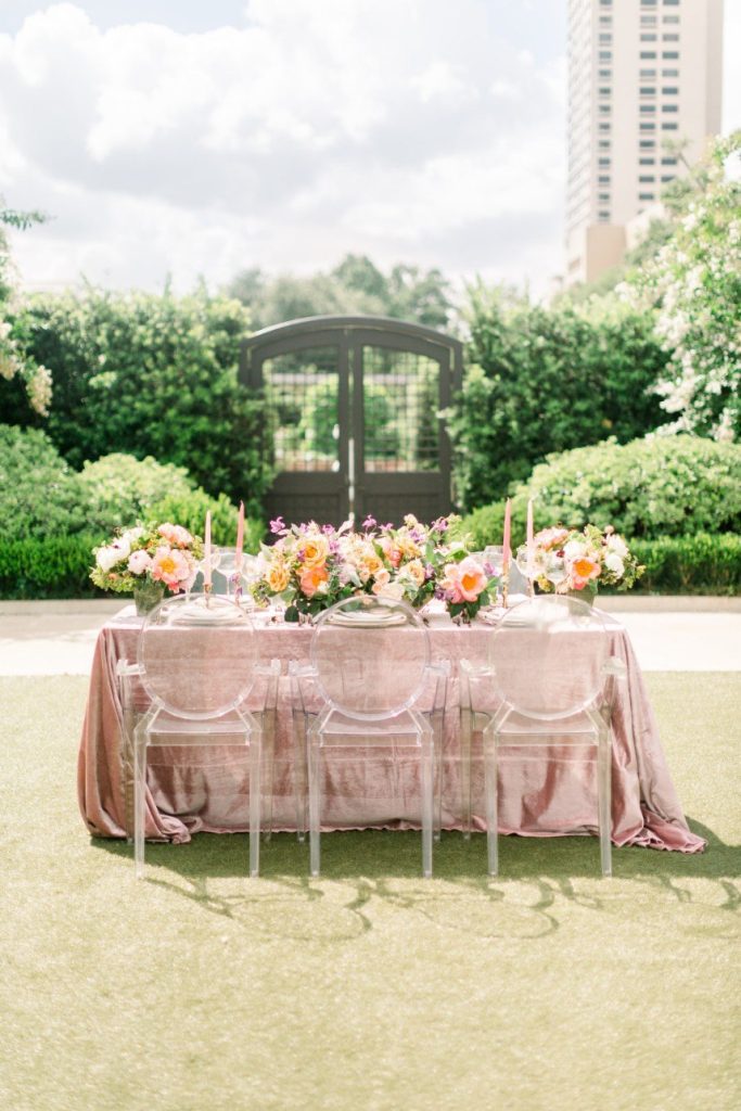 We’re tickled pink to share this darling garden-inspired, feminine styled shoot with you today! From Houston wedding photographer FulleyLove Photo and a dream team of vendors, this wedding inspiration draws on the natural beauty of the urban garden setting while featuring contemporary romantic touches. Perfect for a bride who’s not afraid to embrace her feminine side, this gorgeous scene includes all shades of pink, from the mauve velvet linens to the more whimsical, bright and colorful bouquets by Lanson B. Jones Floral with roses and peonies galore! Shelby Elizabeth Cakes outdid herself on the three-tiered marble cake in her signature gravity-defying style. It’s whimsical and jaw-dropping and everything a modern bride would love! A stunning invitation suite by Dreams and Nostalgia featuring unique hot pink calligraphy and a floral envelope liner helps tie everything together and truly evoke the theme of the day: exactly what an invitation suite is meant to do! One thing’s for sure, this wedding inspo is so pretty in pink, and we adore everything about it! Cheers!